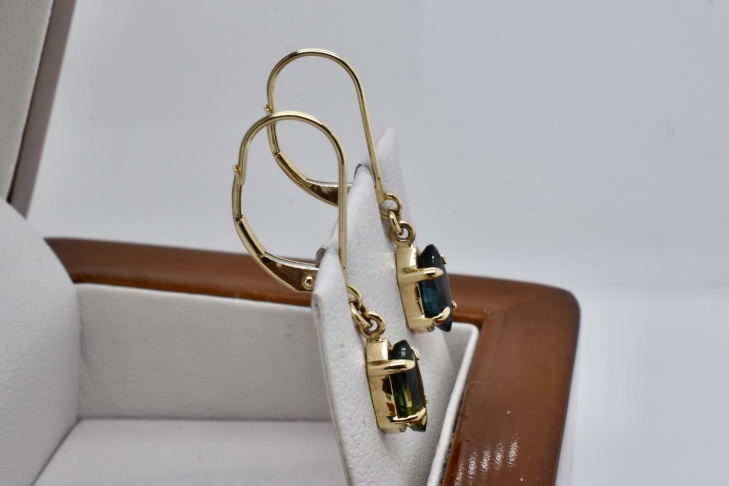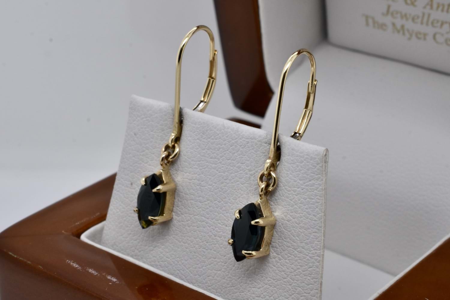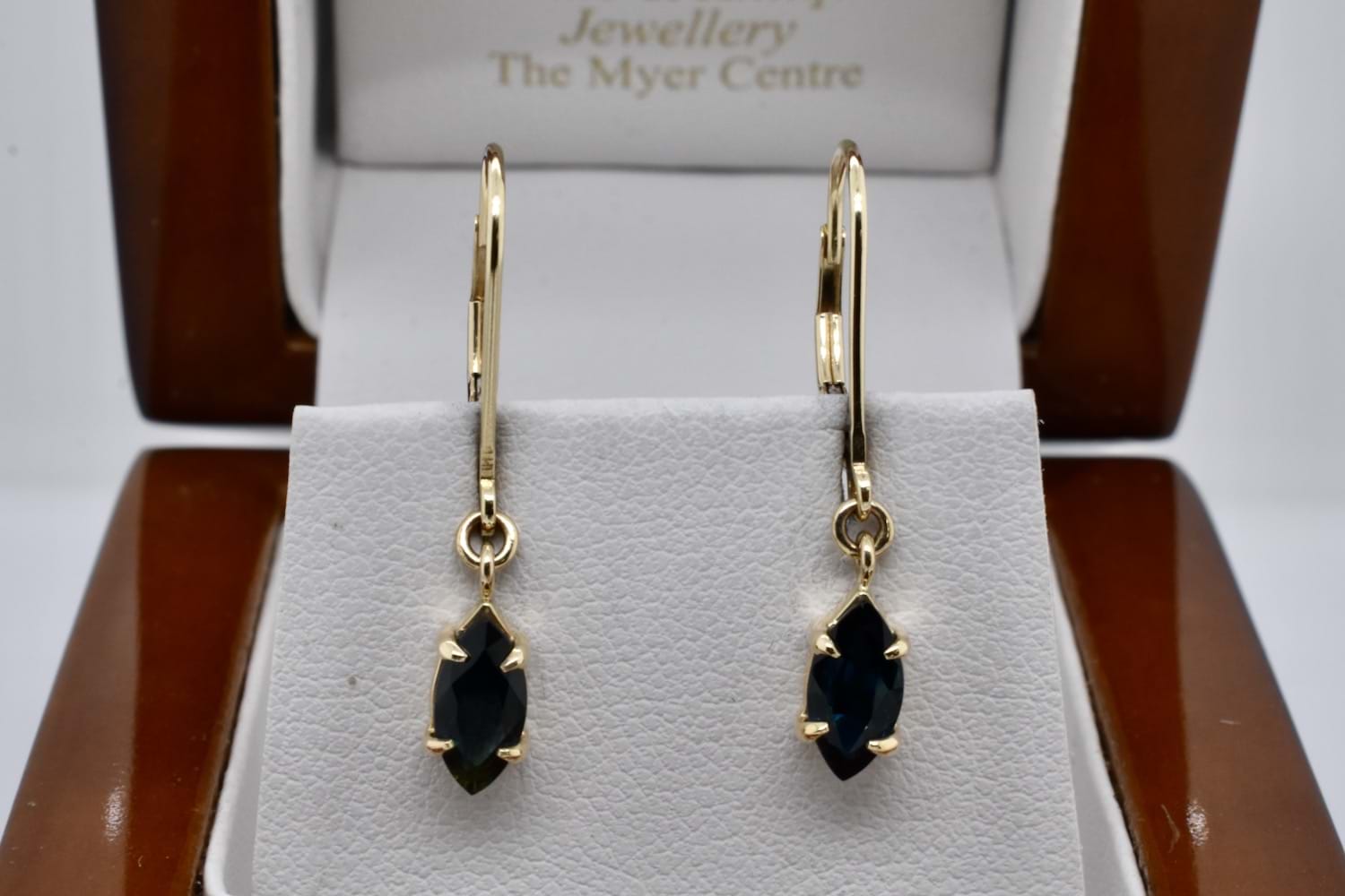 A dainty and striking pair of handmade earrings, crafted in 9ct yellow gold and set with a pair of dark blue sapphires measuring approx. 8 x 5mm, in four claws with euroclip fittings