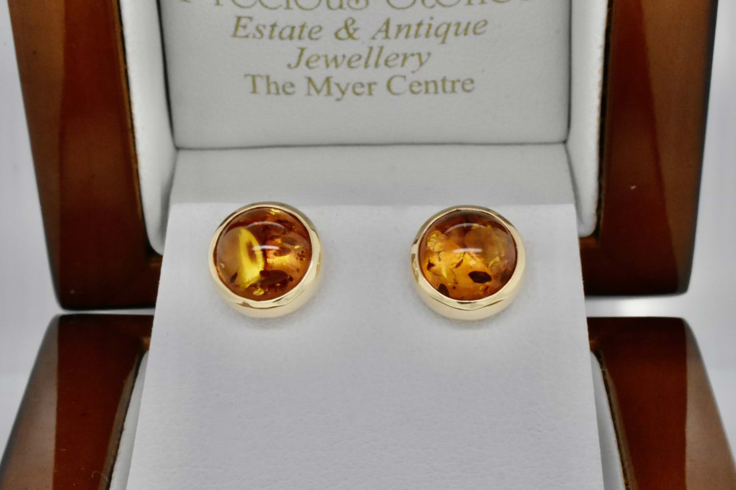 Old school handmade 9ct yellow gold bezel set studs featuring Baltic amber measuring approx. 9.5mm round.