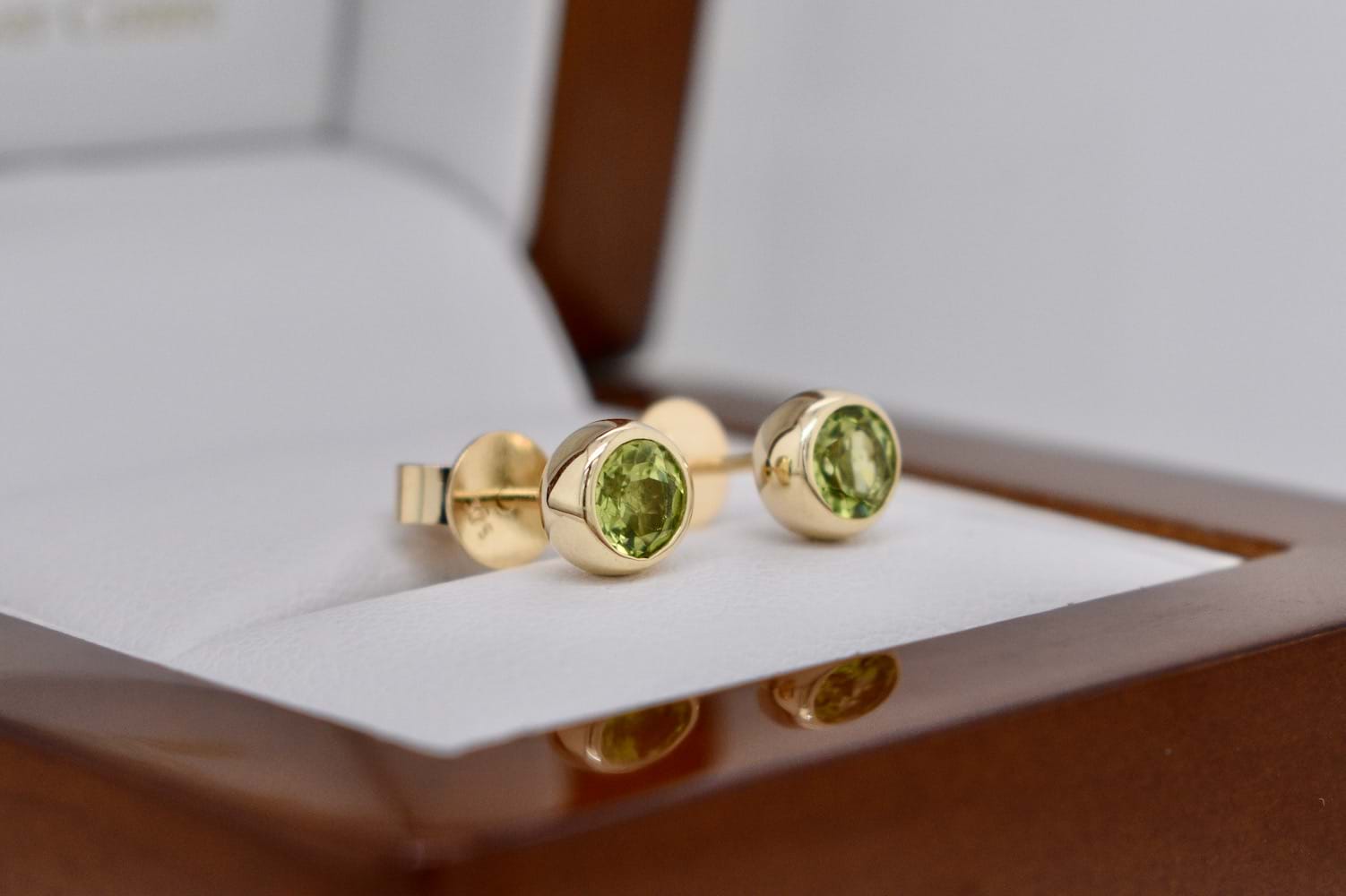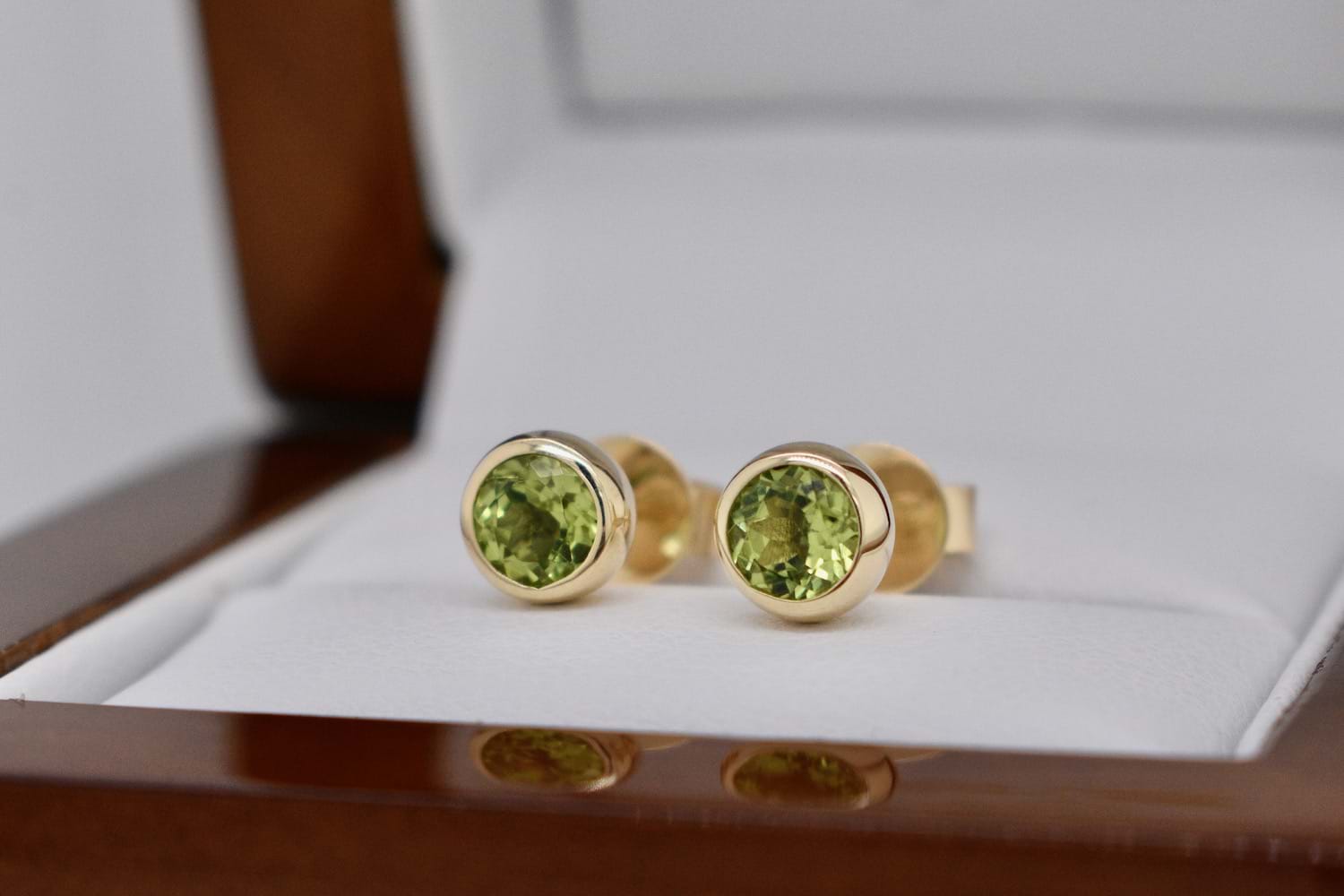 Striking lime green peridot measuring approx 5mm round set into handmade 9ct yellow gold bezel settings with stud post and butterfly fittings