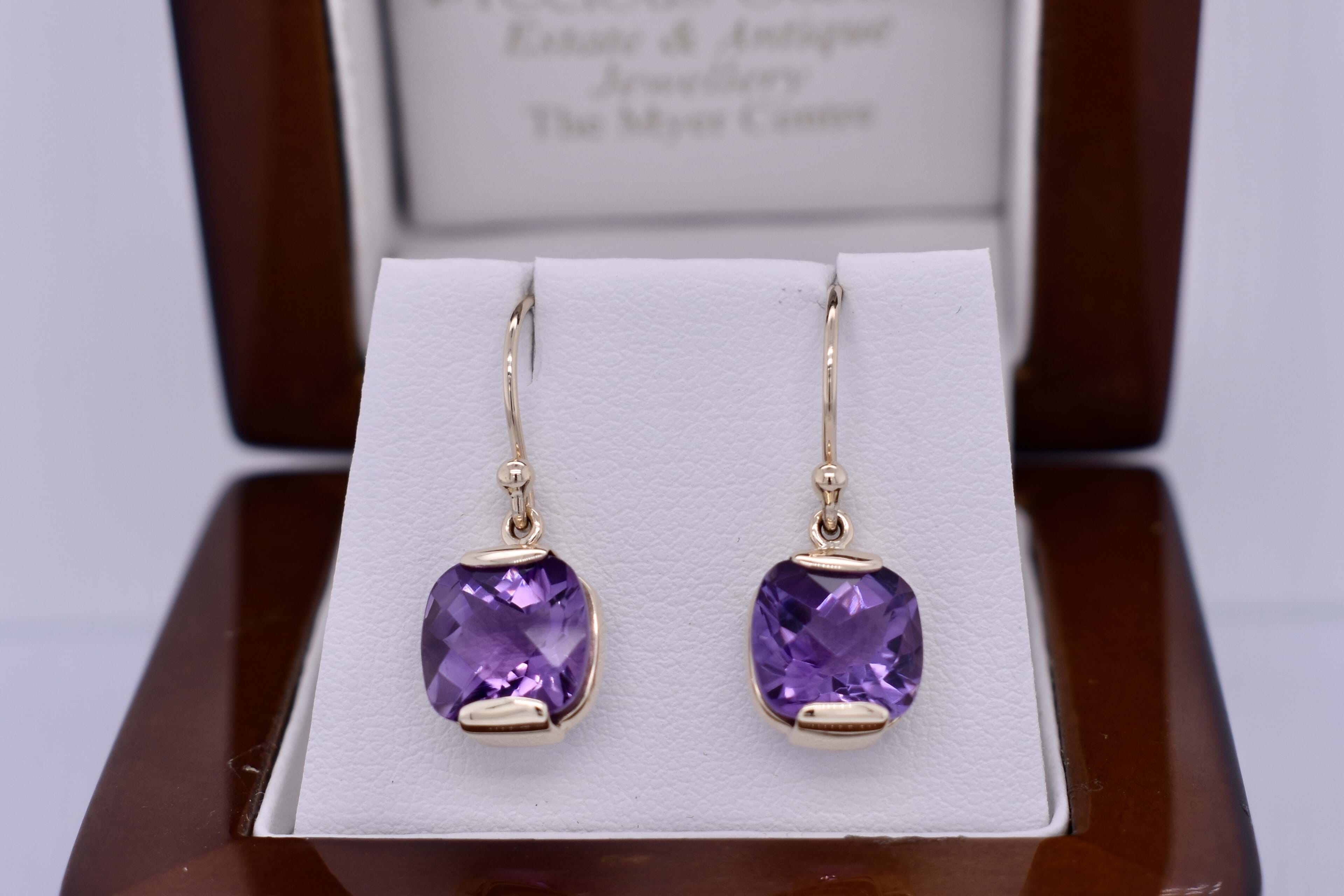 Gorgeous cushion shaped amethyst drops, measuring 8.96mm, semi bezel set In 9ct yellow gold handmade fittings. Completed with shepherd hook fittings.