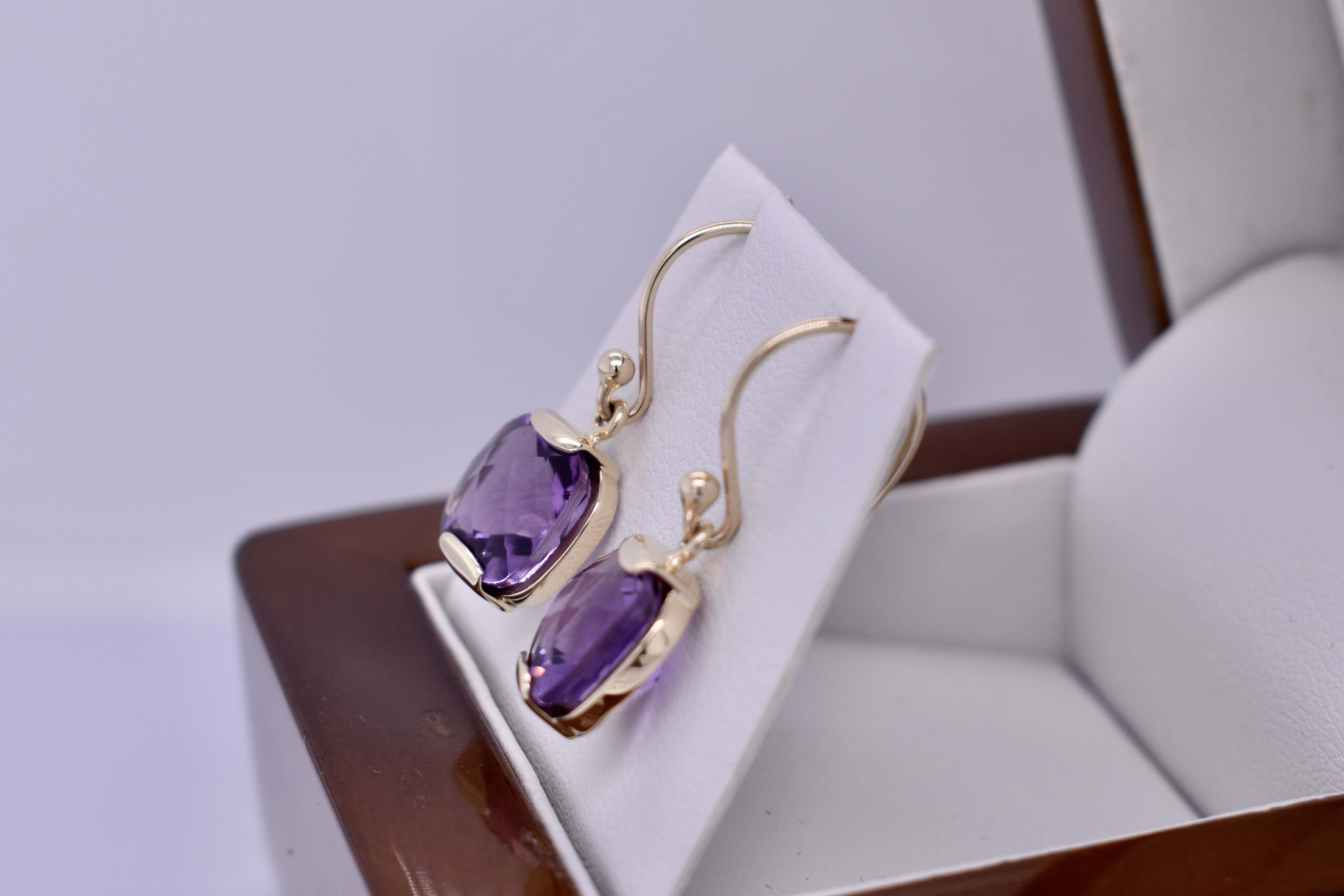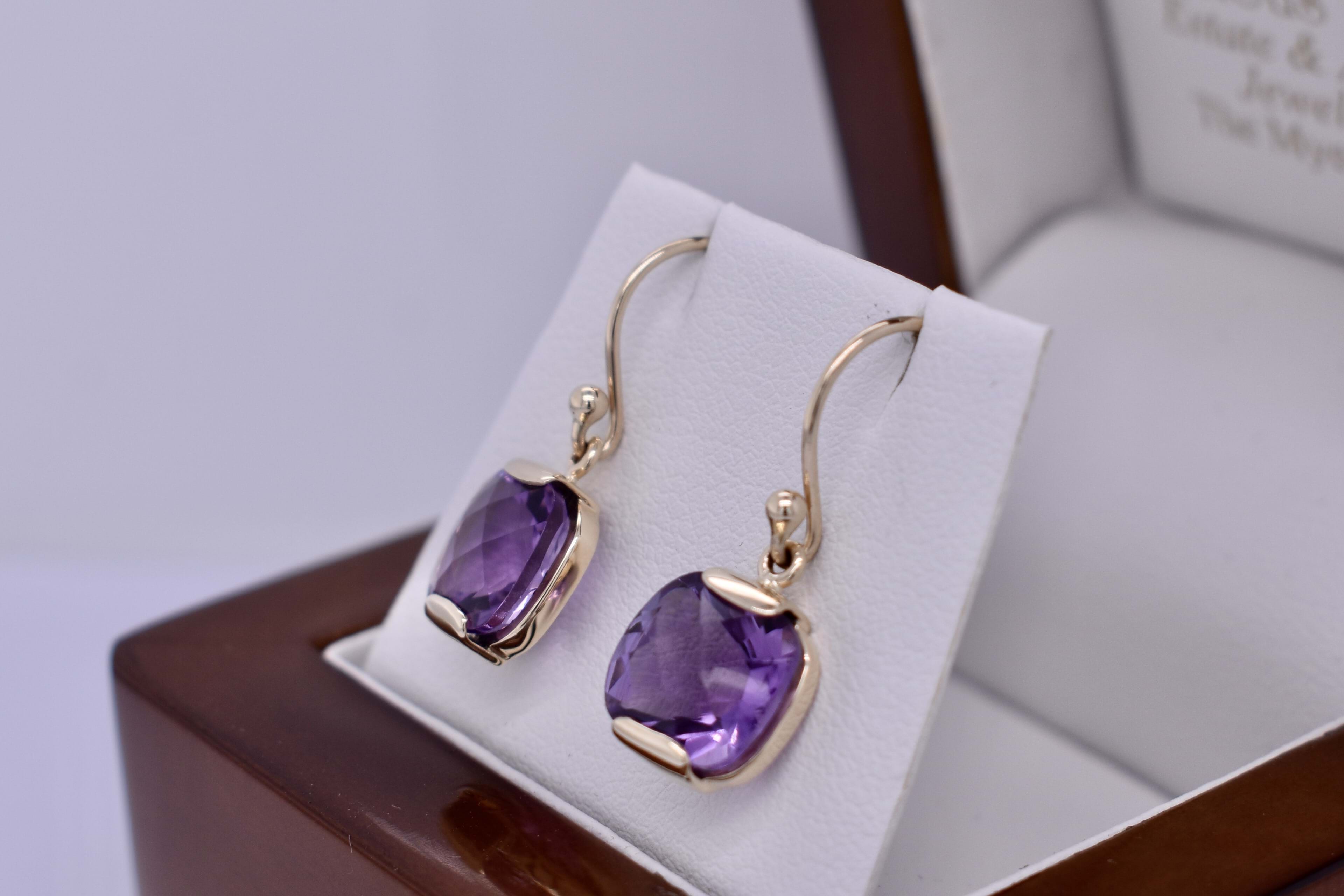 SOLD Handmade 9ct Yellow Gold Cushion Amethyst Semi Bezel Drops