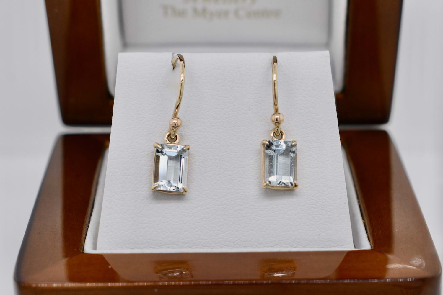 Pretty and elegant emerald cut aquamarine measuring approx. 7x5mm set into handmade 9ct yellow gold four claw settings and suspended from shepherd hook fittings
