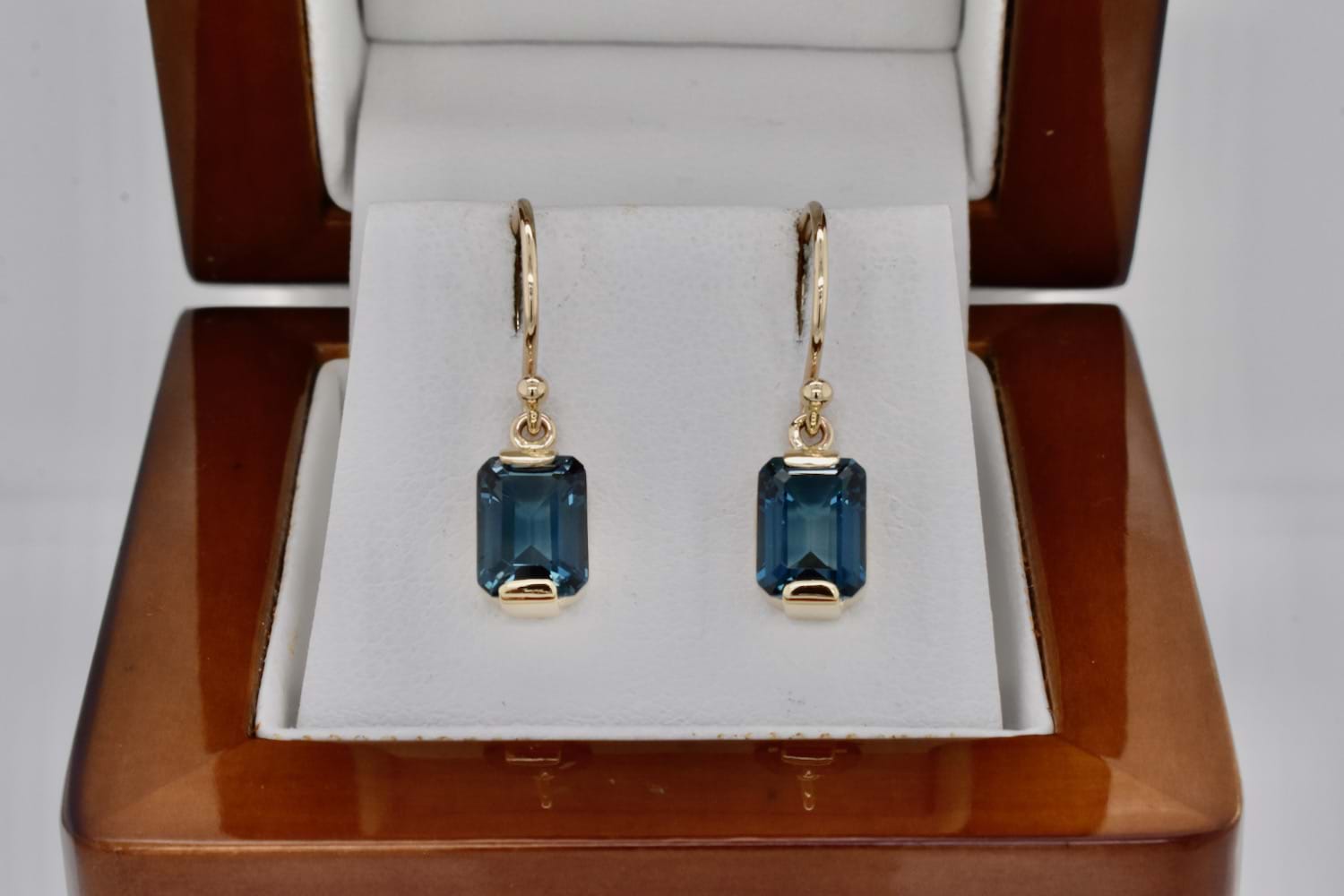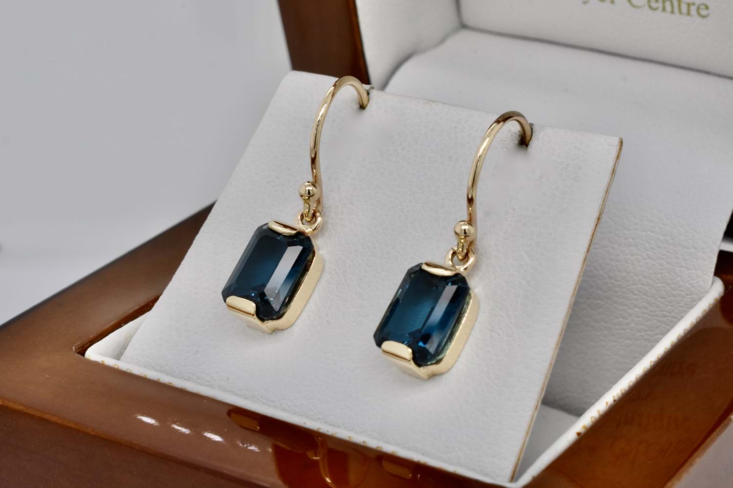 HOLD Handmade 9ct Yellow Gold Emerald Cut London Blue Topaz Earrings
