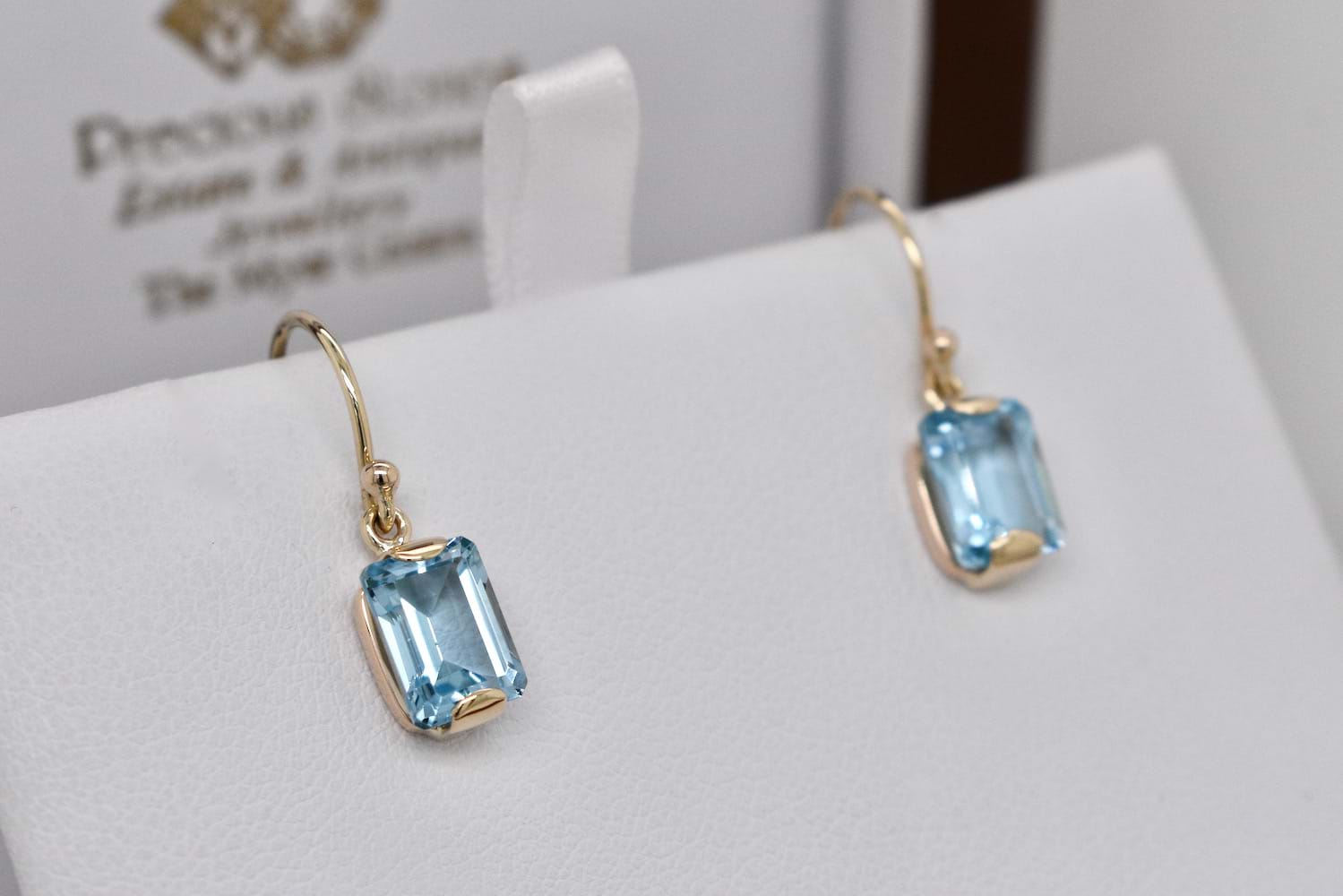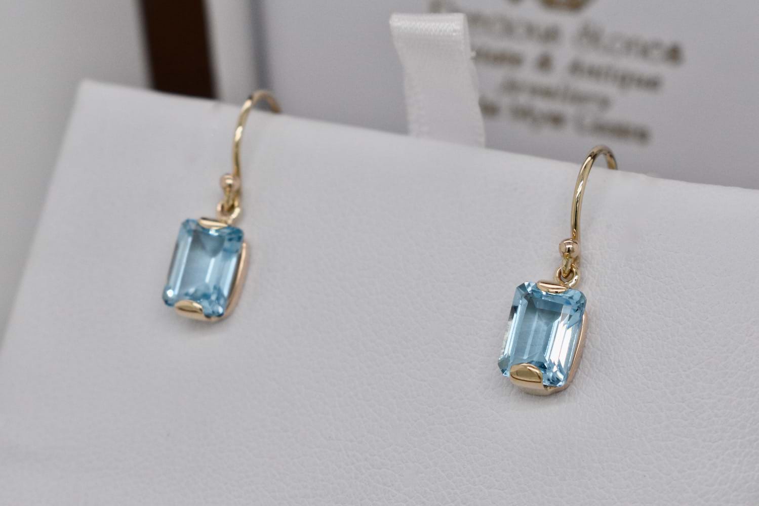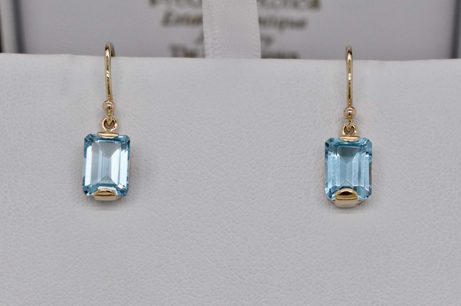 SOLD Handmade 9ct Yellow Gold Emerald Cut Sky Blue Topaz Drop Earrings