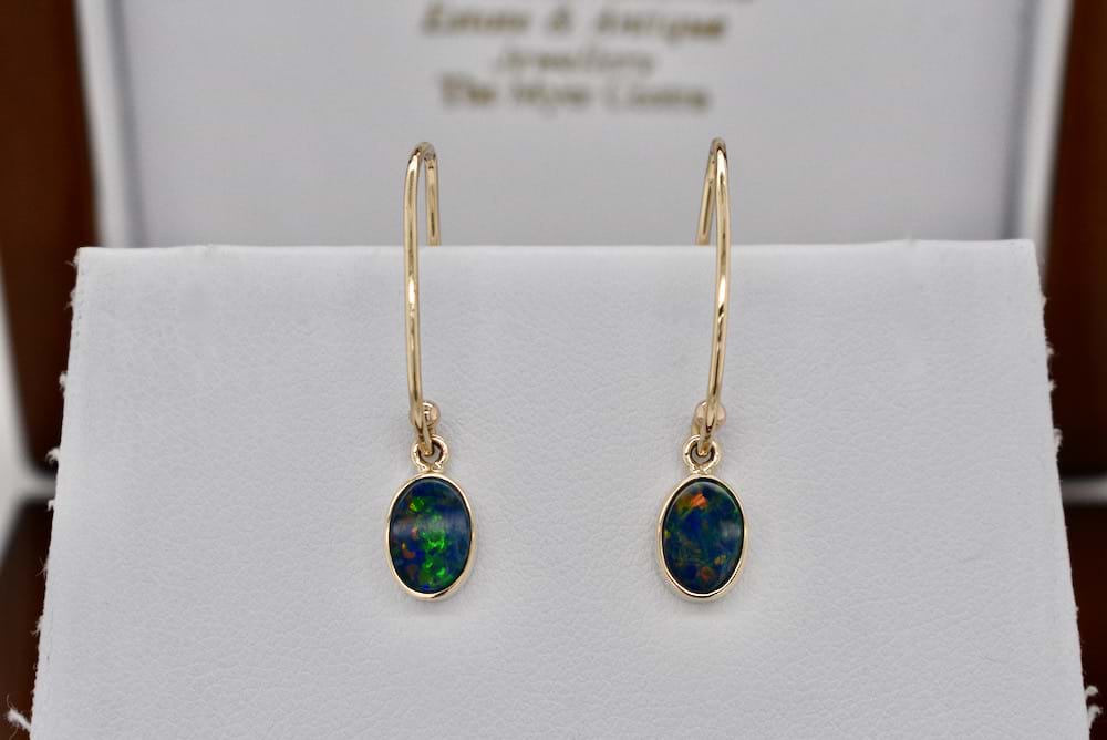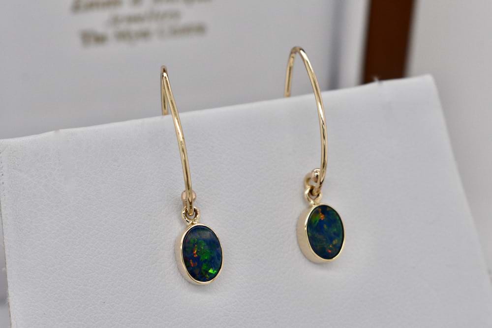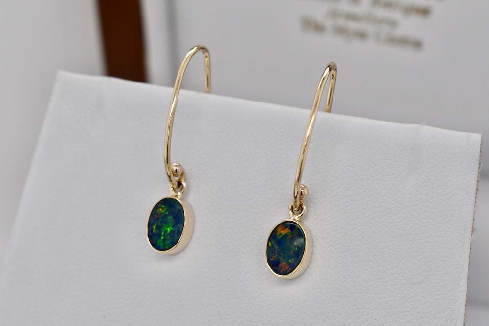 Handmade 9ct yellow gold drop earrings featuring oval opal doublets measuring 8x6mm and displaying orange, yellow and green flashes and suspended from long shepherd hook fittings. Our doublets consist of a Coober Pedy opal top and a boulder opal base