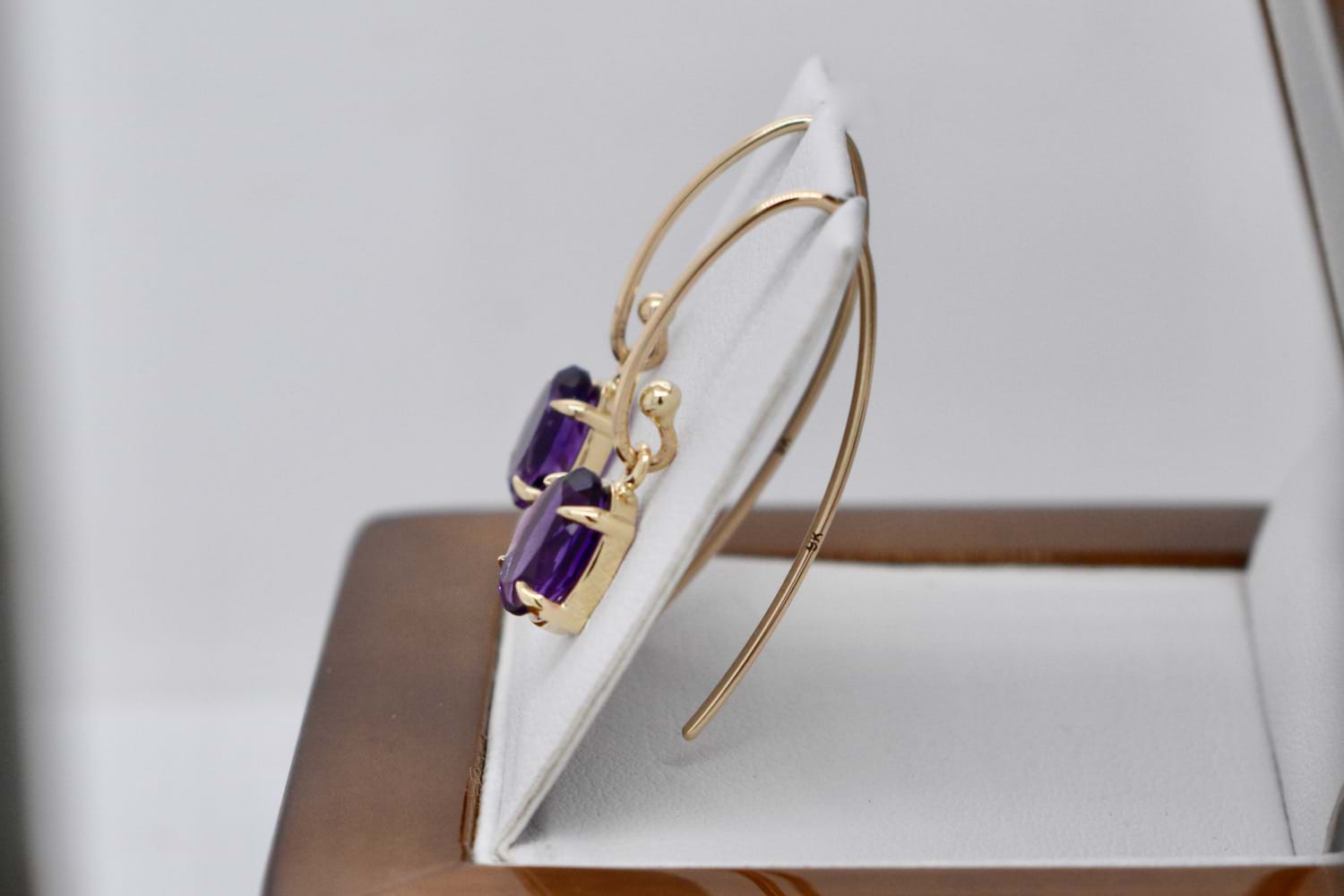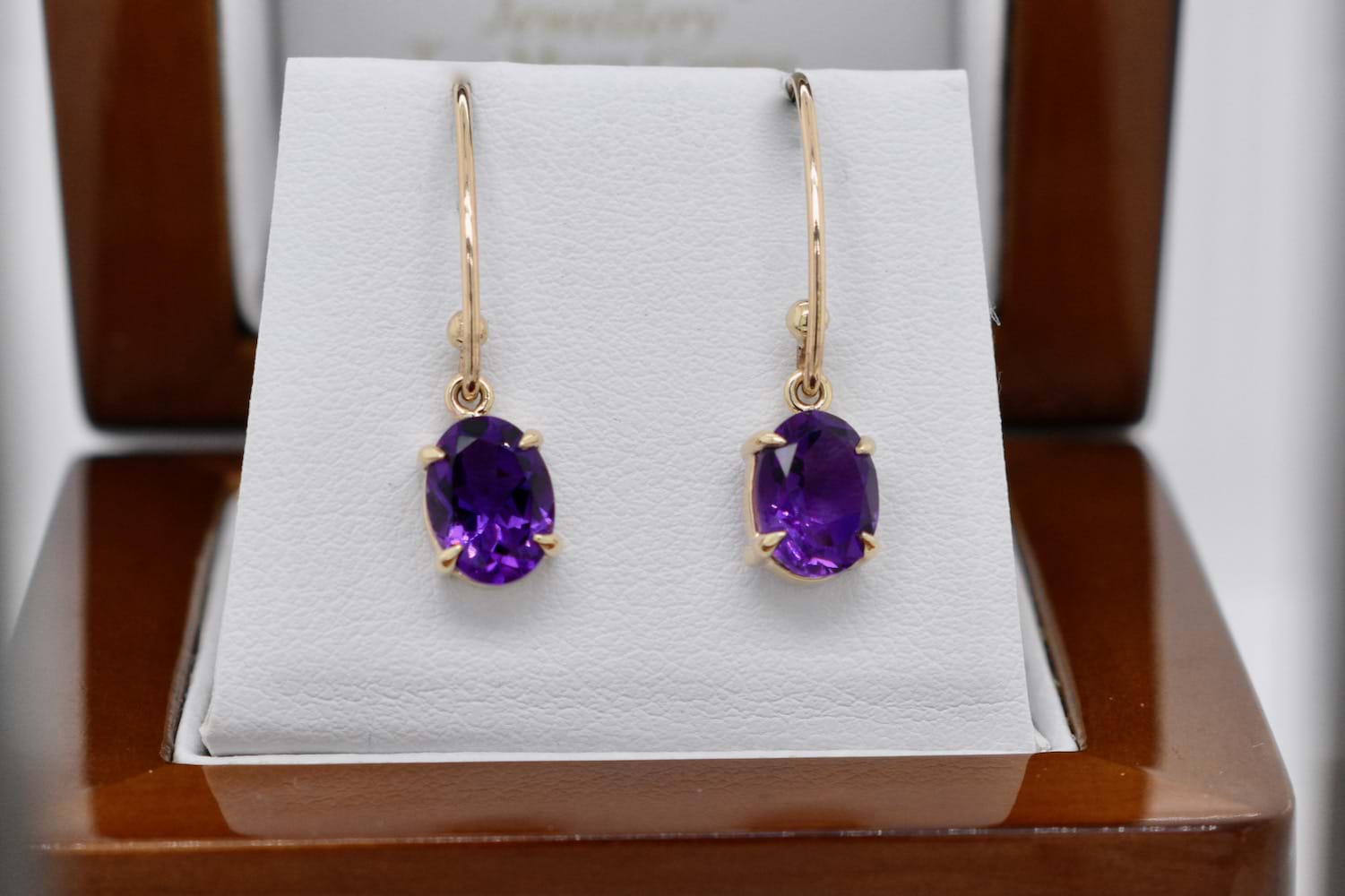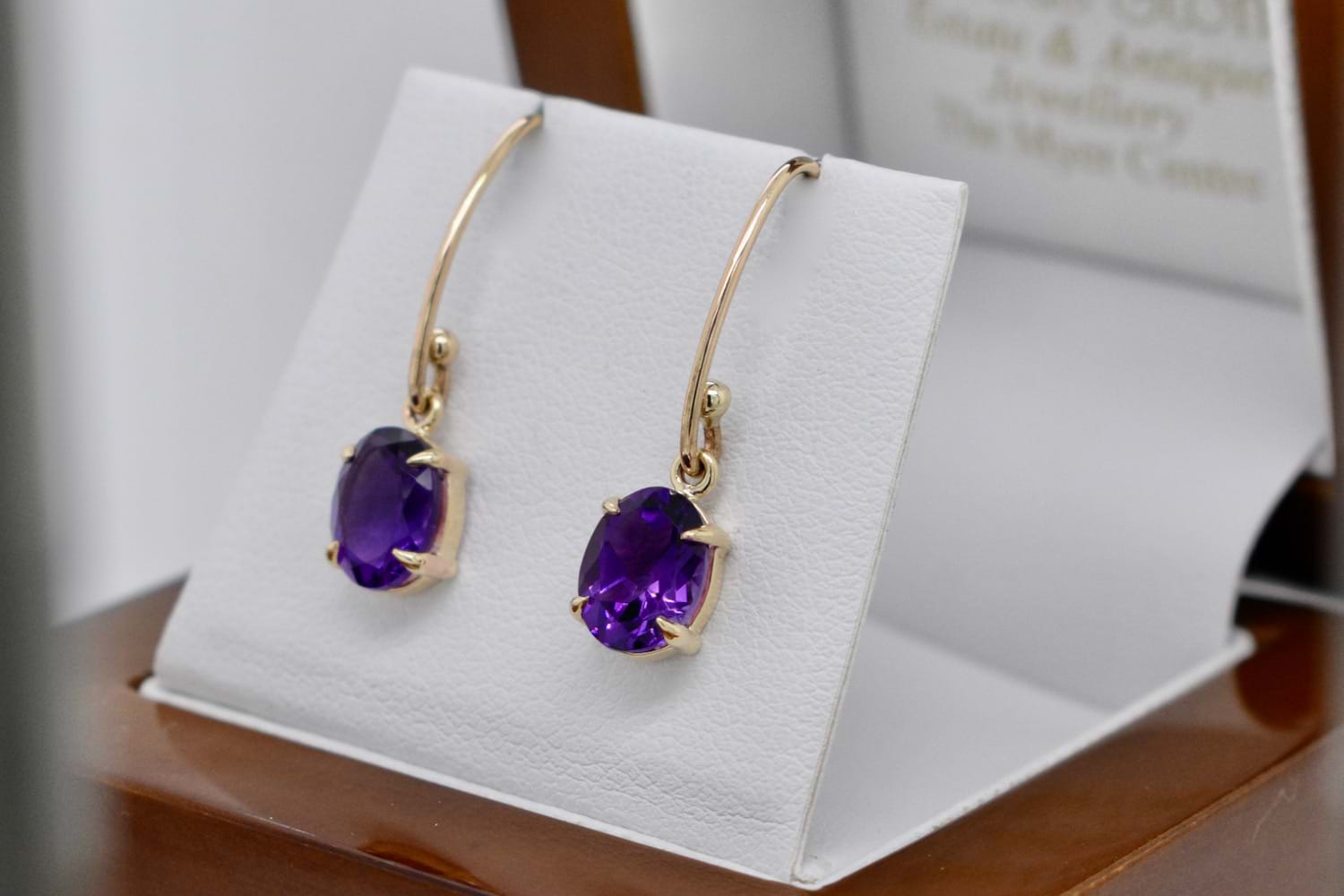 Stunning pair of oval purple amethysts measuring approx. 8x6mm set into handmade 9ct yellow gold four claw settings and suspended from long V shape shepherd hook fittings