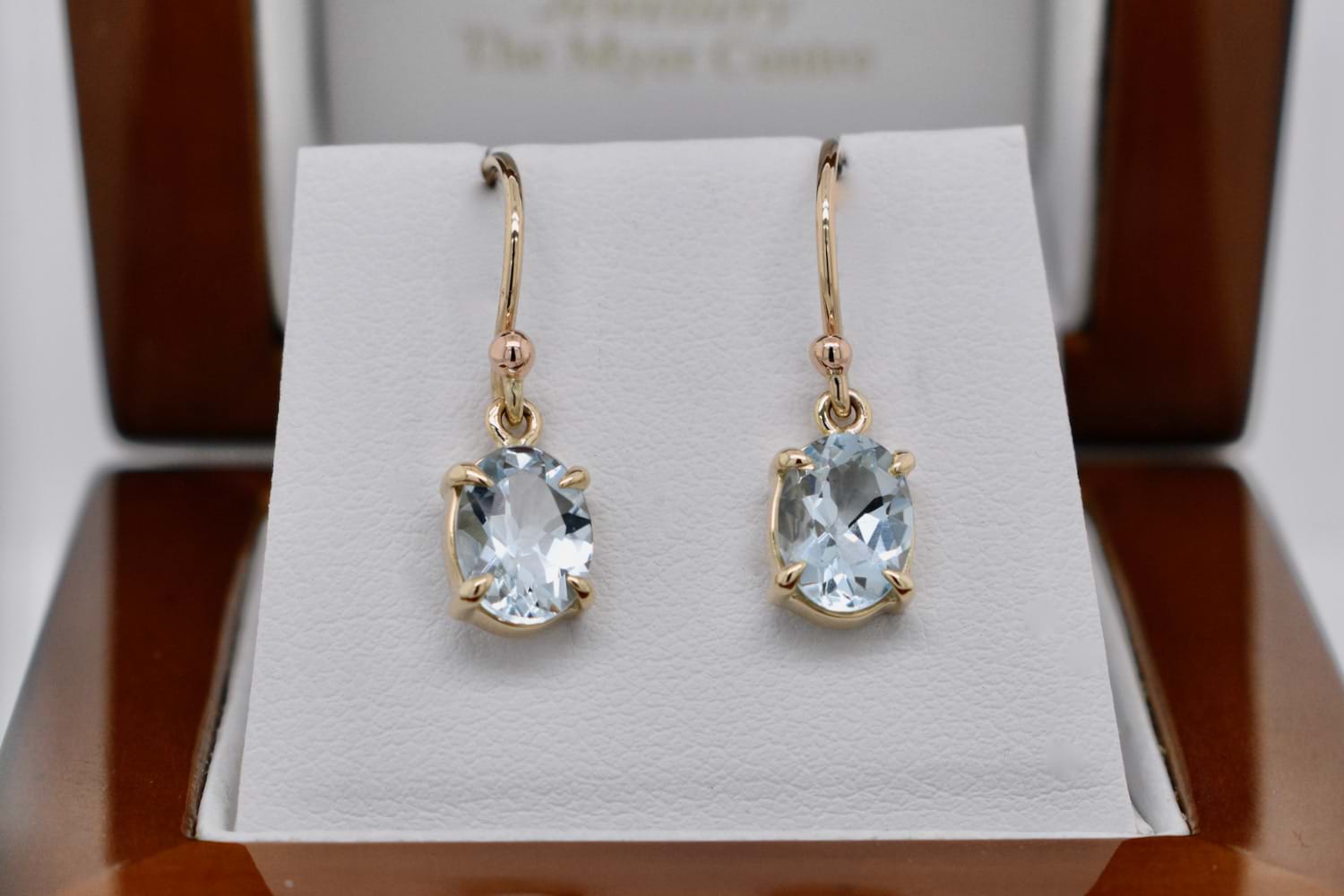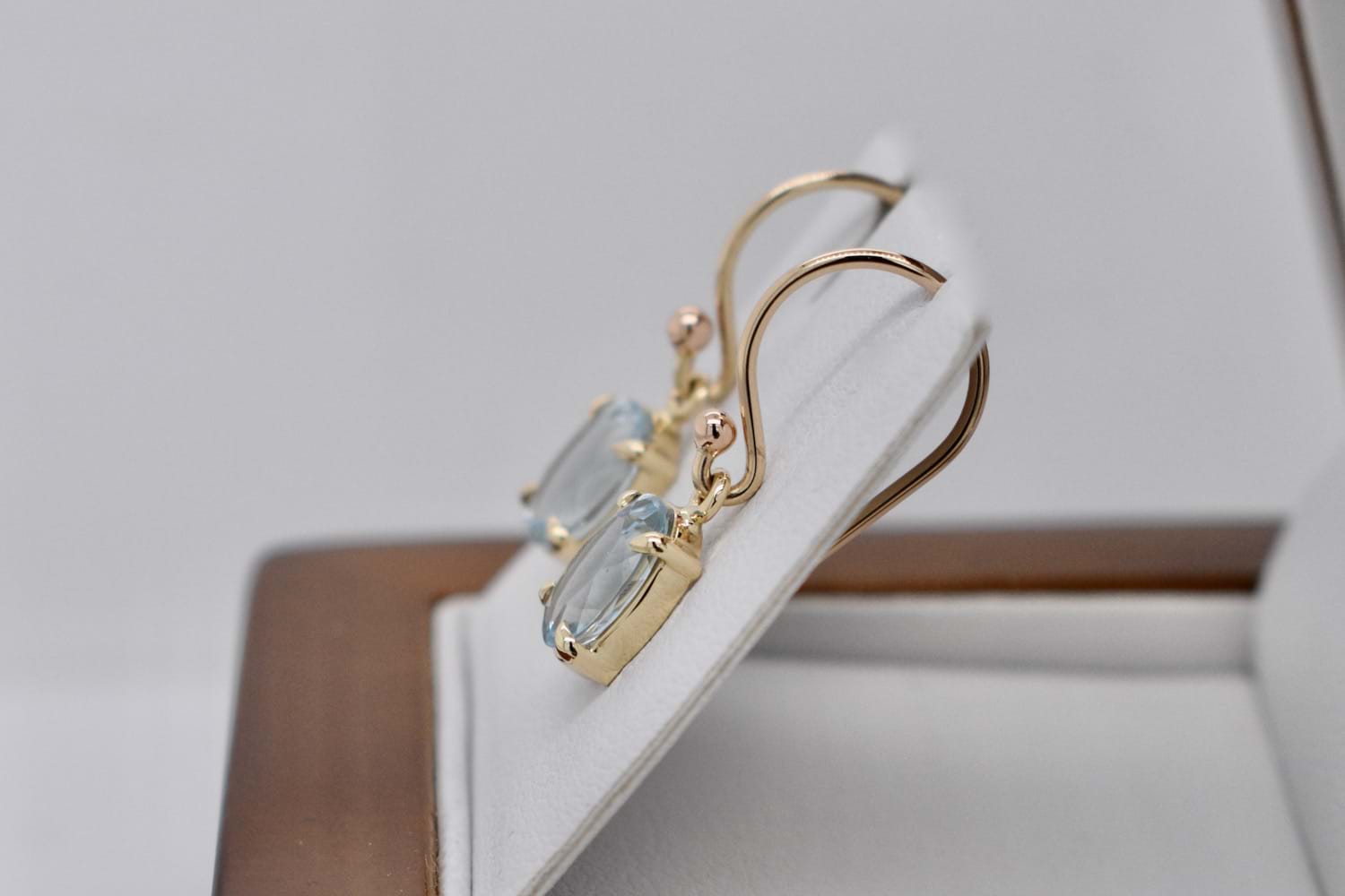 Lovely pair of oval aquamarines measuring approx. 8x6mm set into handmade 9ct yellow gold four claw settings and suspended from shepherd hook fittings