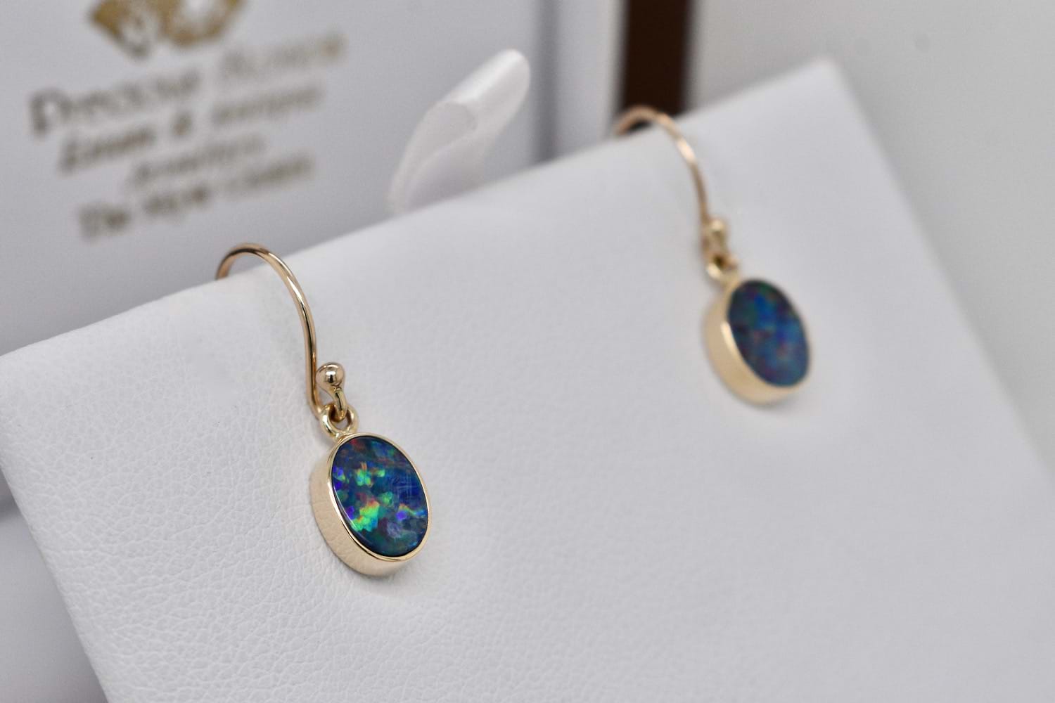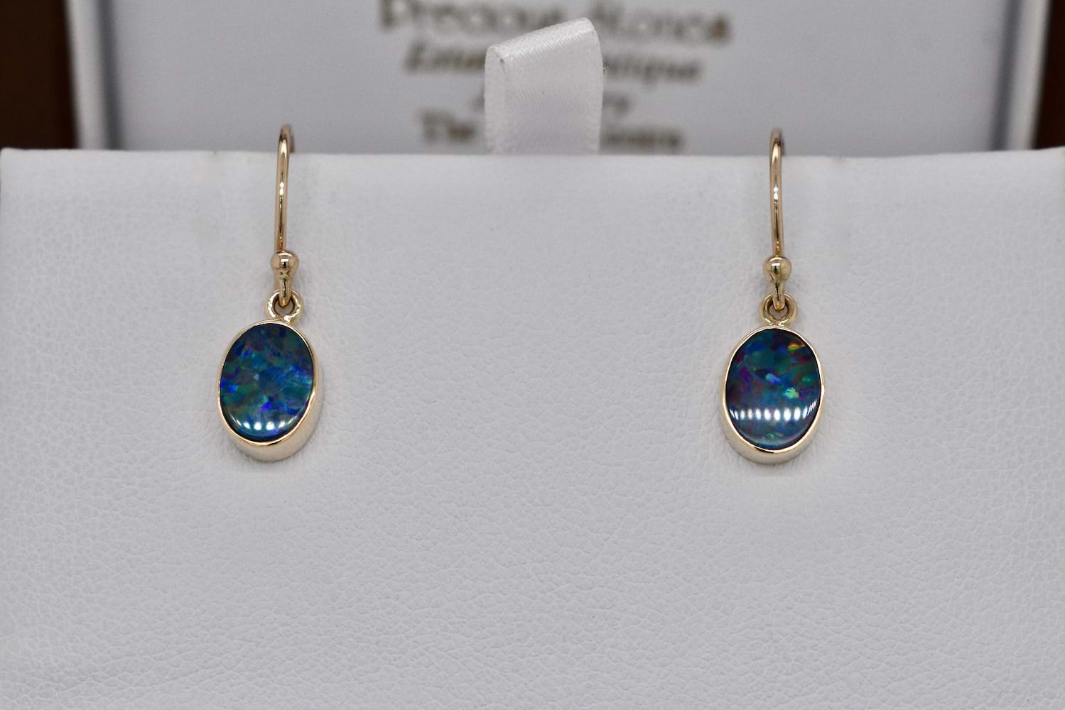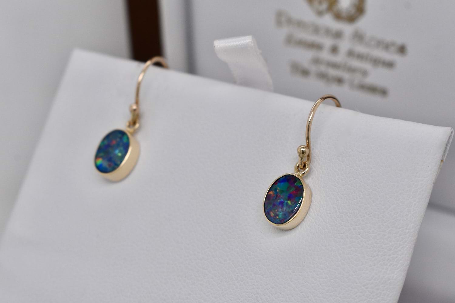 Simple and pretty oval opal doublets with red, green and blue flashes measuring approx. 8.5x5.5mm in handmade 9ct yellow gold bezel settings and suspended from shepherd hook fittings. Our opal doublets consist of an opal crystal top and a boulder opal base, this pair displays red, yellow, green and blue flashes