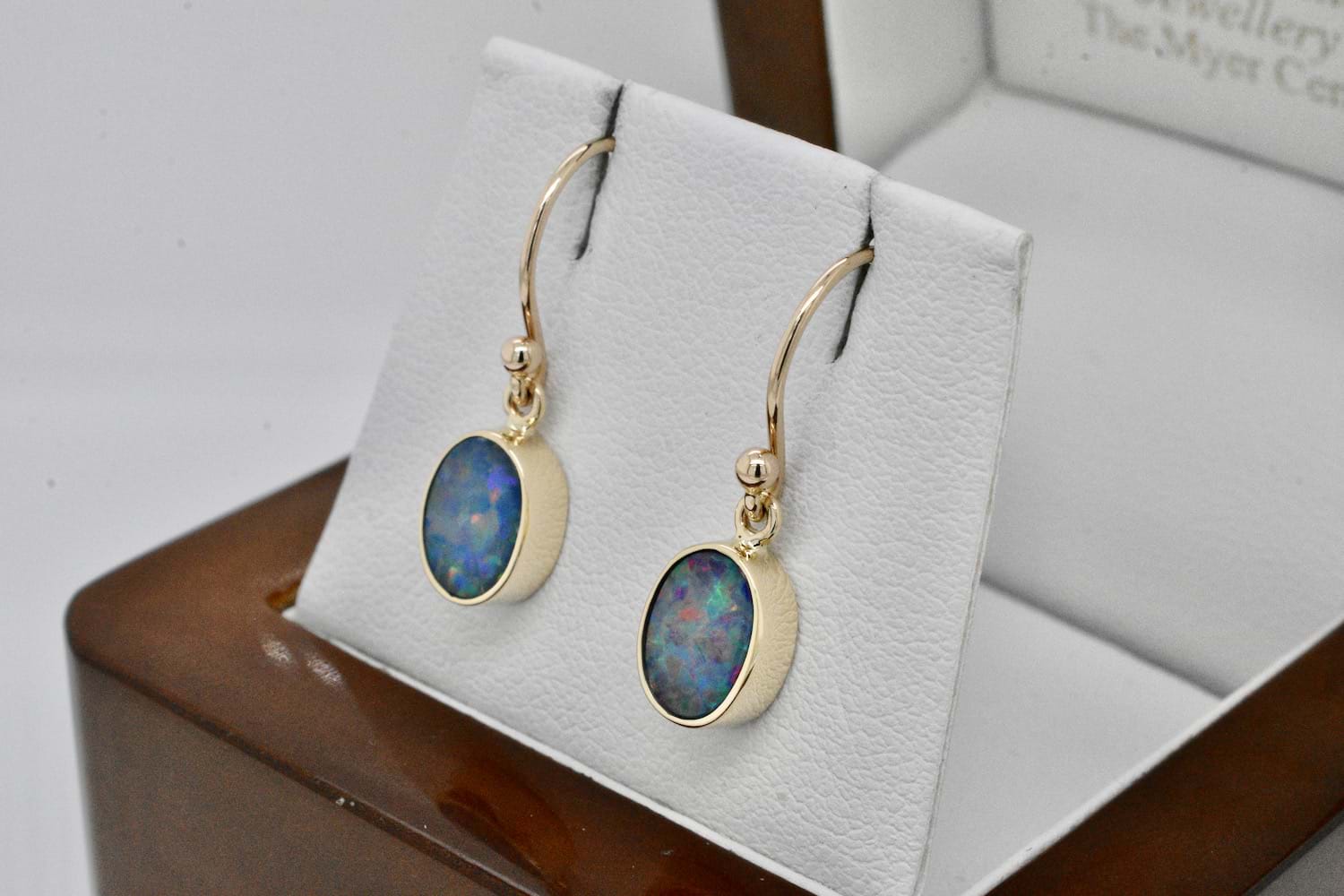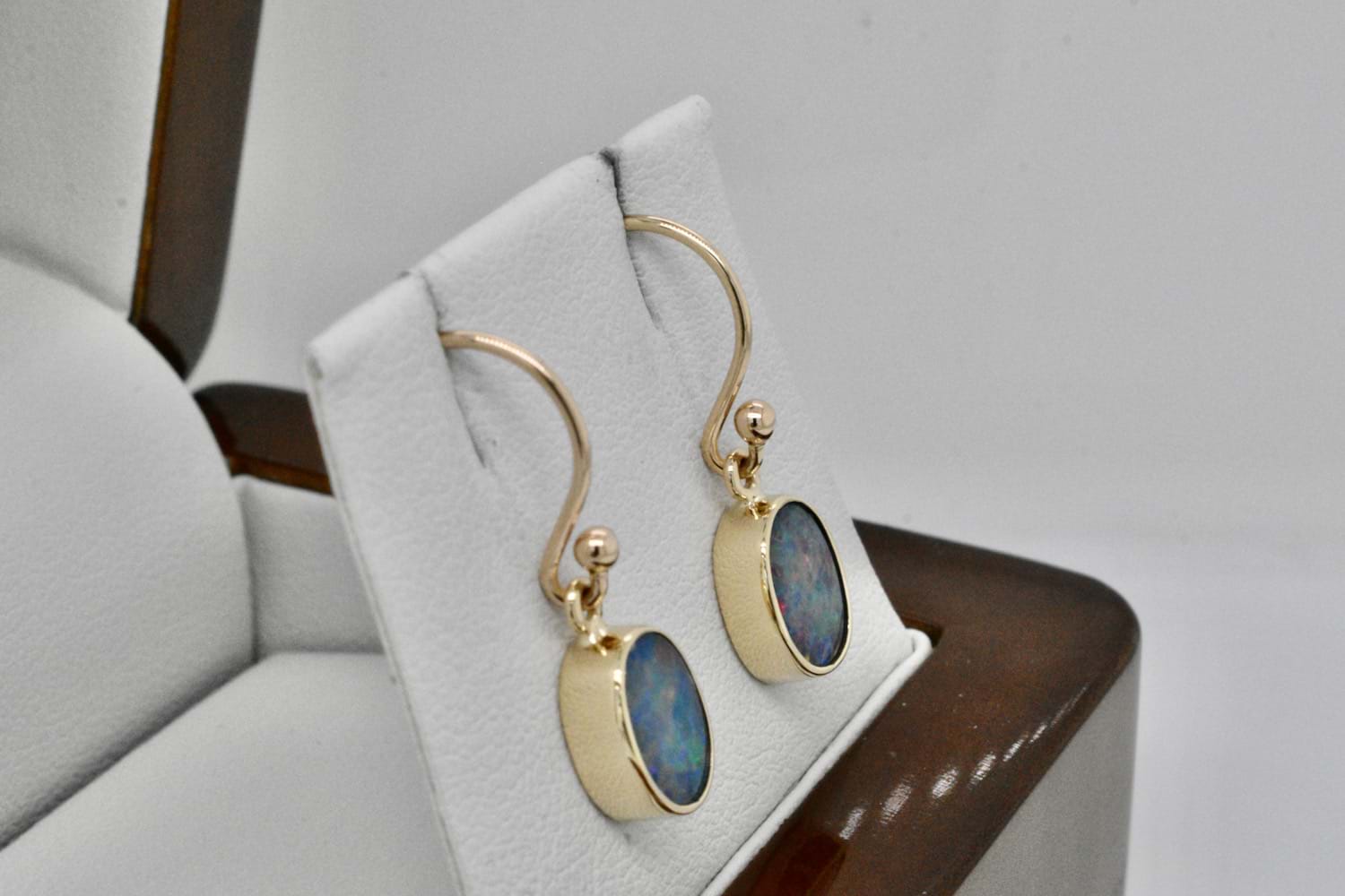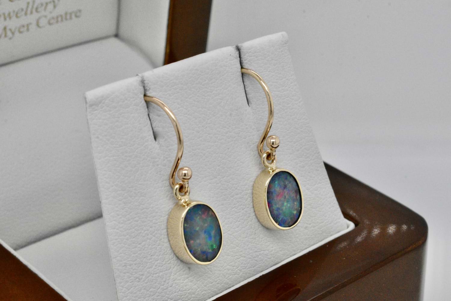 Handmade 9ct yellow gold drop earrings featuring oval opal doublets measuring approx. 9 x7mm and displaying red, orange, yellow and green flashes, suspended from shepherd hook fittings. Our doublets consist of a Coober Pedy opal top and a boulder opal base