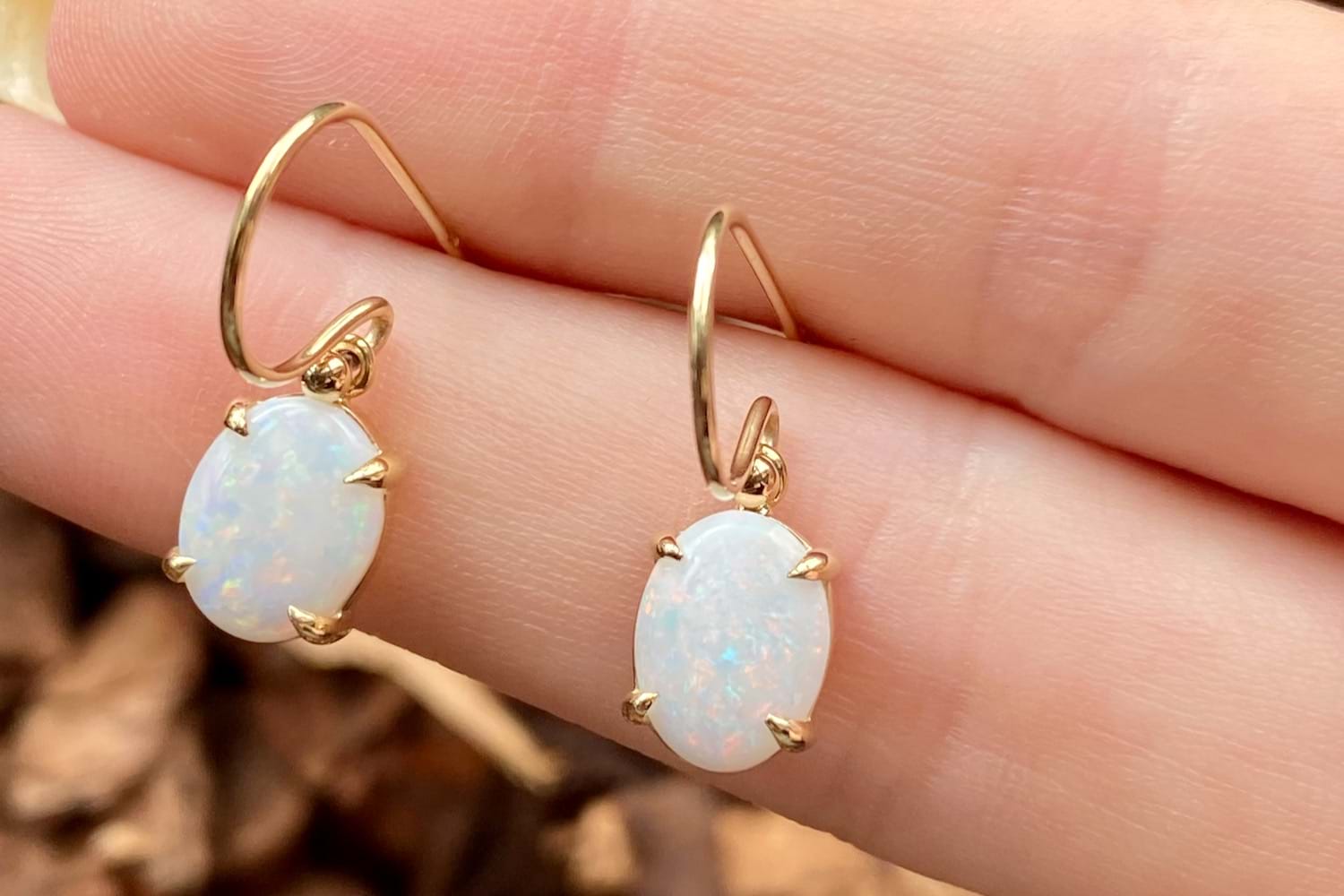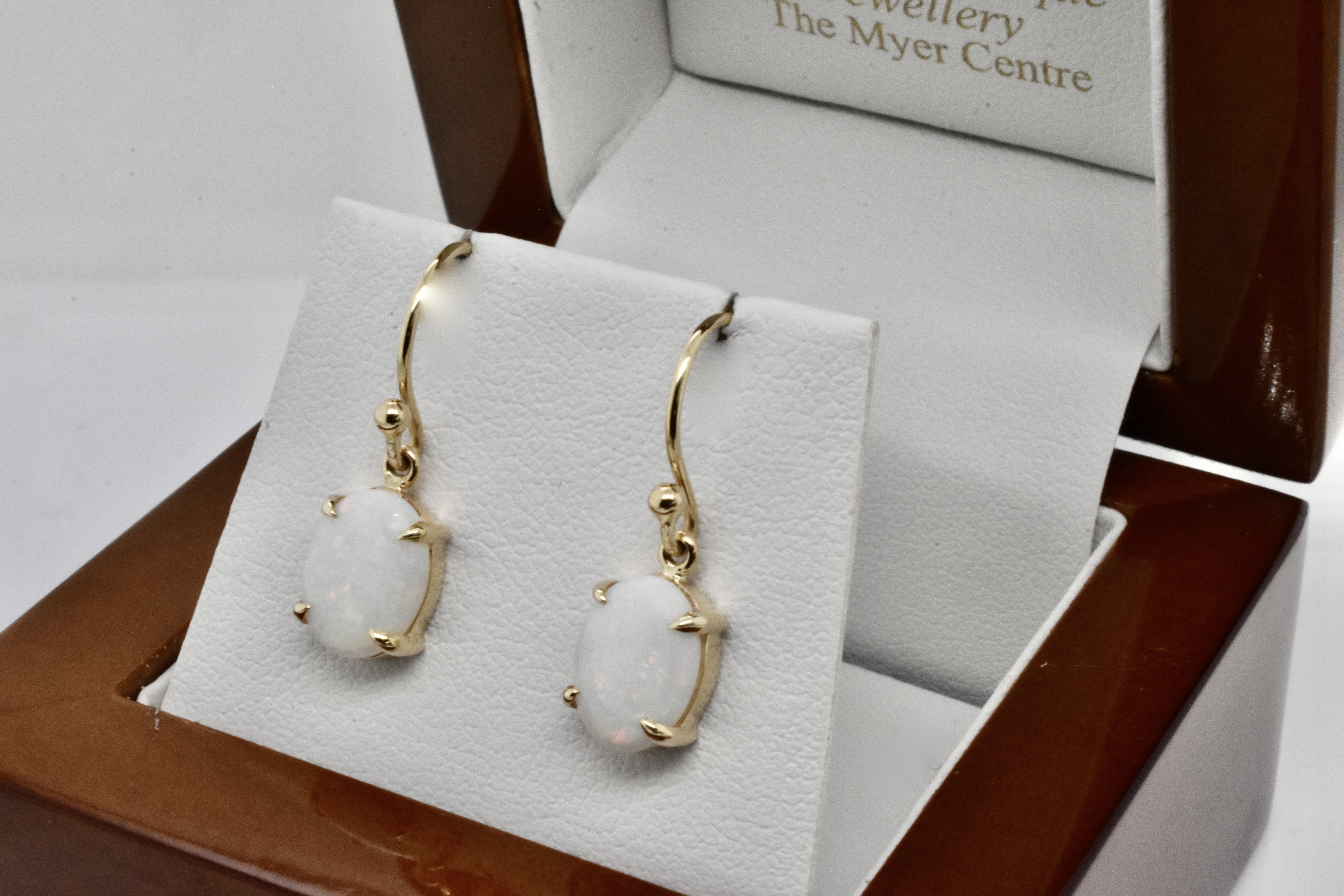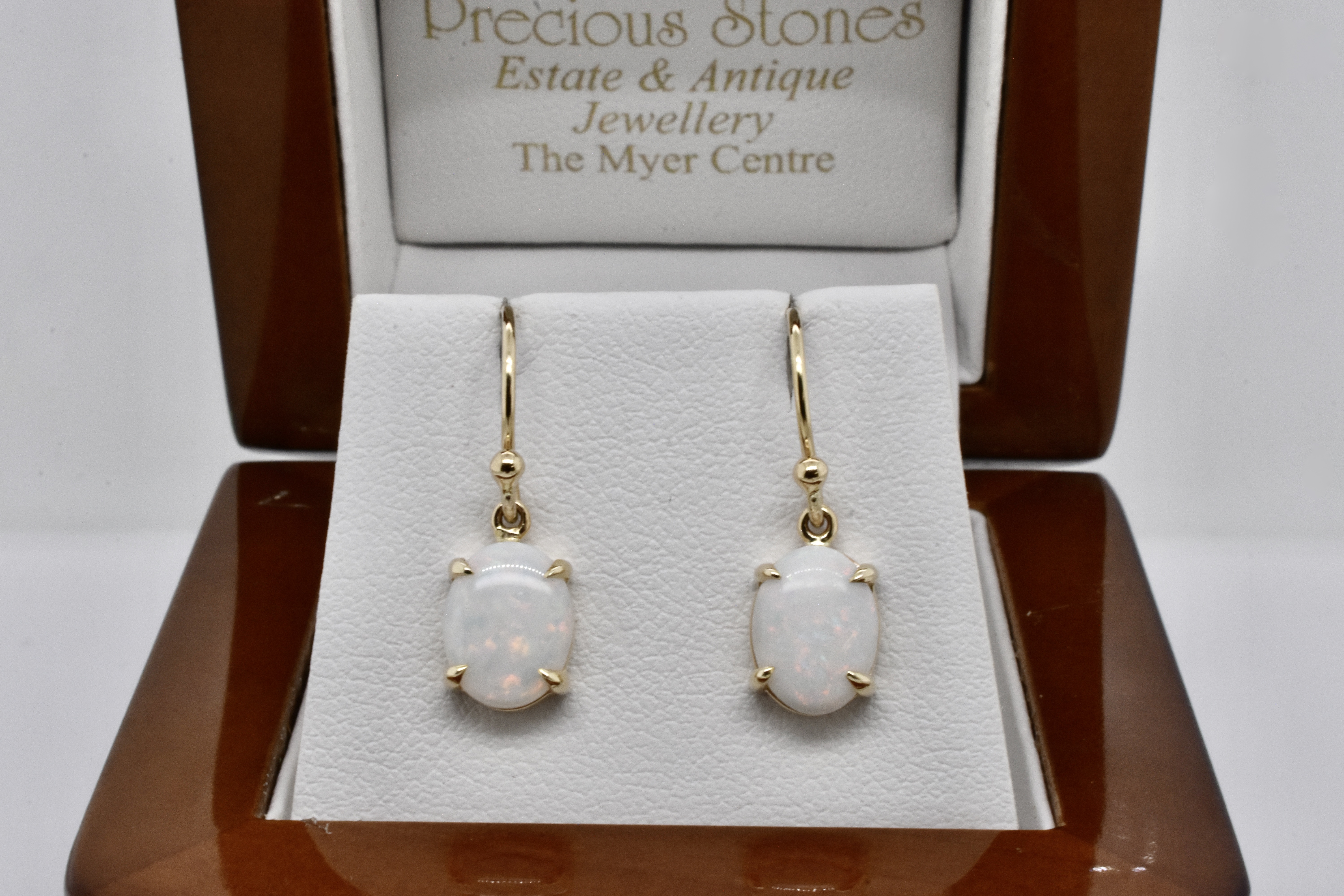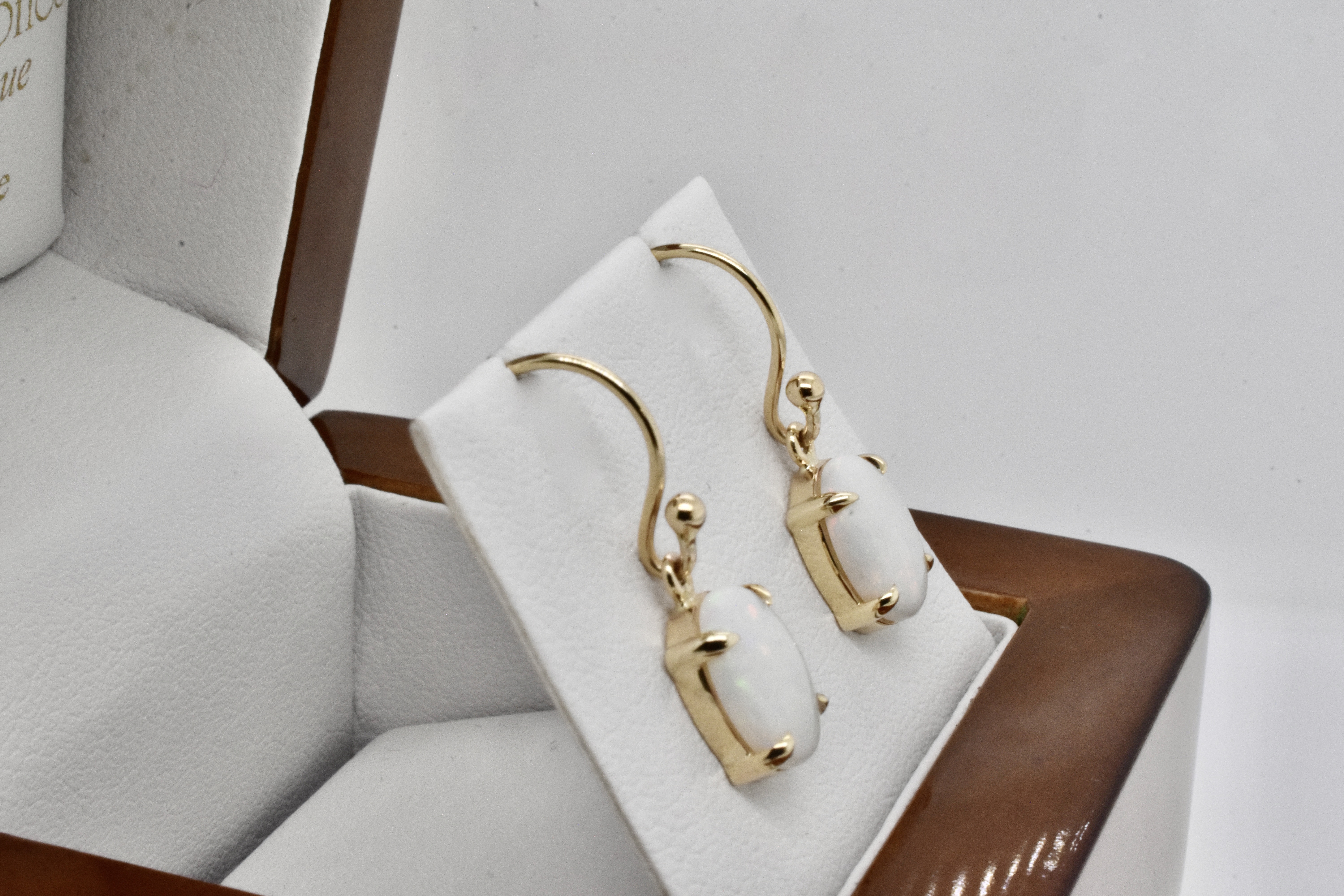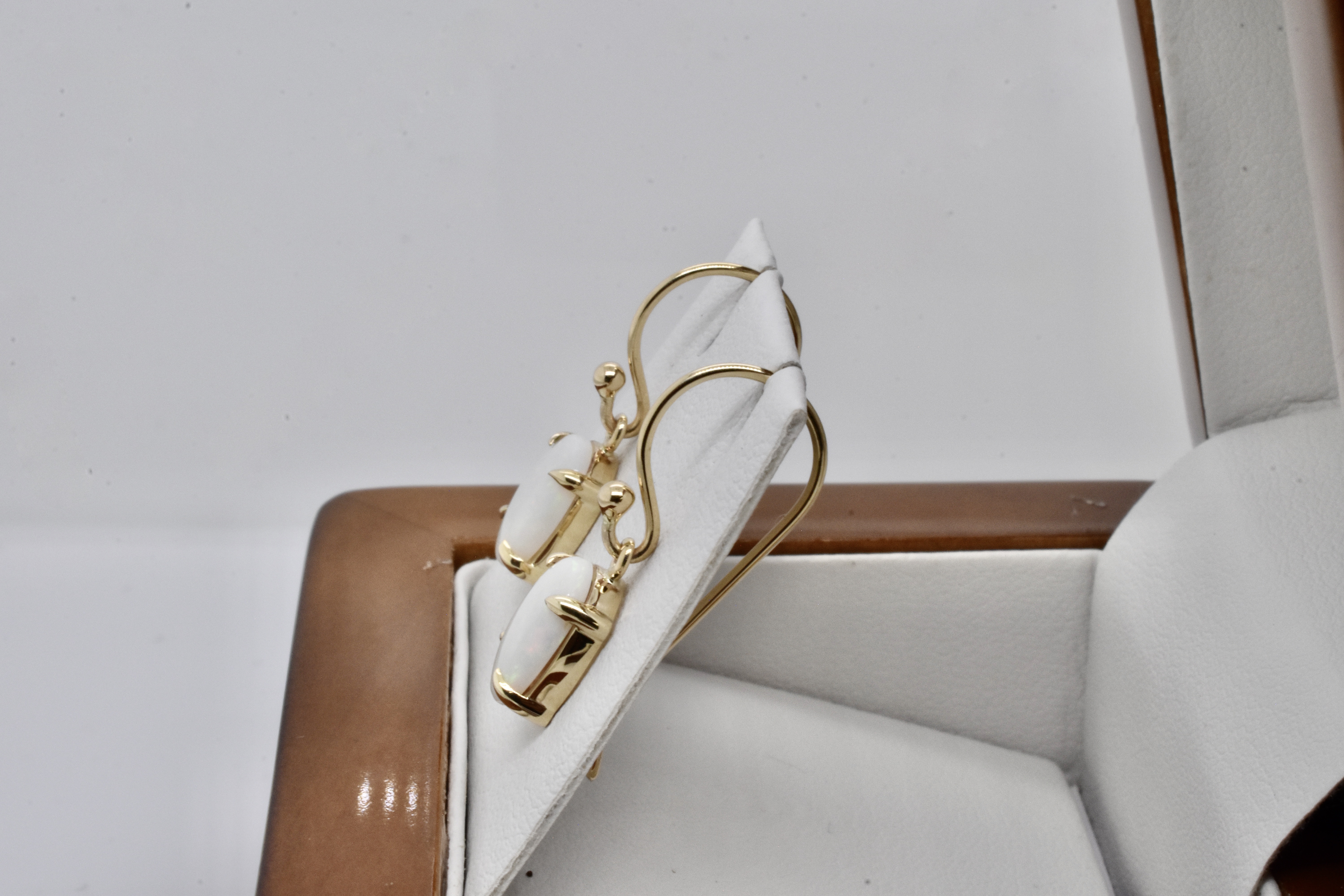 A gorgeous pair of handmade earrings in 9ct yellow gold with approx. 9 x 7mm oval solid white opal with red, orange and green flashes, with 4 claw settings and shepherd hooks
