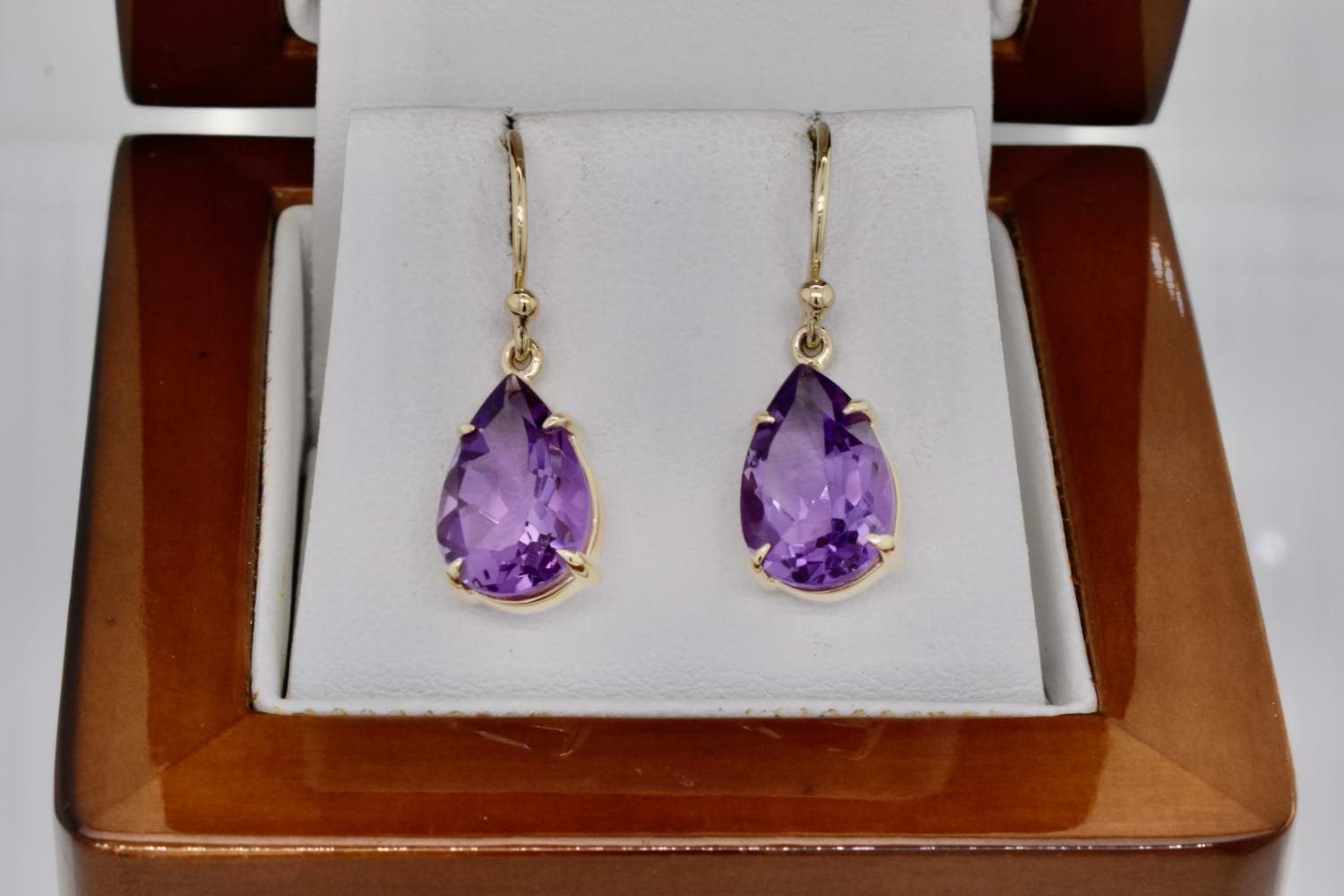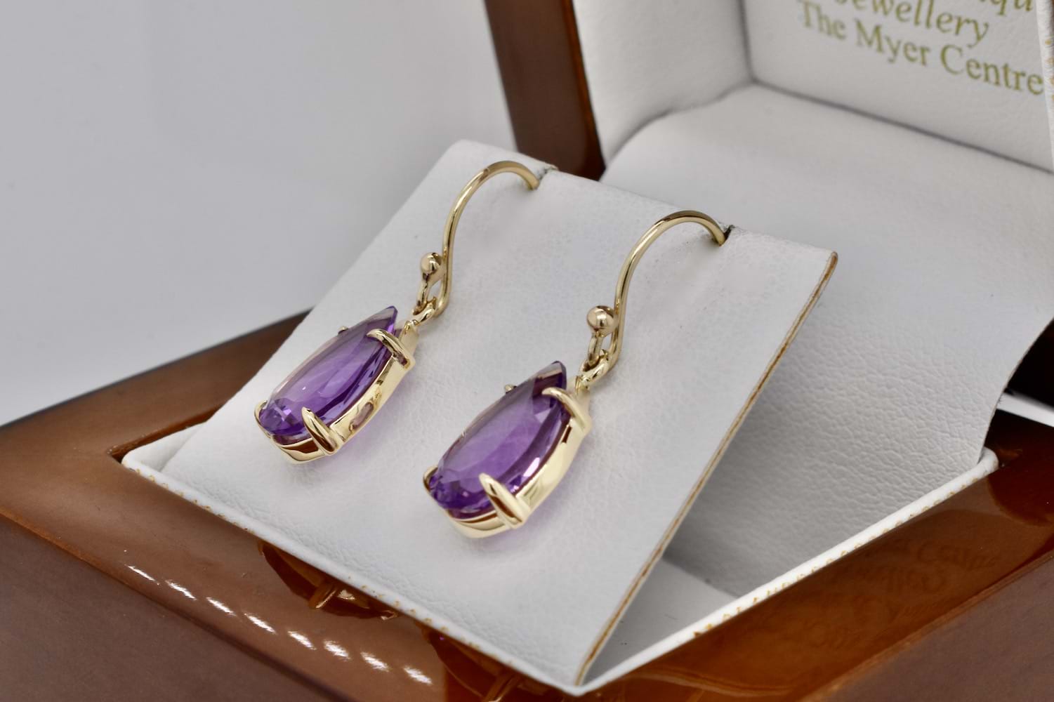 Stunning pair of faceted pearshape amethysts measuring approx. 11.6x8.2mm four claw set into handmade 9ct yellow gold settings suspended from shepherd hook fittings