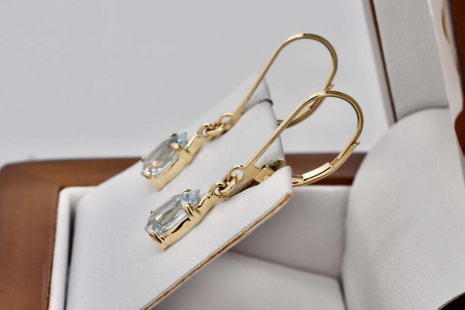 Stunning pair of pearshape aquamarines measuring approx. 7.9x5.9mm set into handmade 9ct yellow gold four claw settings and suspended from eurohook fittings