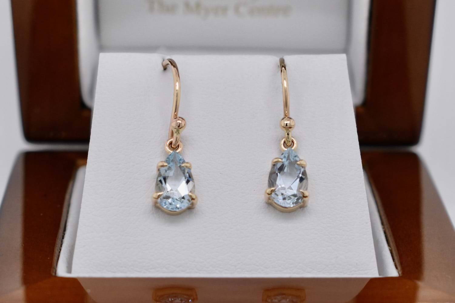 Stunning pair of Pearshape aquamarines measuring approx. 7x5mm set into handmade 9ct yellow gold four claw settings and suspended from shepherd hook fittings