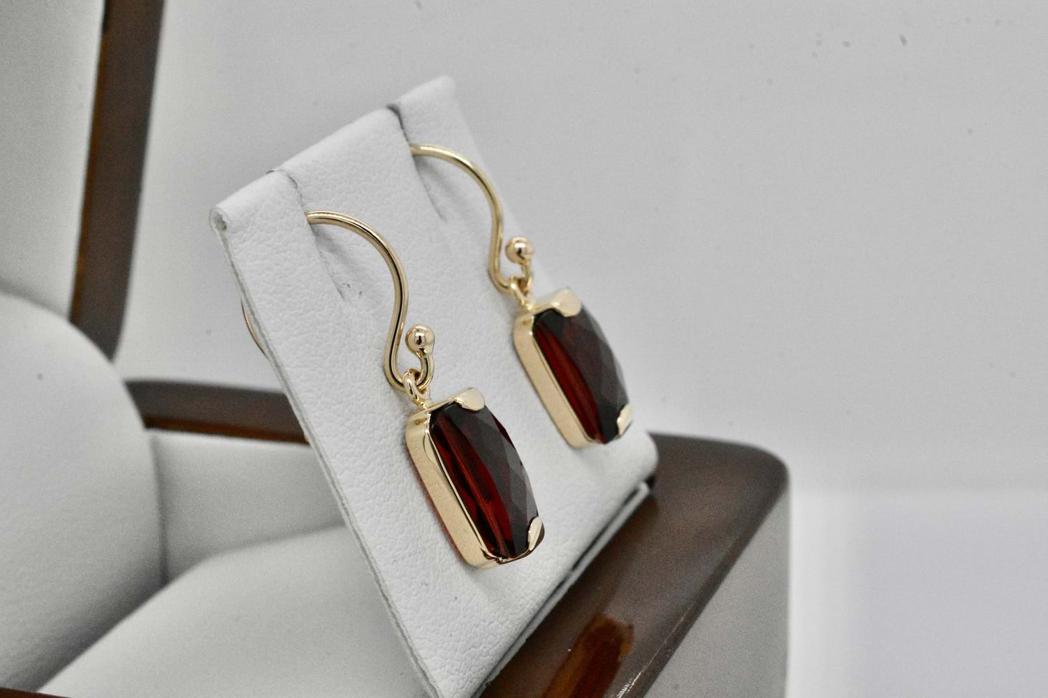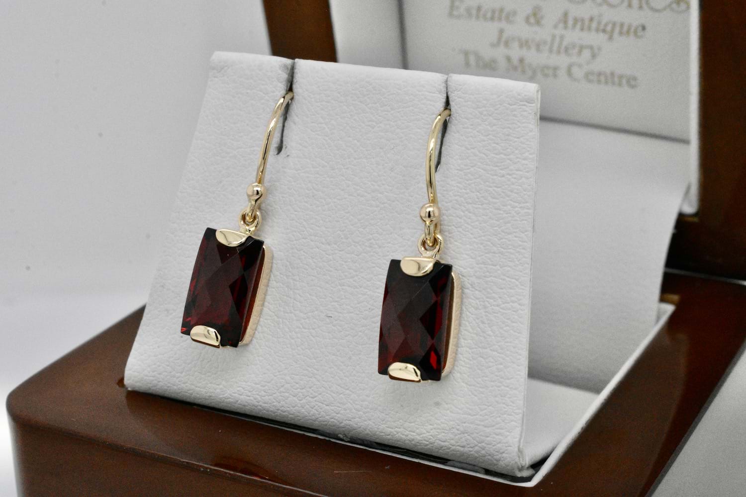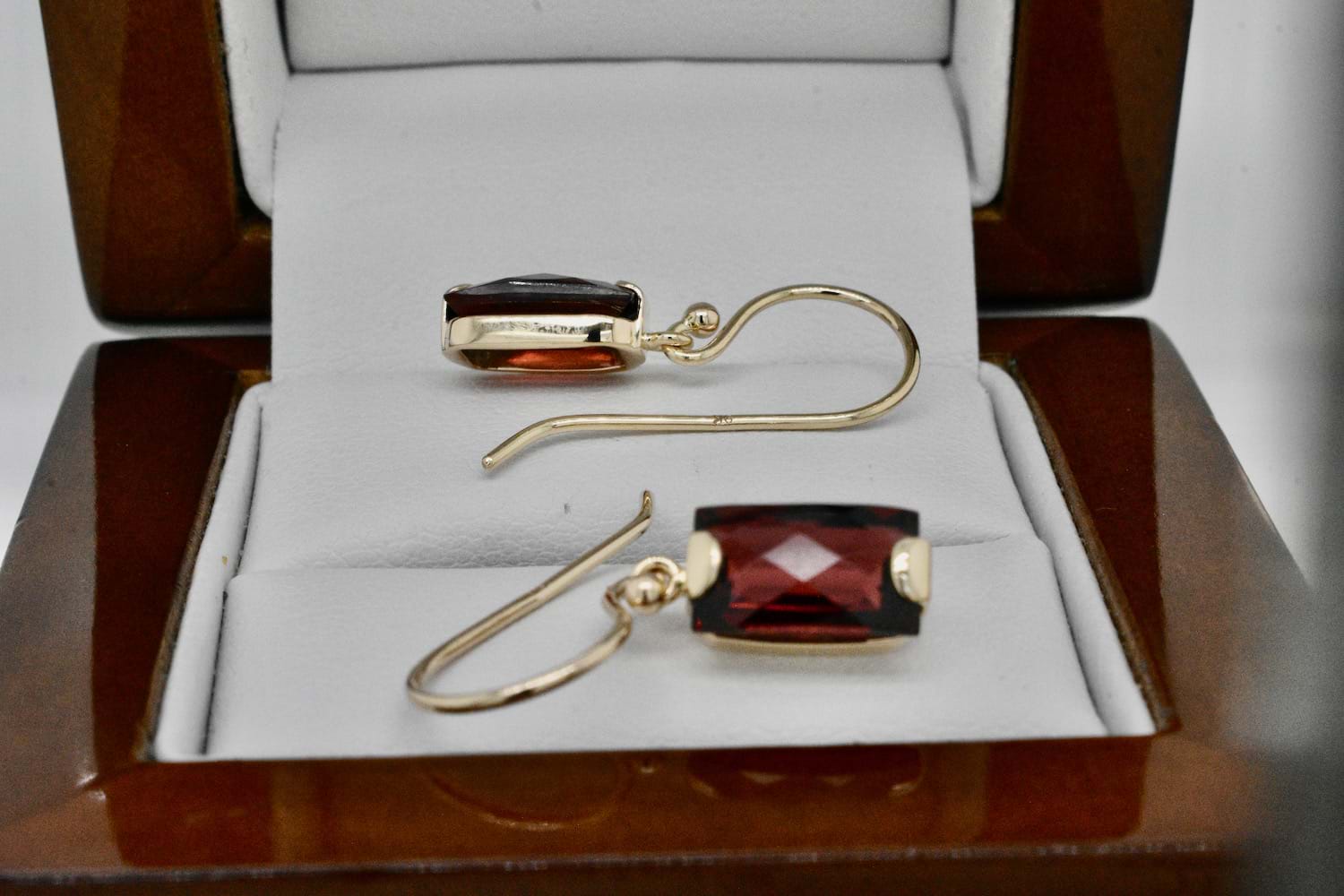 Beautiful handmade 9ct yellow gold drop earrings featuring checkerboard cut rectangular garnets measuring approx. 12x8mm in semi-bezel settings suspended from shepherd hook earrings