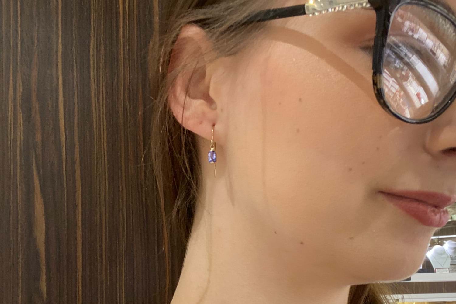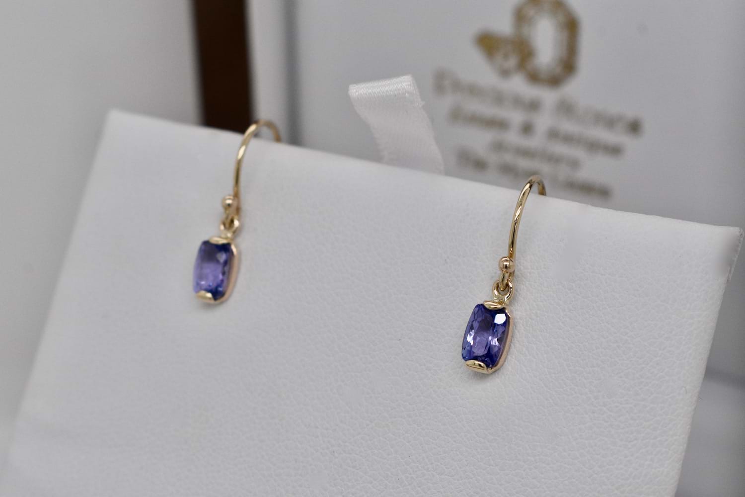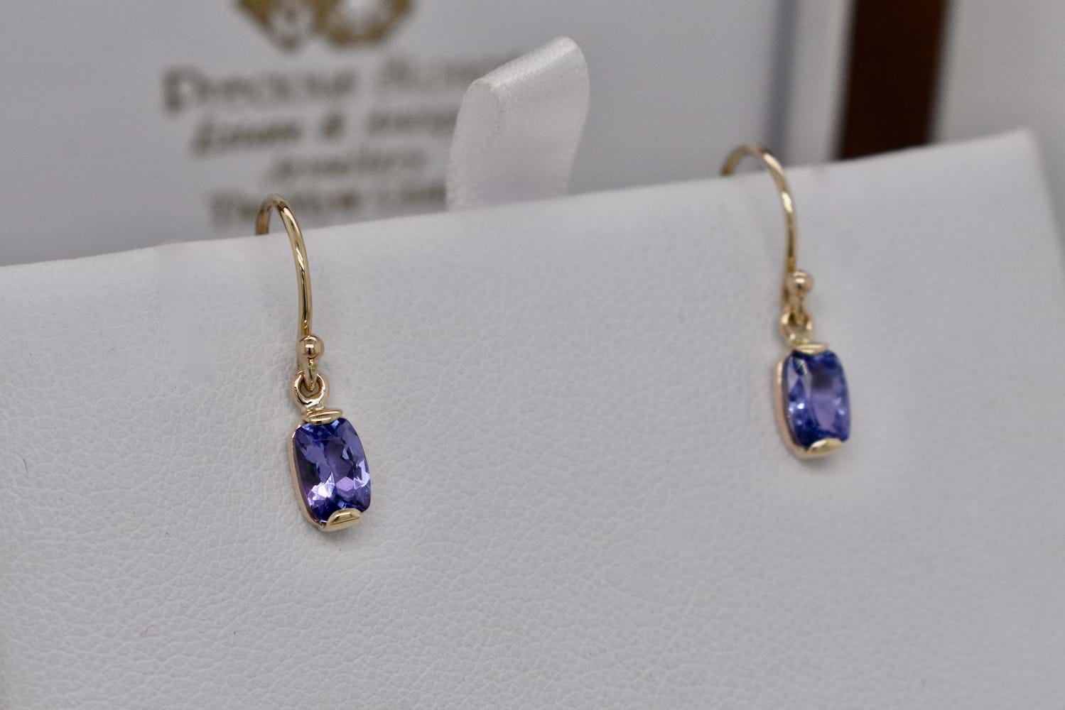 Faceted rectangular cushion tanzanite's measuring 7x4mm set into handmade 9ct yellow gold semi-bezel settings suspended from shepherd hook fittings