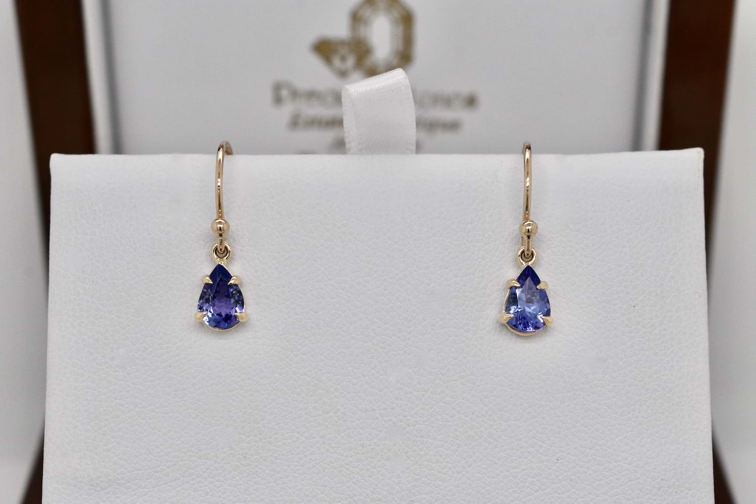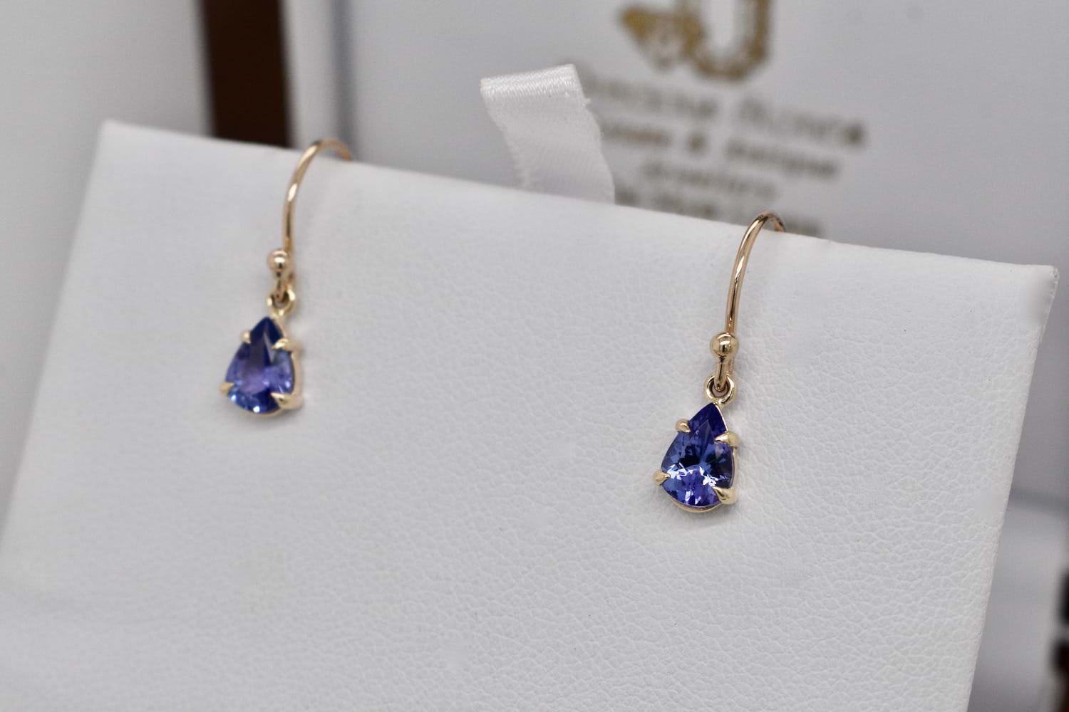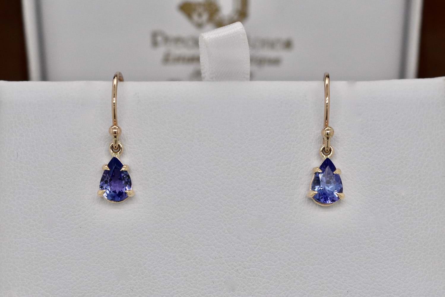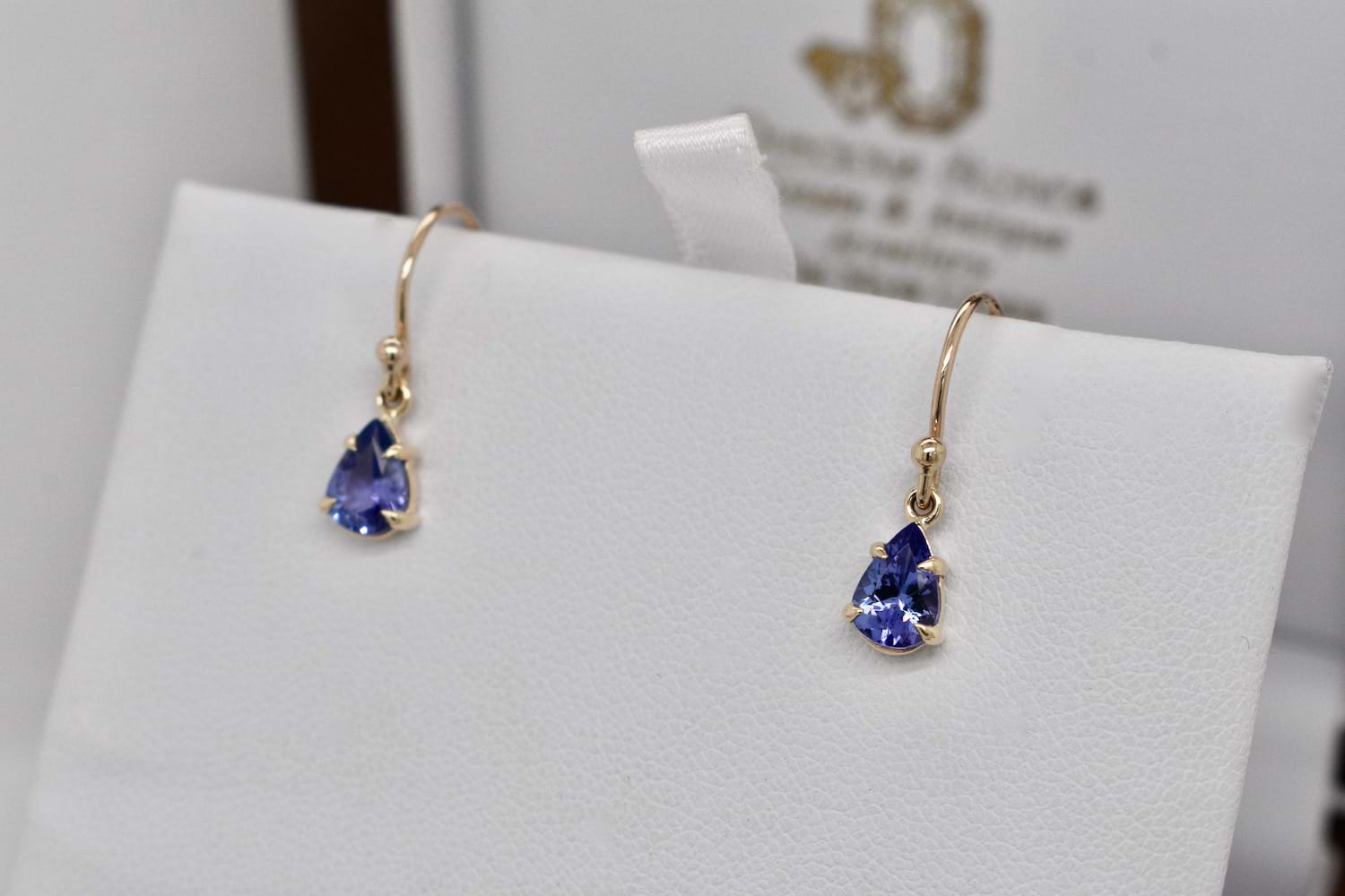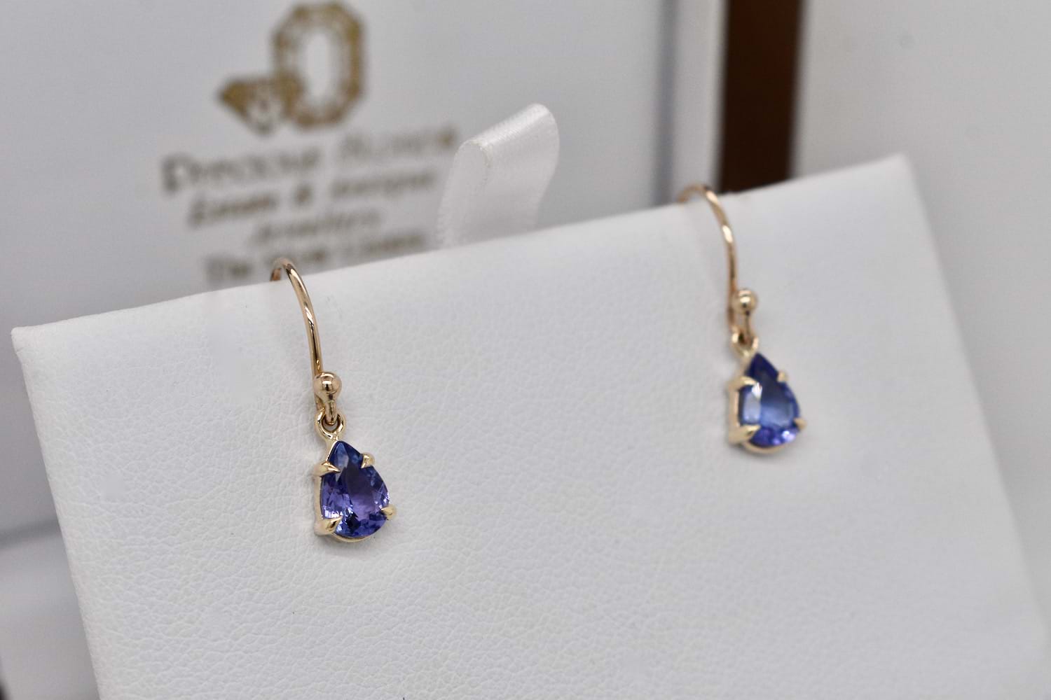 Handmade 9ct Yellow Gold drop earrings featuring four claw set Pearshape tanzanite's measuring 7x5mm suspended from shepherd hook fittings