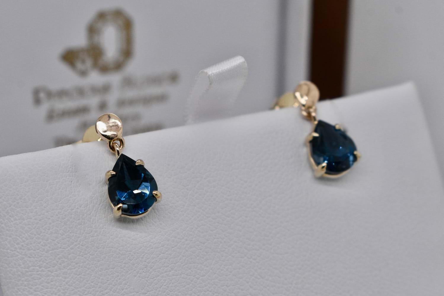 SOLD Handmade 9ct Yellow Gold Textured Stud & London Blue Topaz Drop Earrings