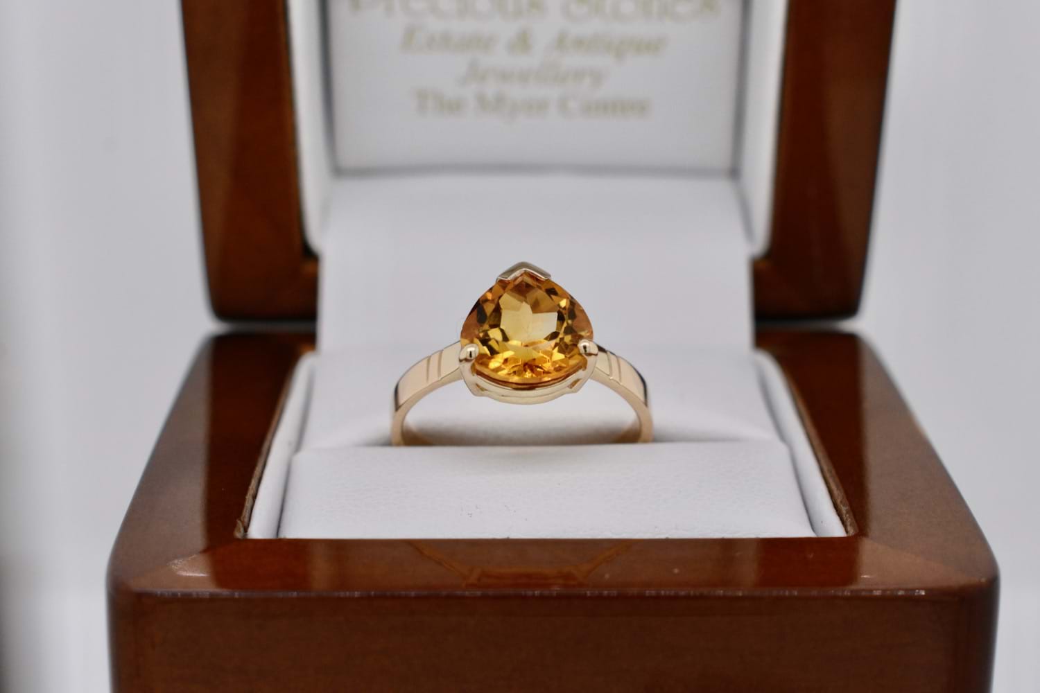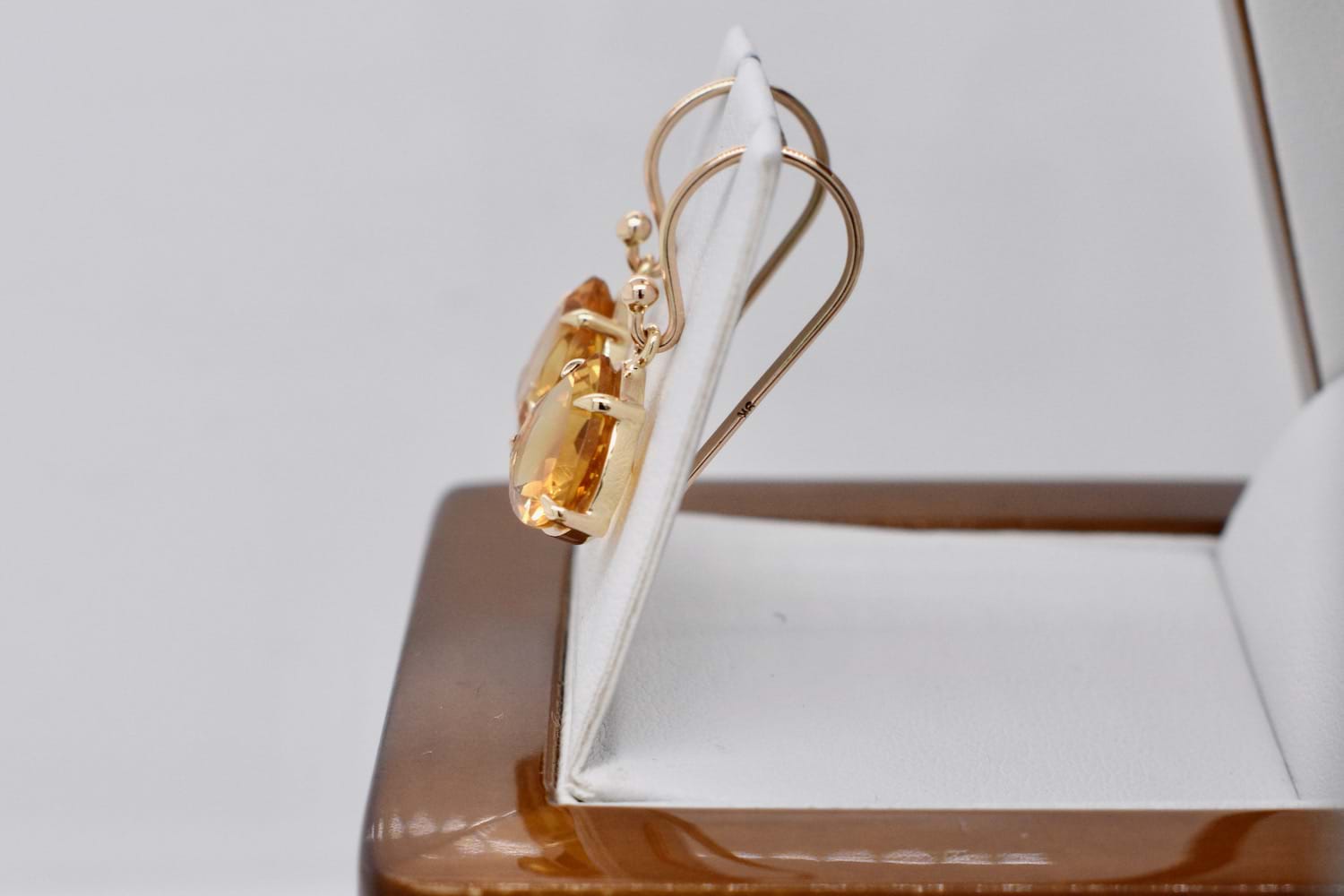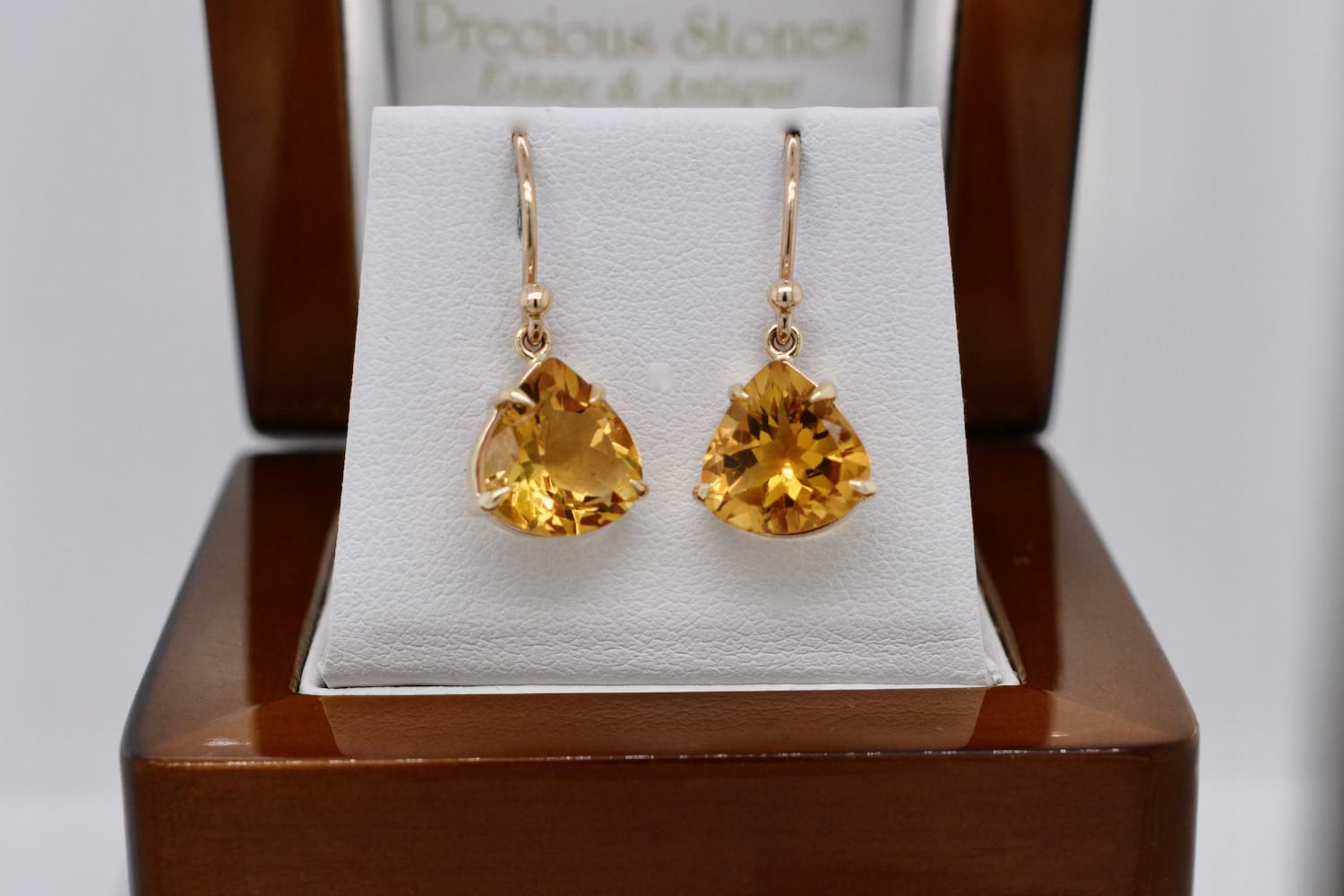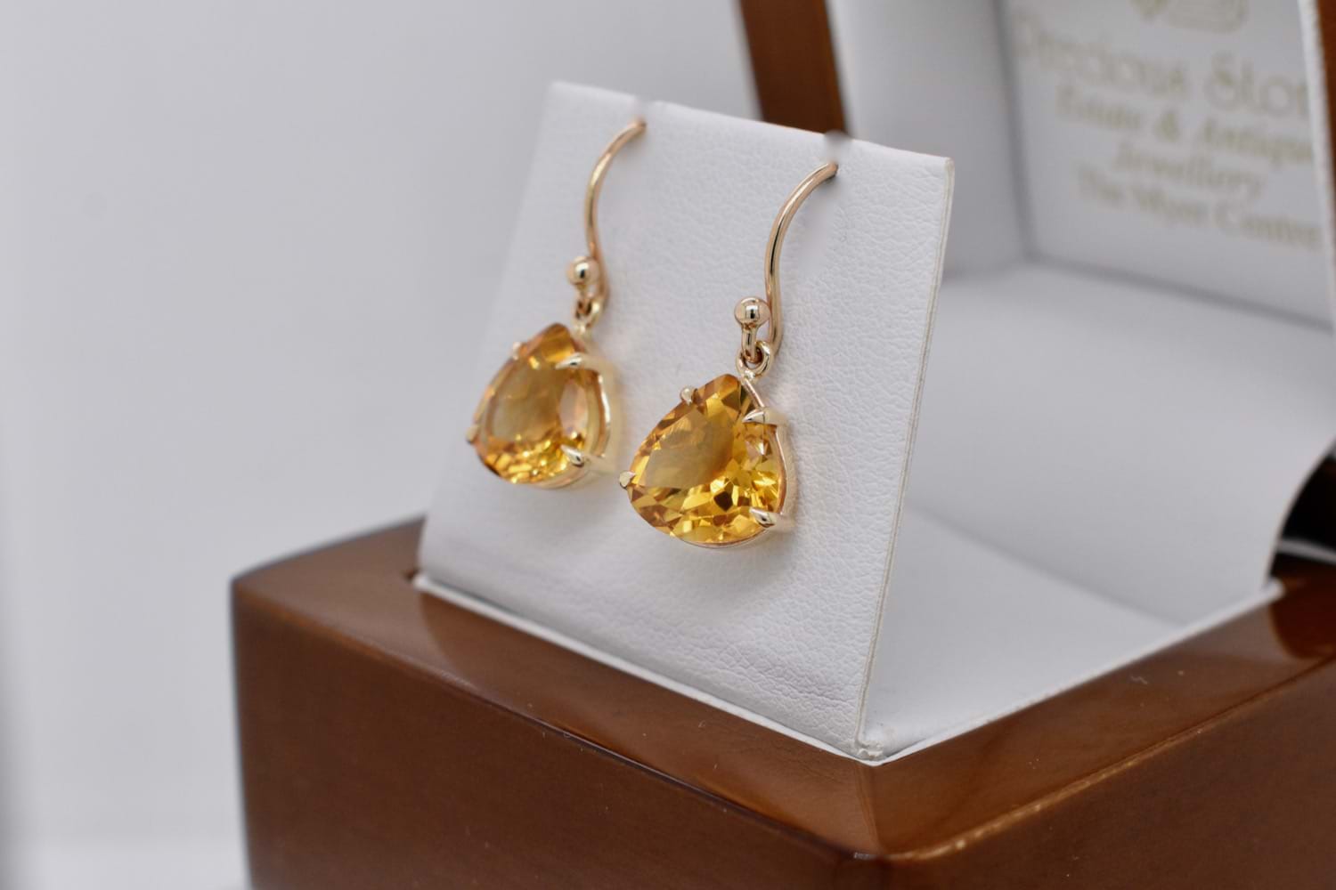 Stunning pair of trillion/pearshape citrines measuring approx. 10mm set into handmade 9ct yellow gold four claw settings and suspended from shepherd hook fittings. Matching ring (pictured) 20310677 available for separate purchase