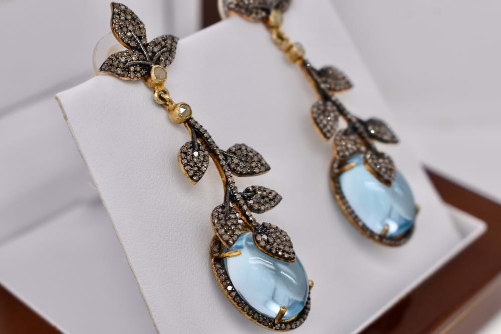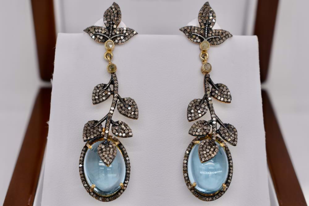 Eye catching antique design earrings. A stunning pair of cabochon blue topaz are the focal point of these sterling silver vintage leaf style drop earrings encrusted with 498 shimmering light yellow-light champagne diamonds totalling 2.06cts with 14ct yellow gold stud post and butterfly fittings. Independent Valuation Supplied