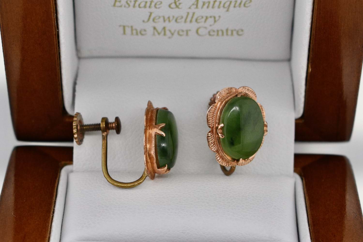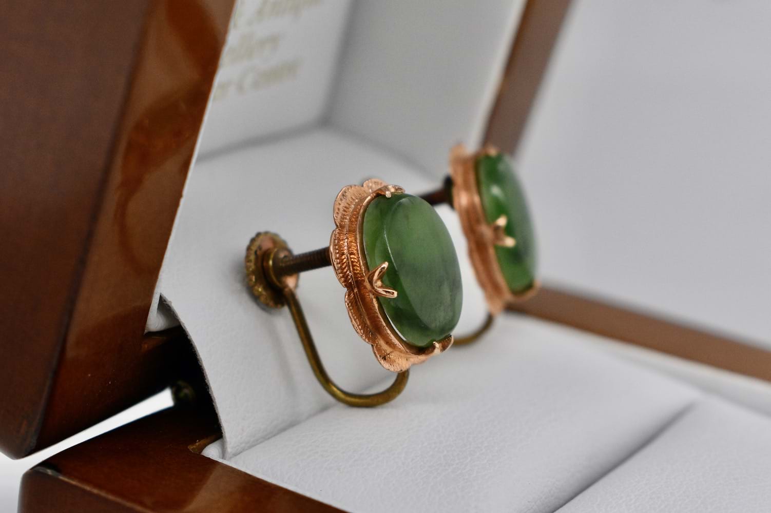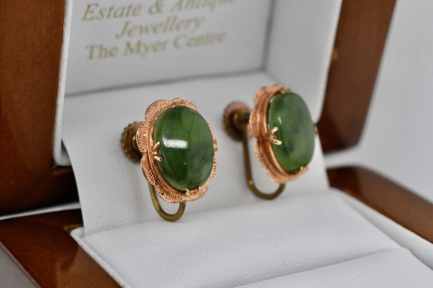 A vintage pair of 9ct yellow gold screw back earrings featuring polished Jade