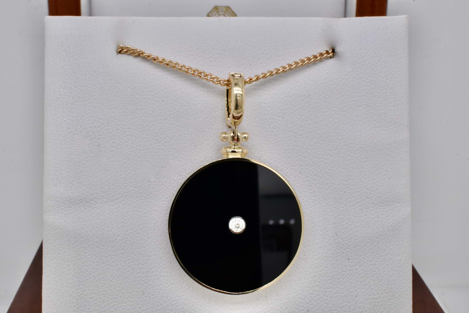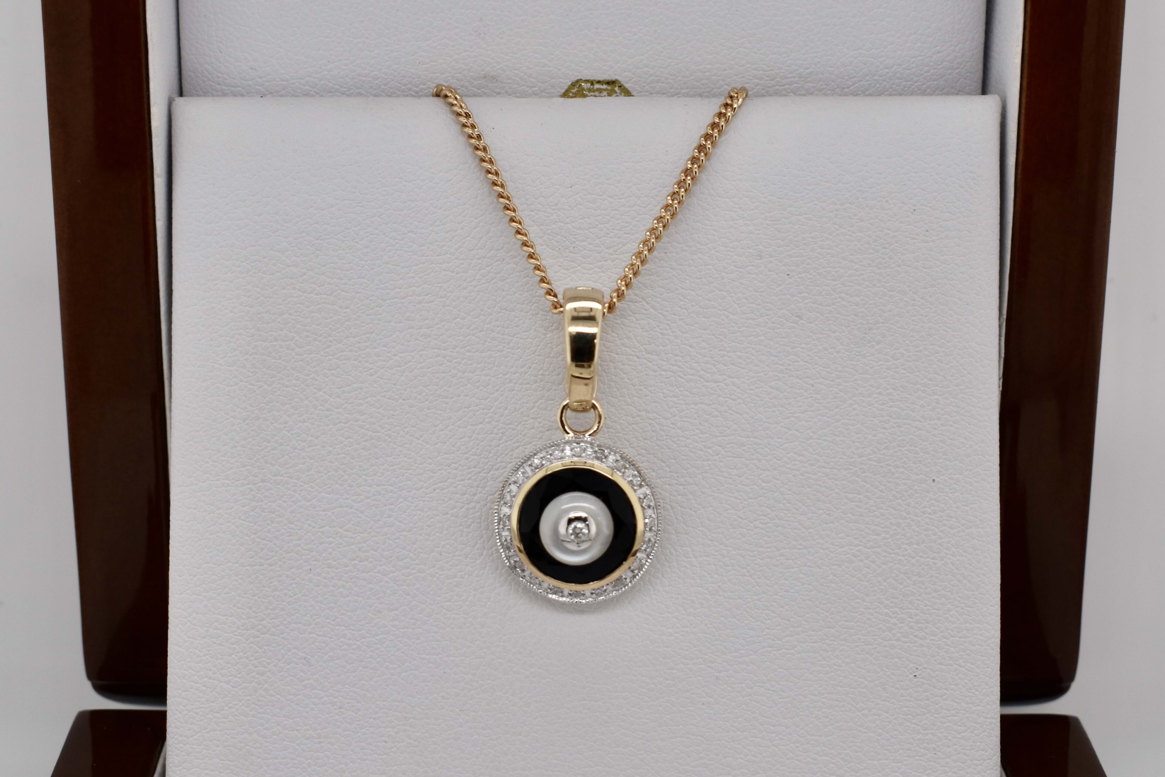 SOLD 9ct Yellow Gold Round Onyx, Mother of Pearl & Diamond Triple Border Pendant