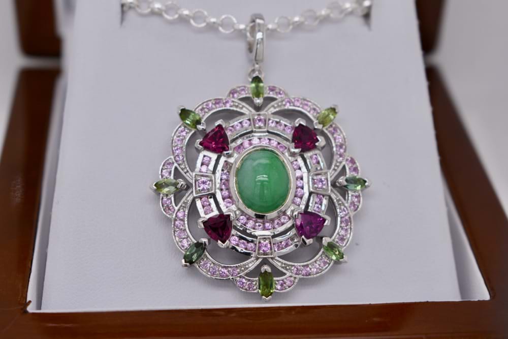 SOLD Sterling Silver Jadeite, Rhodolite Pink Garnet, Sapphire & Green Tourmaline Enhancer