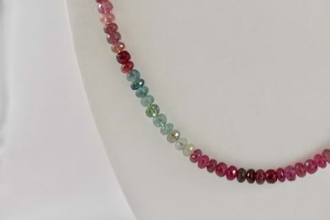 This stunning strand of multi-coloured tourmalines have been carefully hand strung on silk with a 9ct yellow gold ball clasp. Measuring 73cm in length and each bead containing 80 individual facets and measuring 4.5-5mm this strand of 216 tourmalines is eye catching when worn alone or paired with a pendant. Ranging in colours from black, gold, pink, blue and green these rare tourmalines were sourced in Afghanistan and total an incredible 147cts. Independent Valuation Supplied