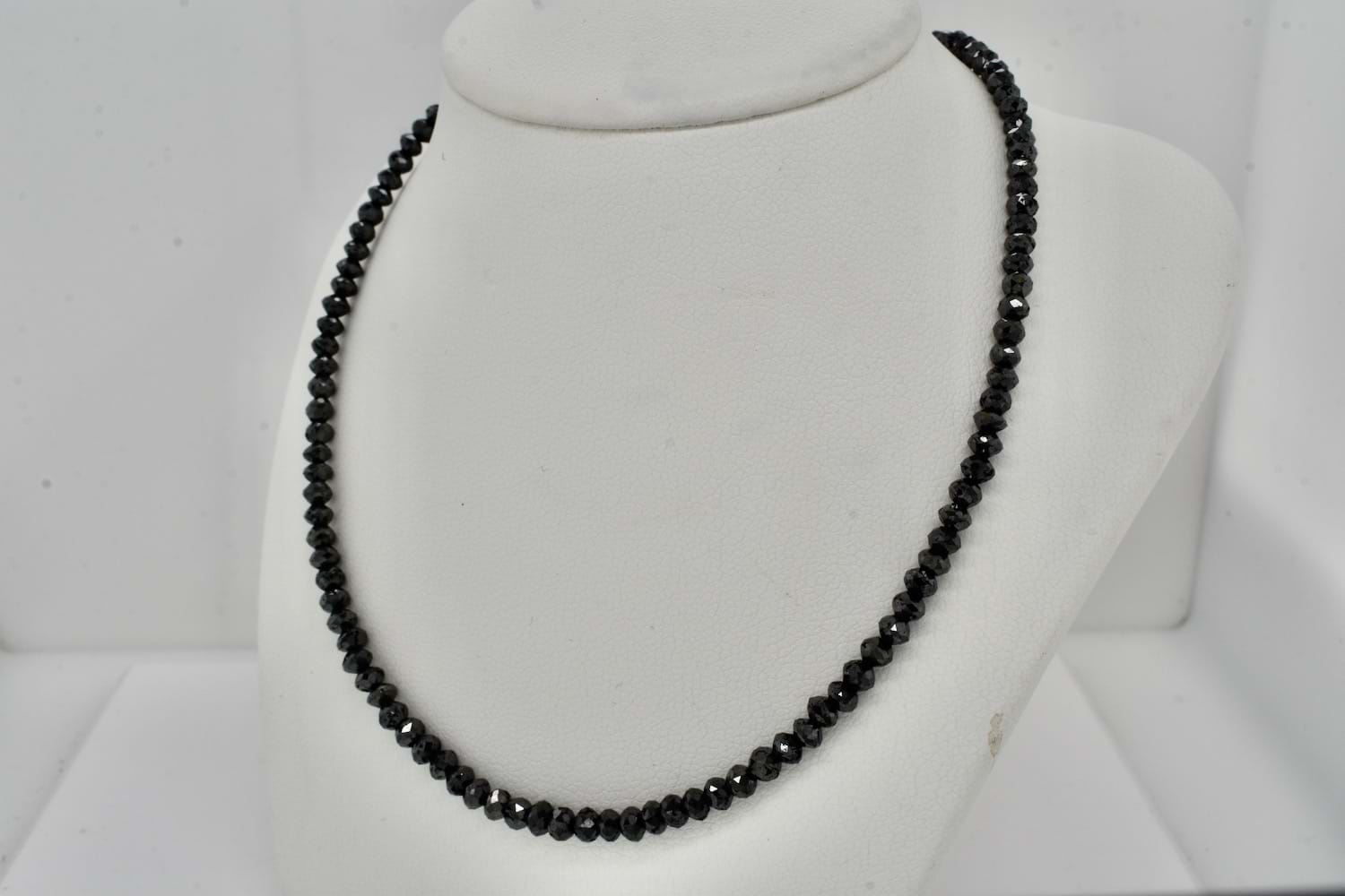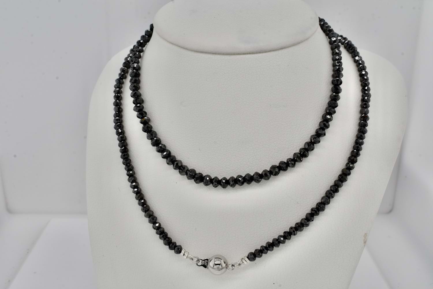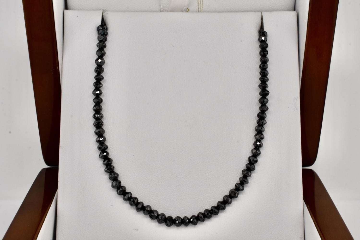 Pictures truly cannot capture just how dazzling and gleaming this black diamond strand is, which captures light from every angle and looks like it is glittering when worn. This strand is 44cm long with a graduation of 2.8-3.5mm black diamonds, finished with a polished round 9ct white gold clasp. Perfect to be worn as is or with a pendant or enhancer.