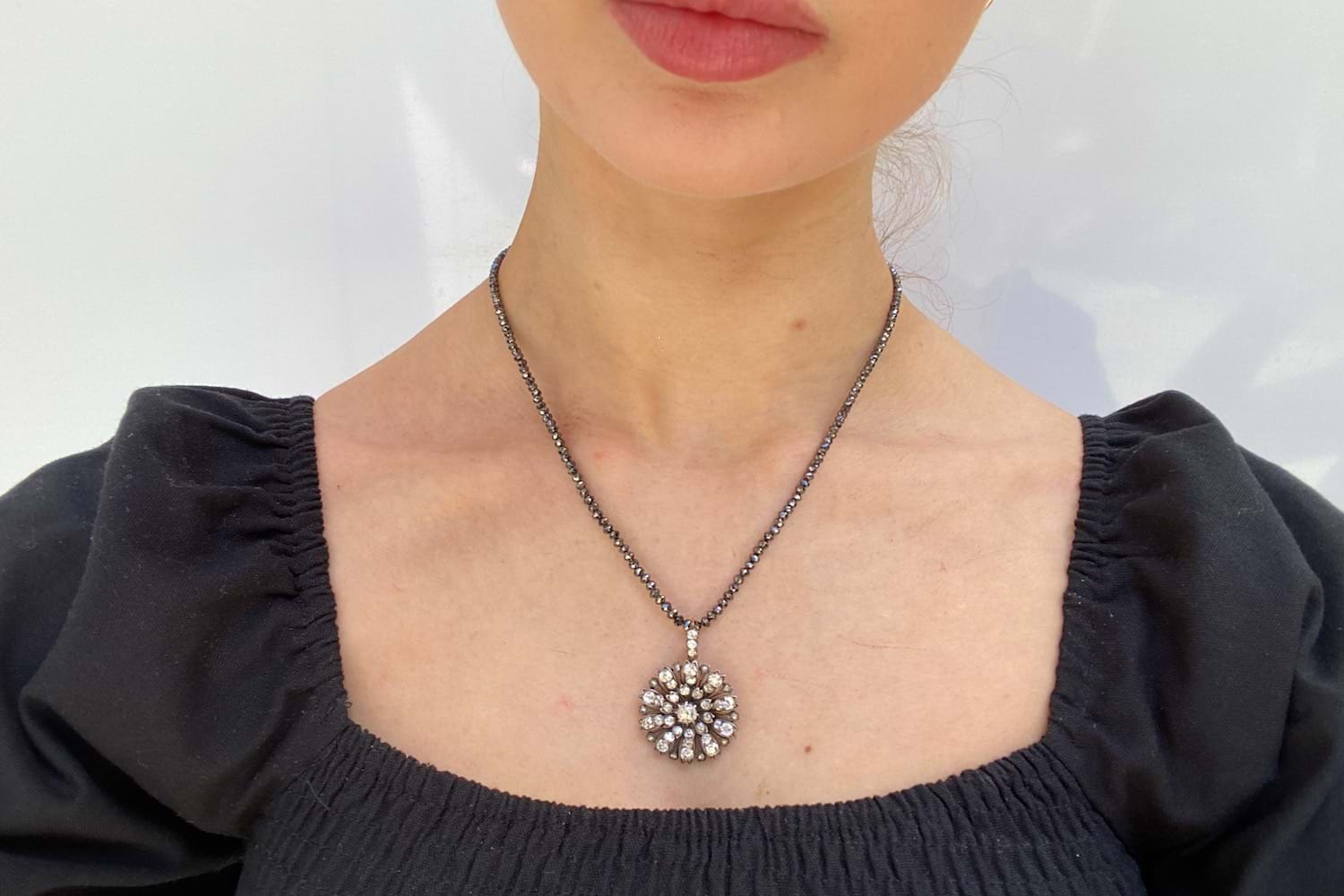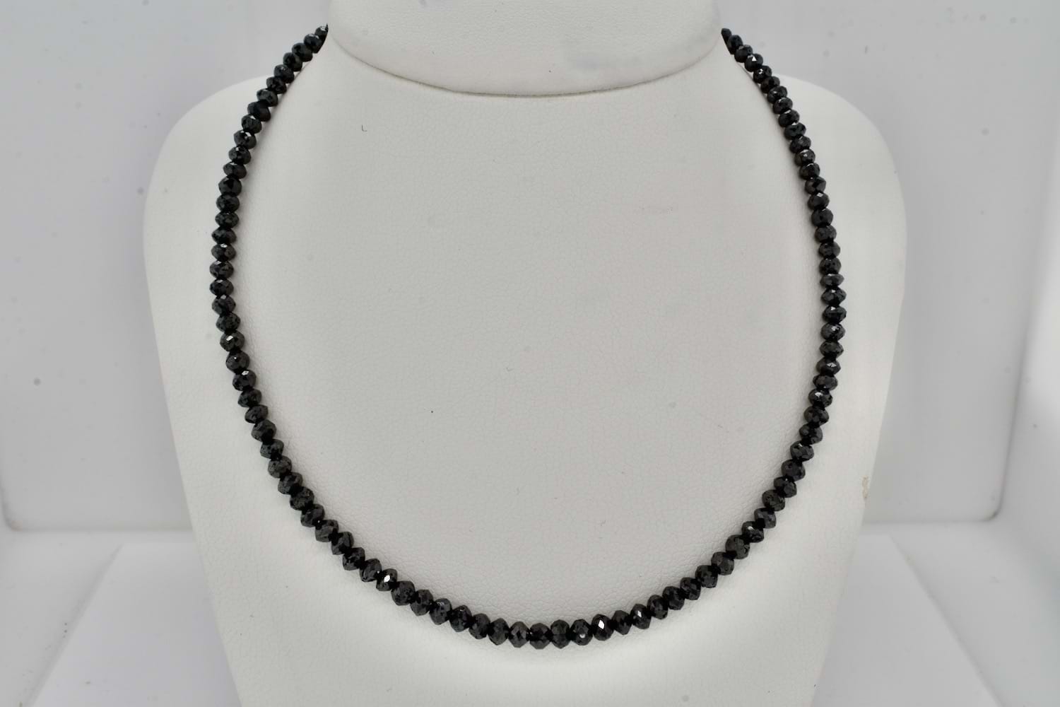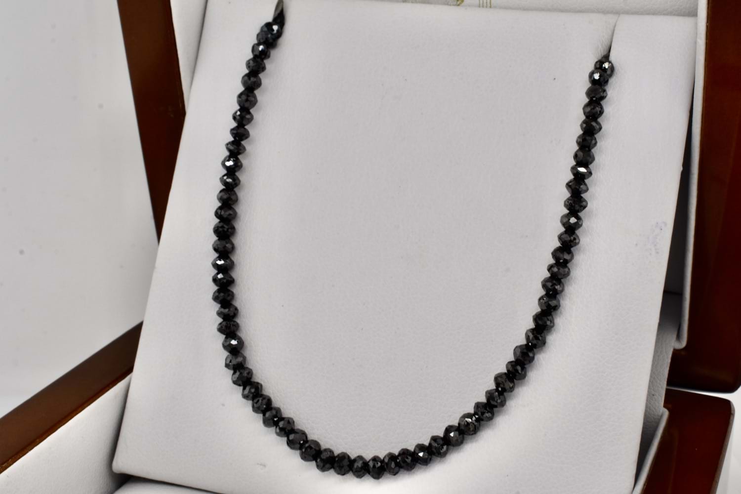 Pictures truly cannot capture just how dazzling and gleaming this black diamond strand is, which captures light from every angle and looks like it is glittering when worn. This strand is 44cm long with a graduation of 2.8-3.5mm black diamonds, finished with a polished round 9ct white gold clasp. Perfect to be worn as is or with a pendant or enhancer.