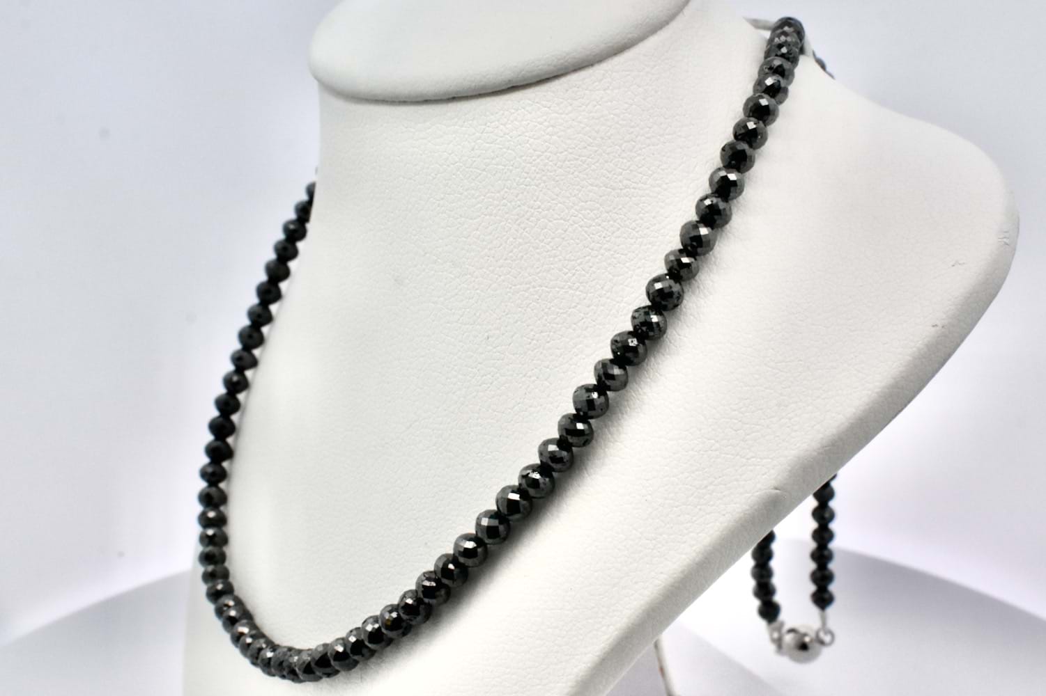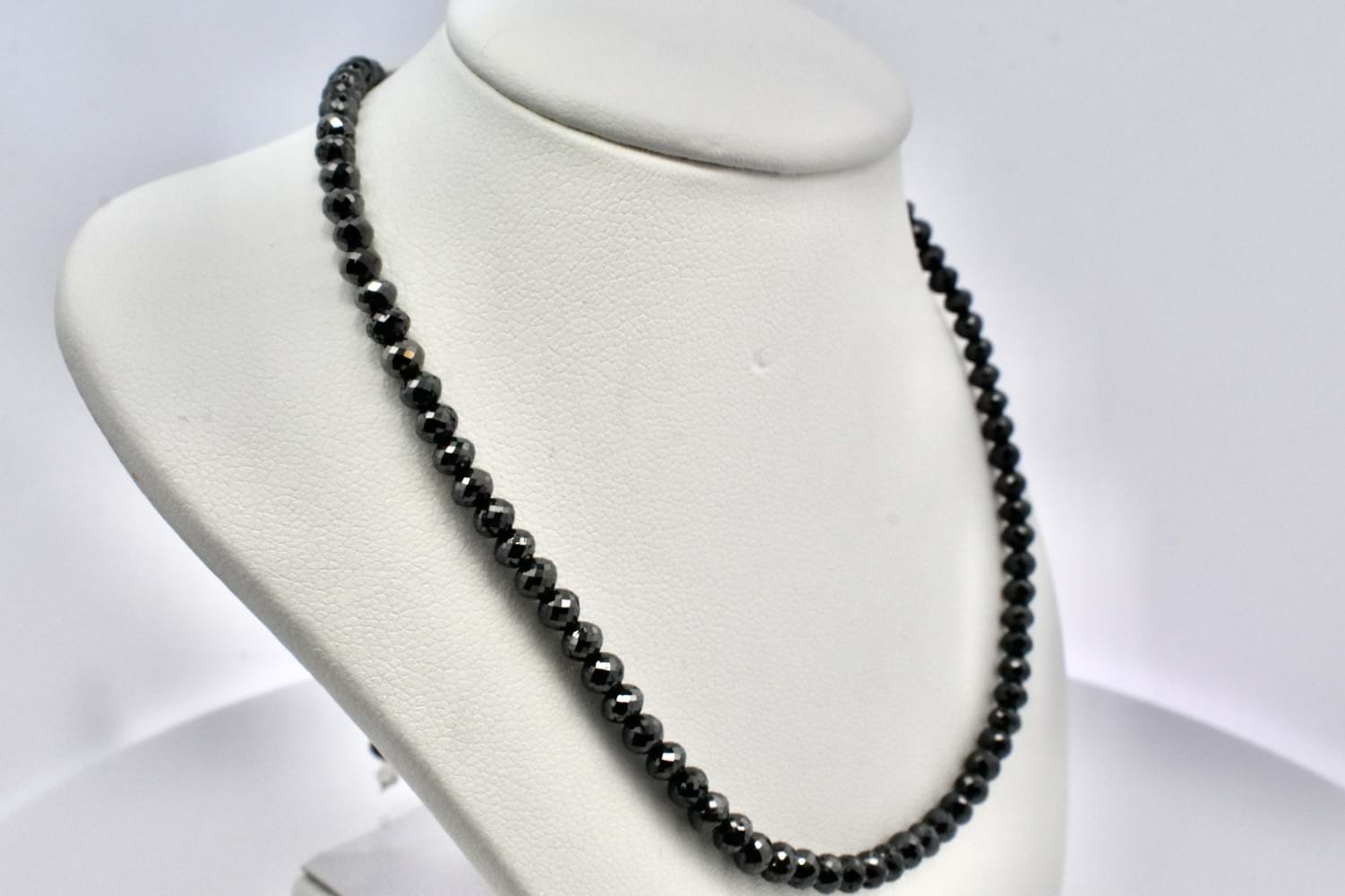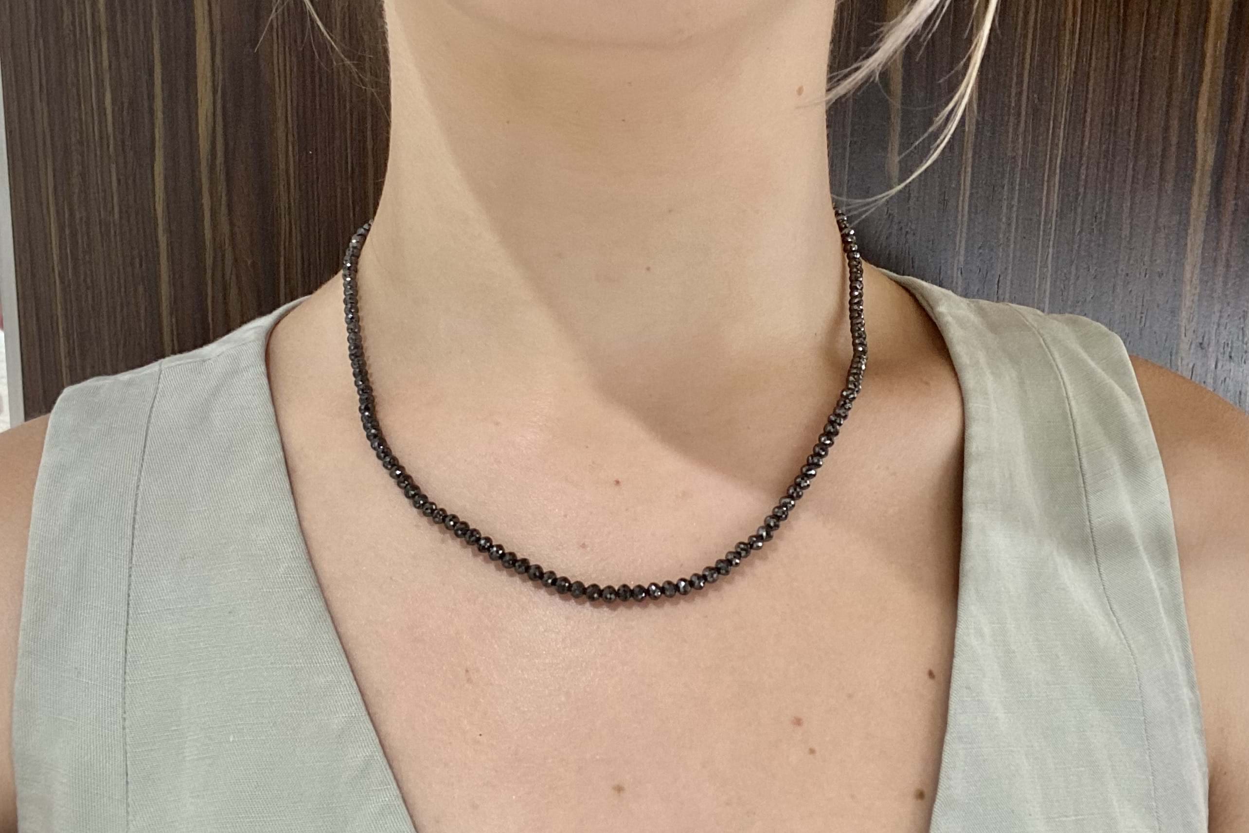 An elegant and sparkling strand perfect for an evening look, featuring average 3.7mm faceted black diamonds, hand strung and finished with a 9ct white gold 6mm ball clasp. This strand can be worn on its own or used as a stunning base for a pendant or enhancer. This strand has a matching bracelet 20346553, available for separate purchase