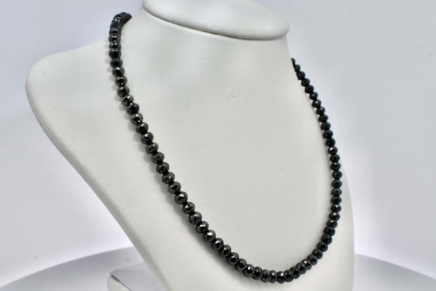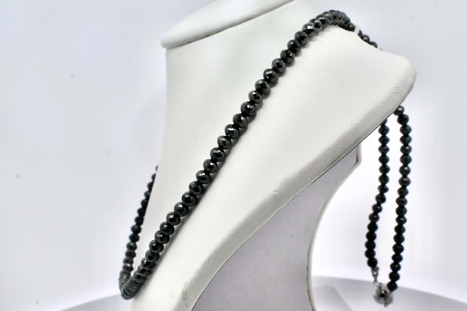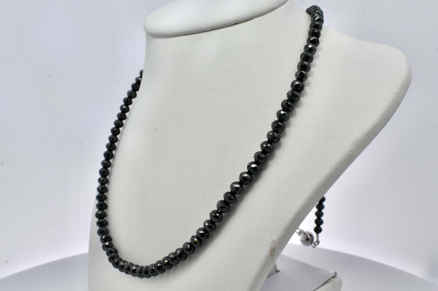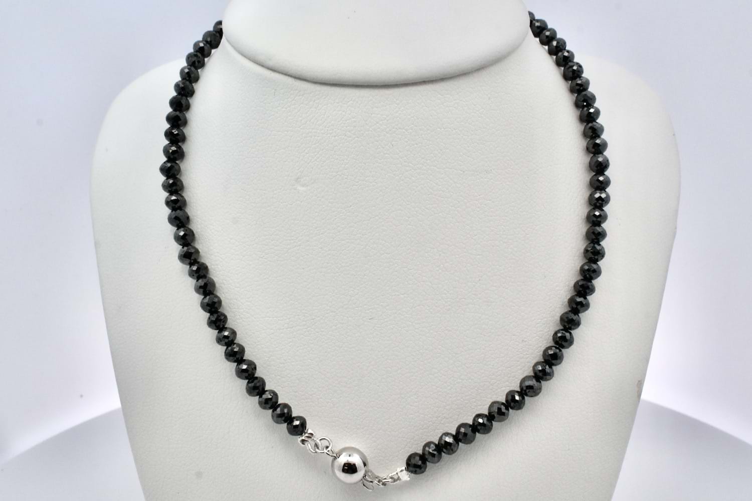 An elegant and sparkling strand perfect for an evening look, featuring average 3.7mm faceted black diamonds, hand strung and finished with a 9ct white gold 6mm ball clasp. This strand can be worn on its own or used as a stunning base for a pendant or enhancer. This strand has a matching bracelet 20346546, available for separate purchase