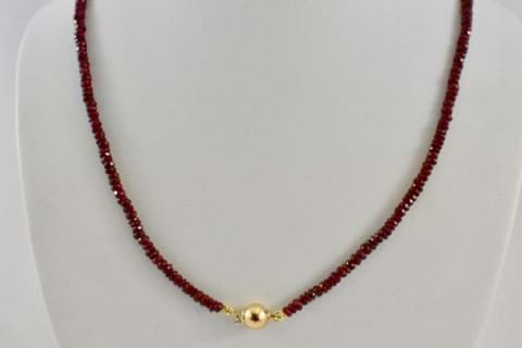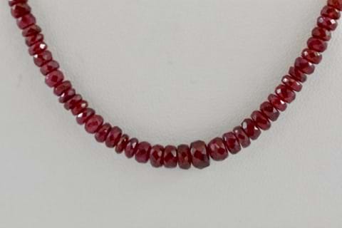A striking strand of 56cts of individually faceted ruby beads that has been expertly hand strung on a specialised wire with a 9ct yellow gold ball clasp. Measuring 45cm in length with each bead measuring 3-5mm, this lovely strand also looks fantastic when paired with a pendant