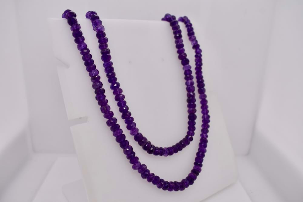 Faceted 5.2-6.2mm graduating dark purple Amethyst beads strung on a necklace with a sterling silver ball clasp. Finished length is 80cm