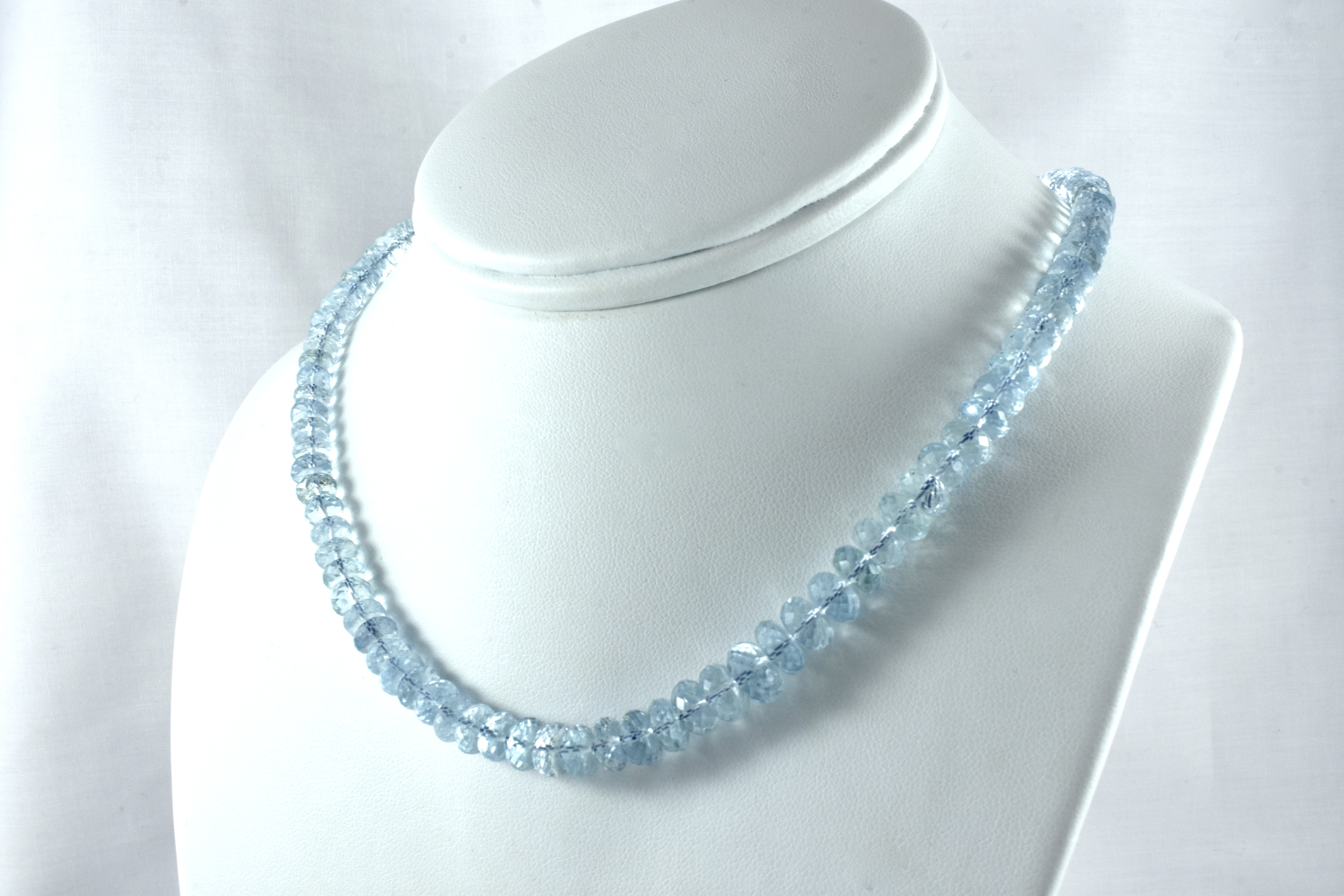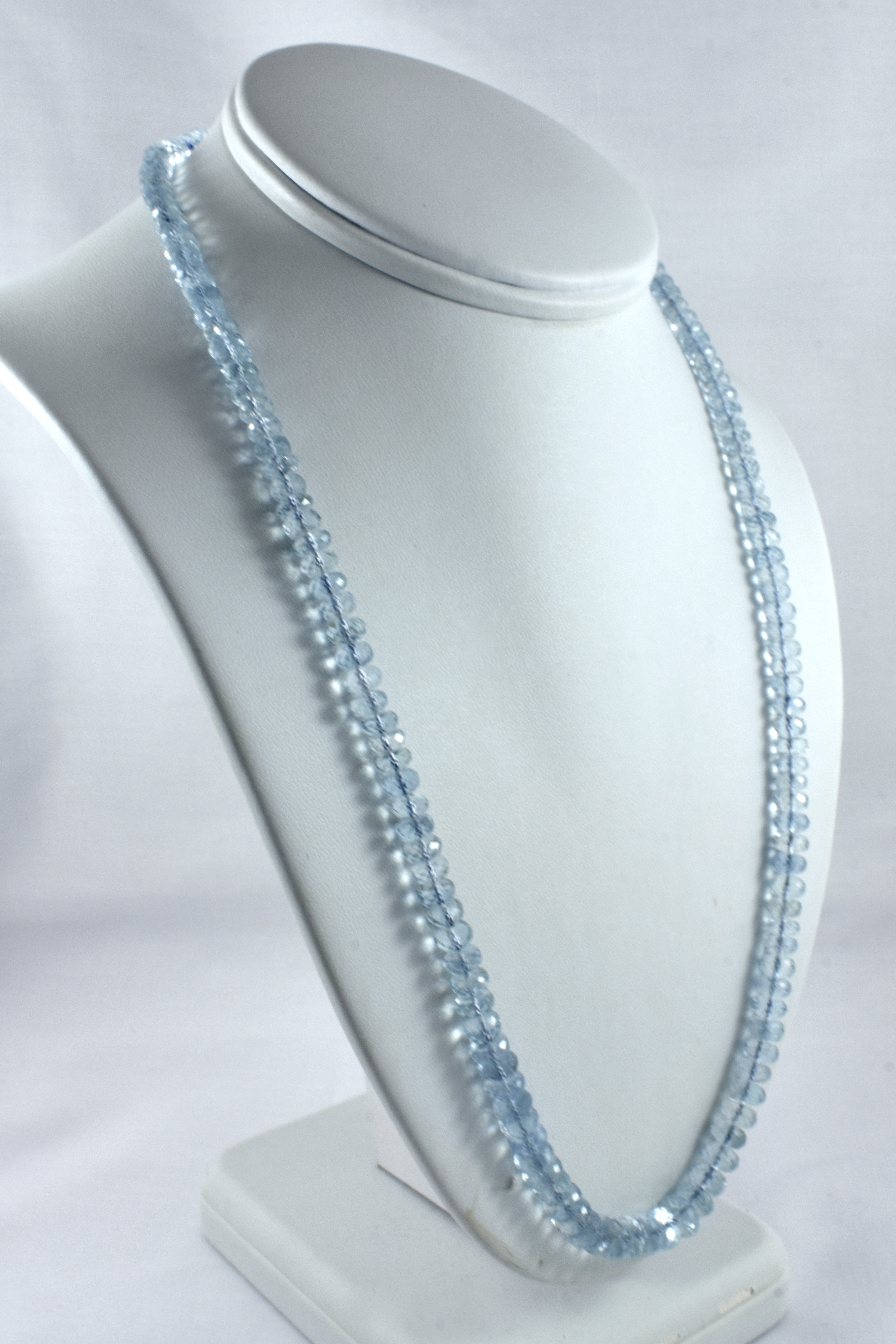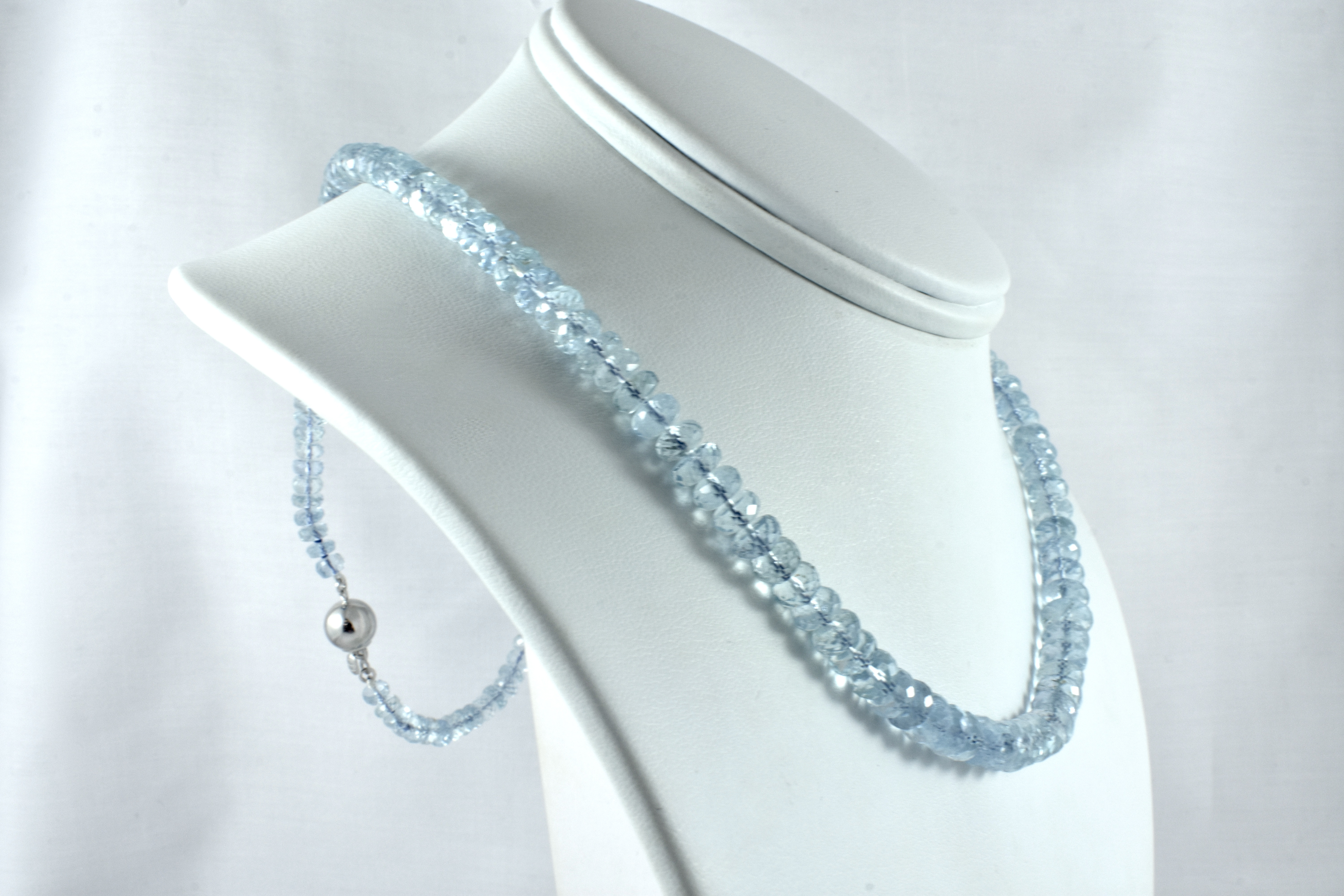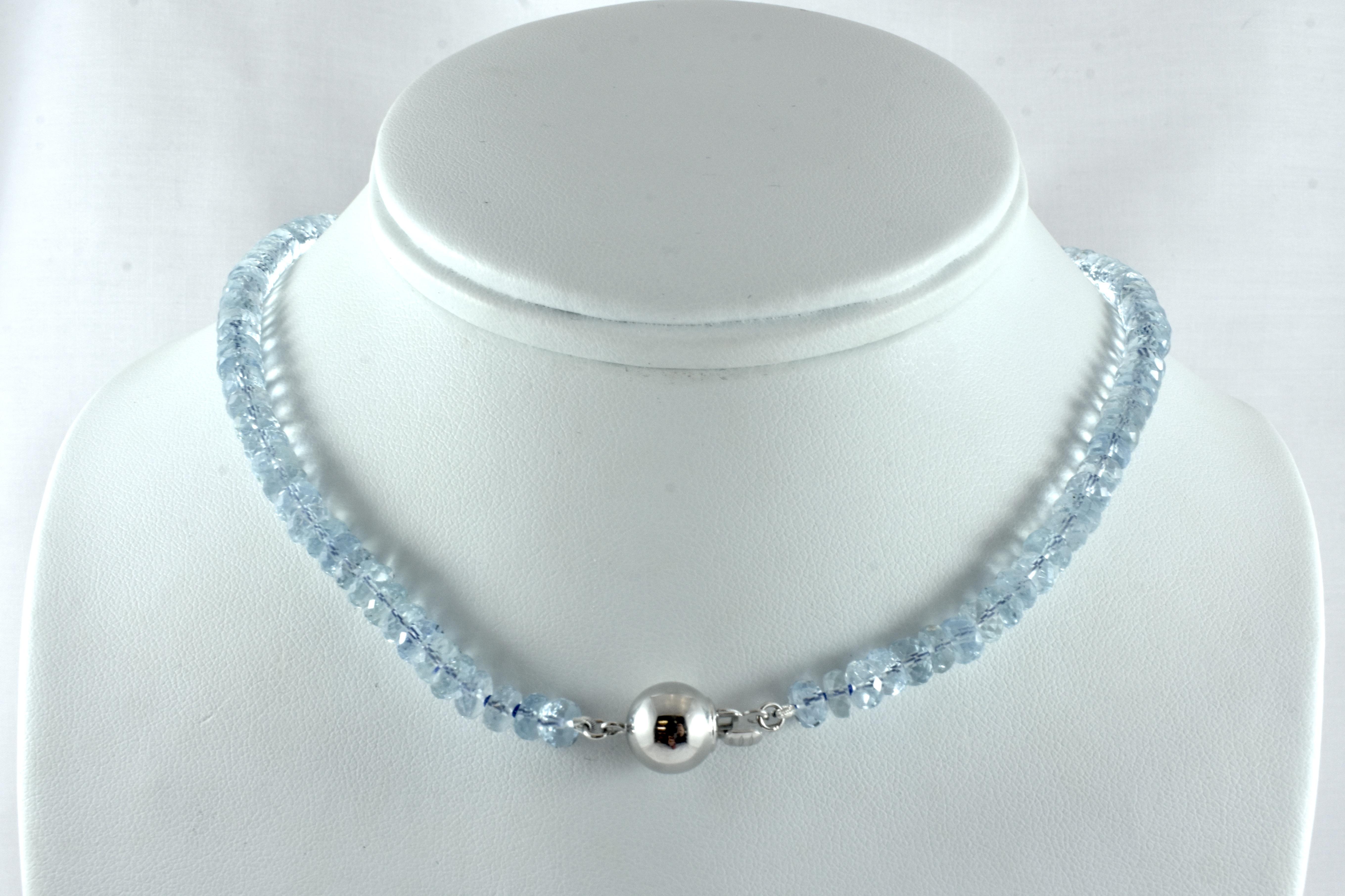 Brilliantly bright and glimmering, this 55cm long strand features a total of 158 stunning, large 8-5mm faceted disc light blue aquamarine beads finished with a 9mm round sterling silver polished ball clasp