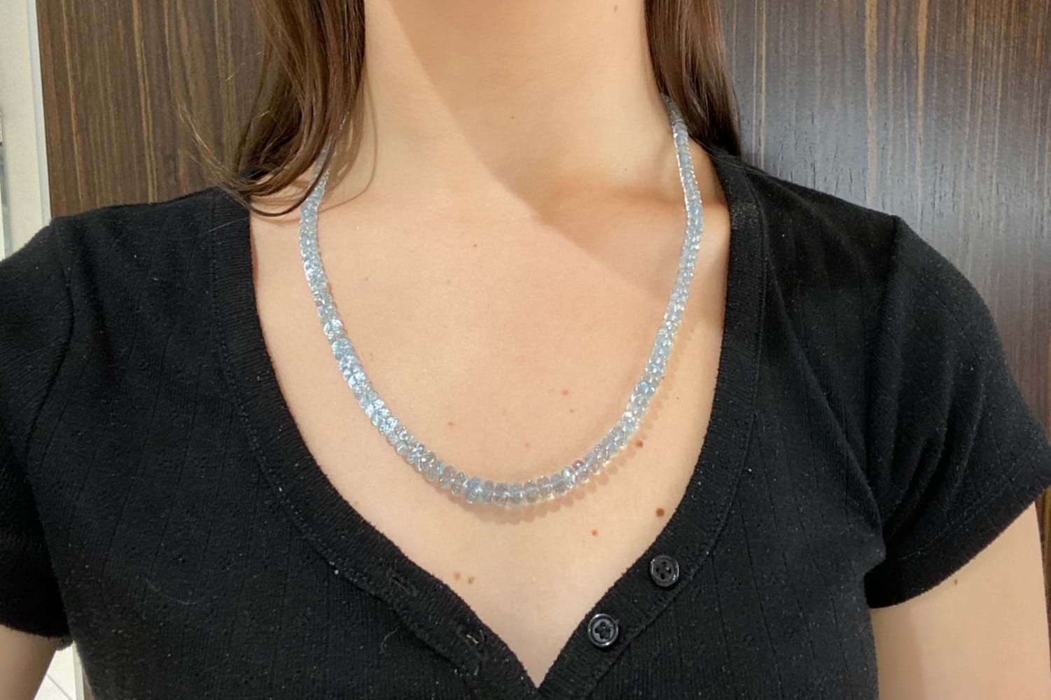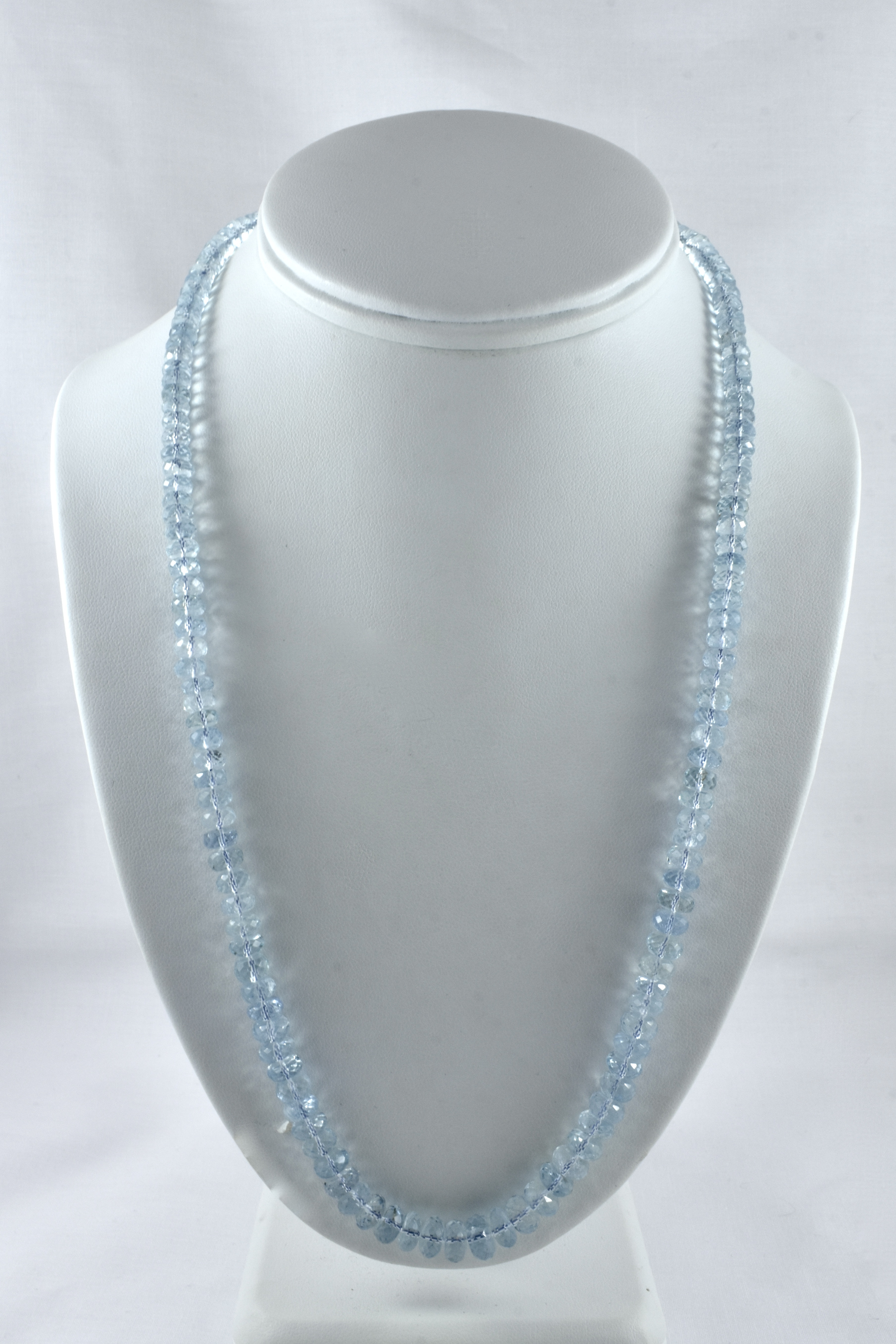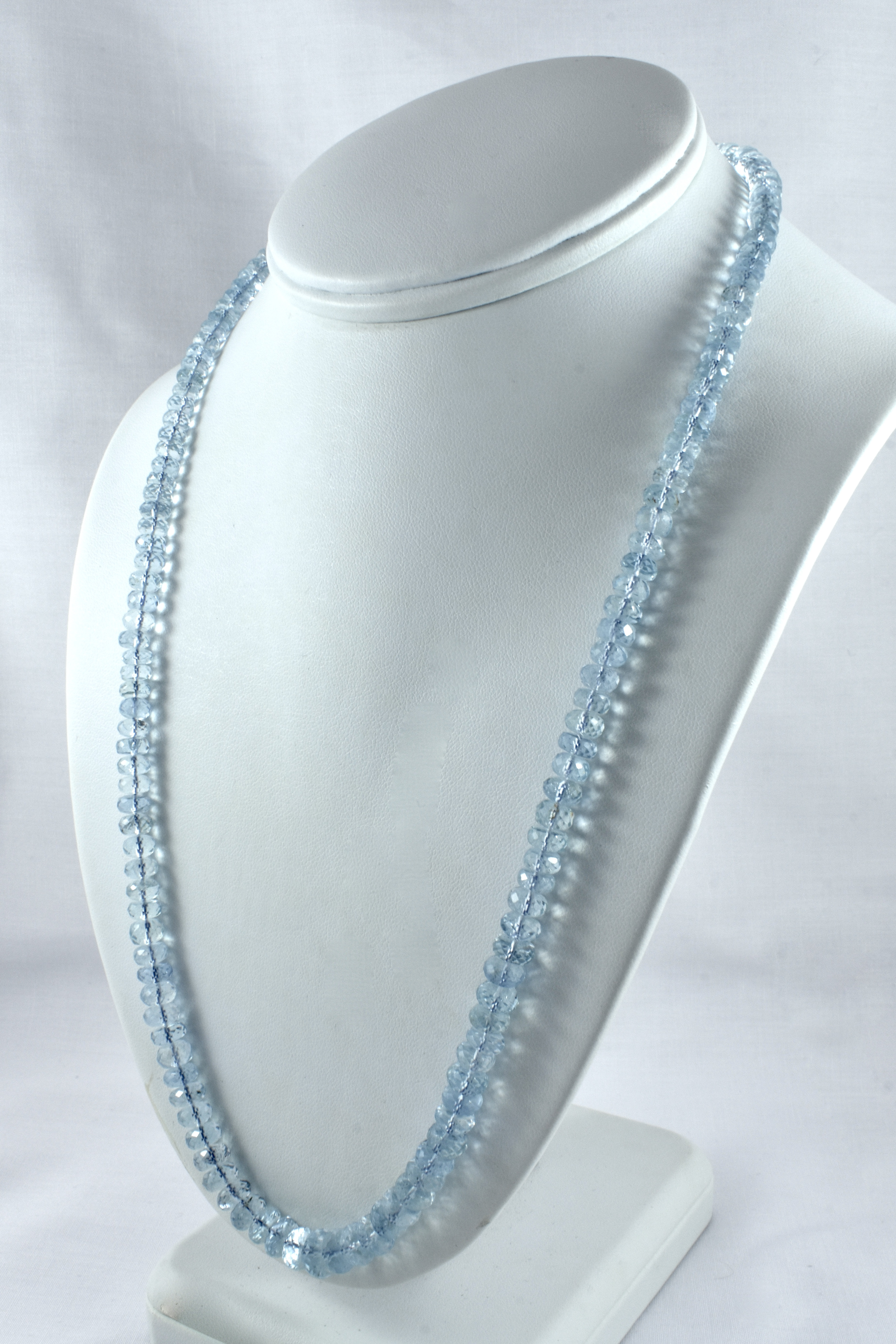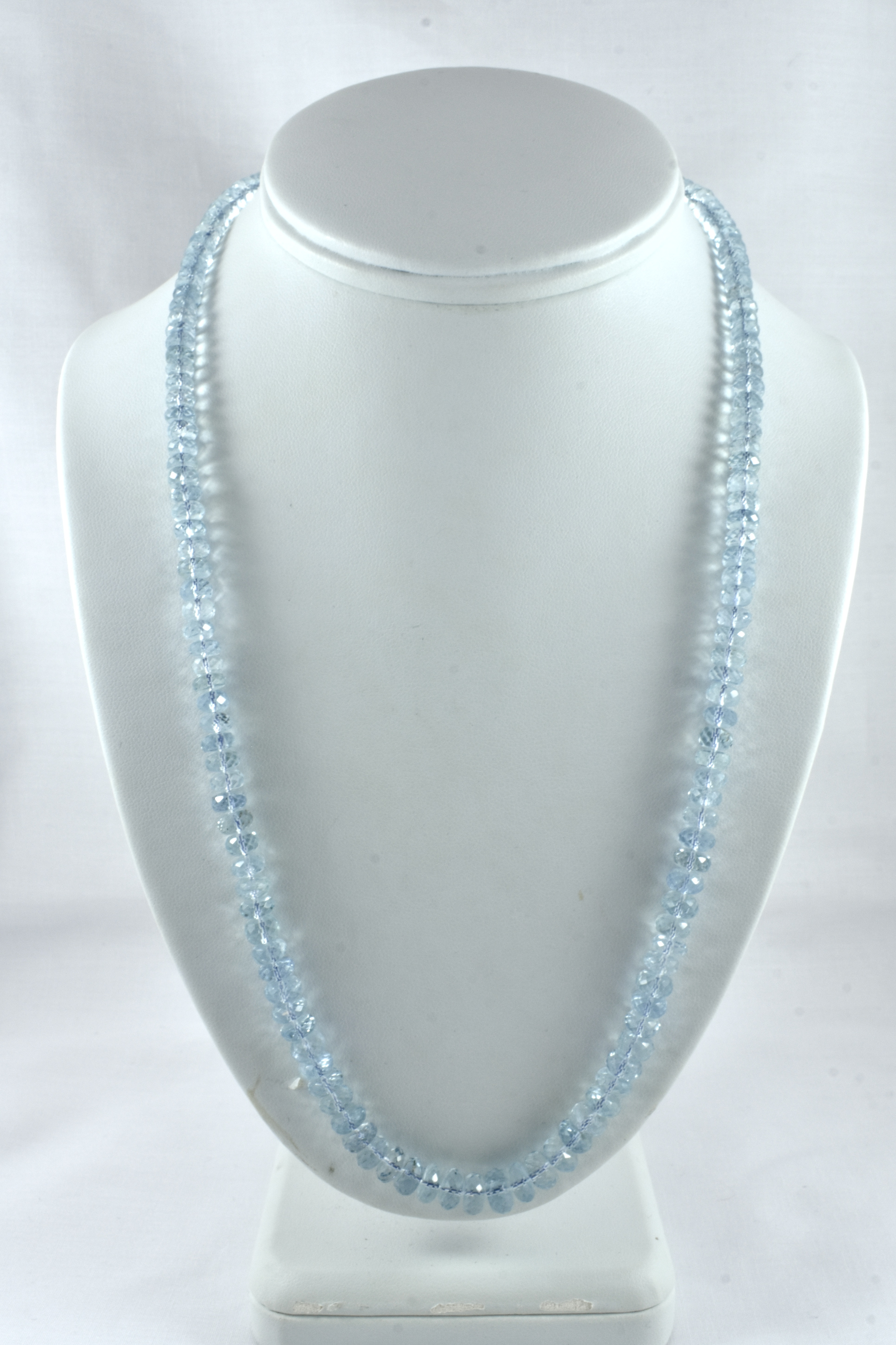 Brilliantly bright and glimmering, this 55cm long strand features a total of 158 stunning, large 8-5mm faceted disc light blue aquamarine beads finished with a 9mm round sterling silver polished ball clasp