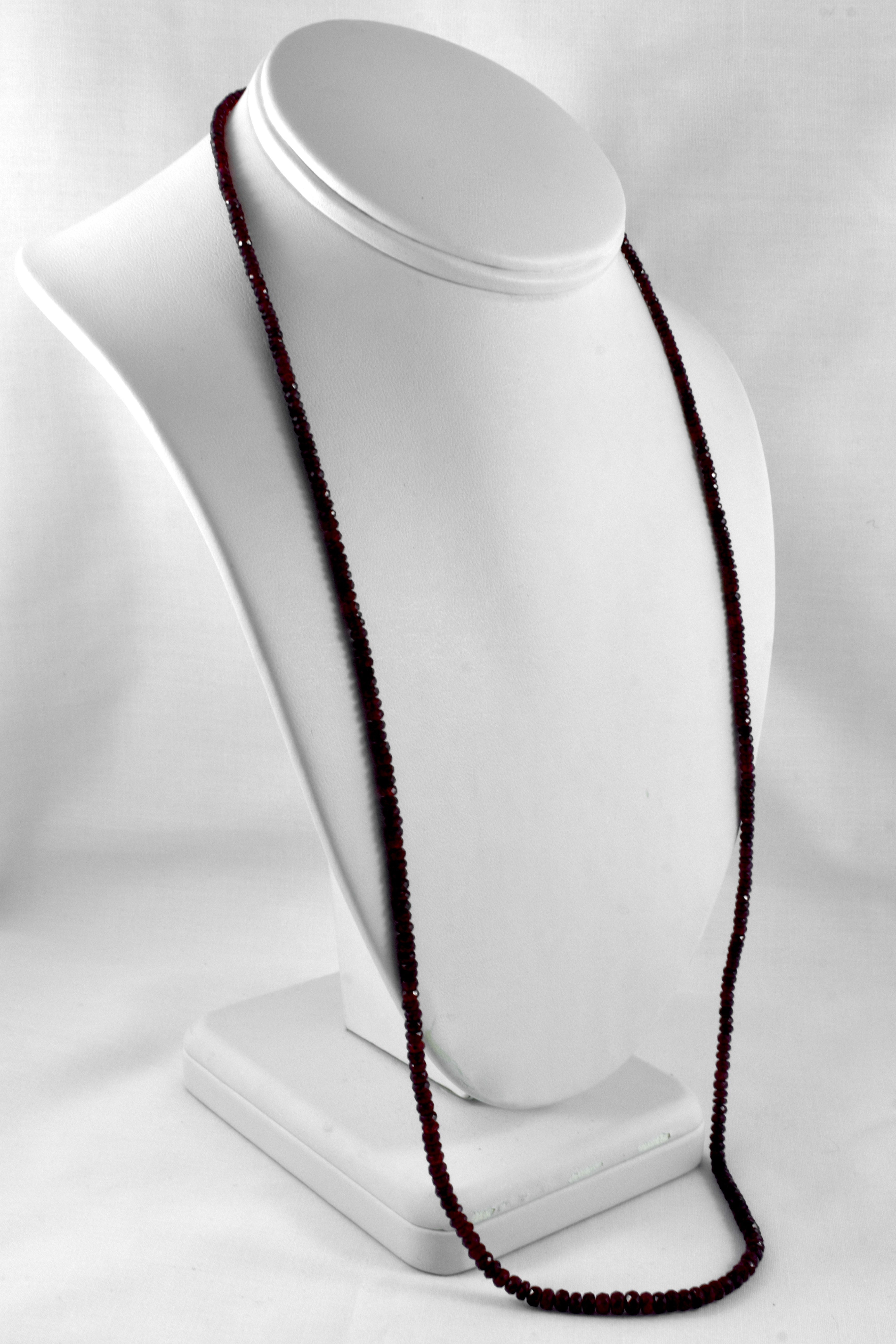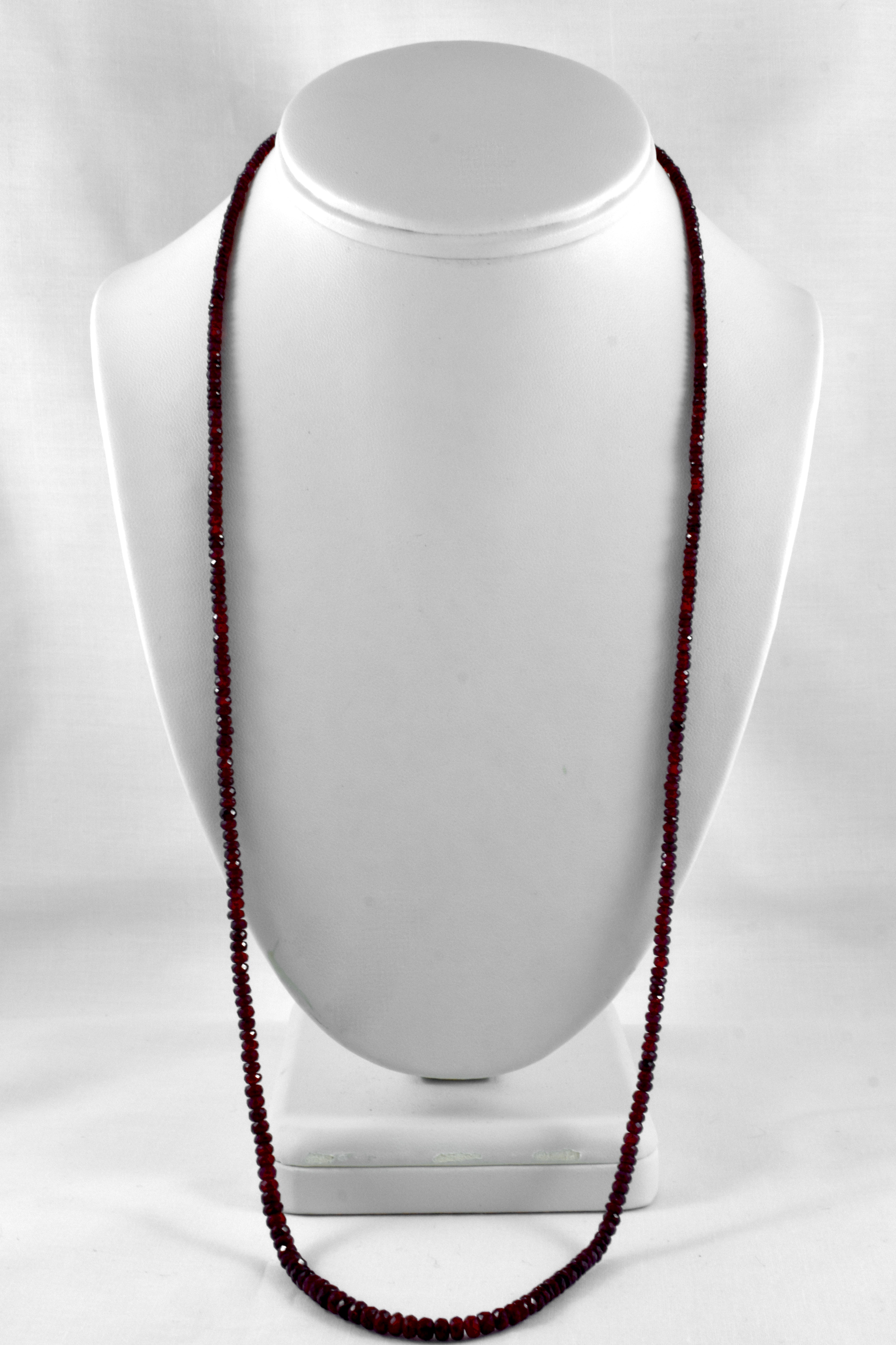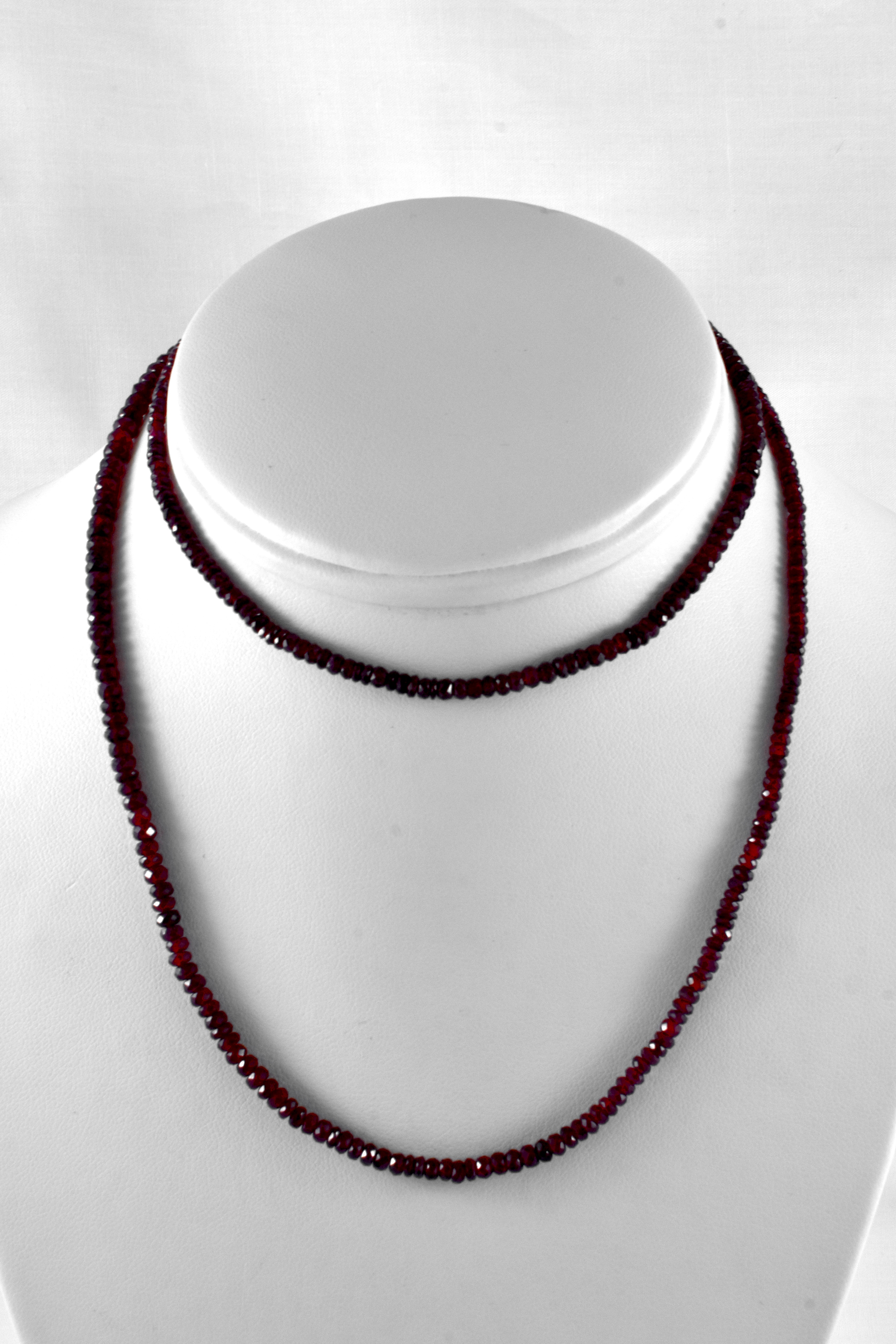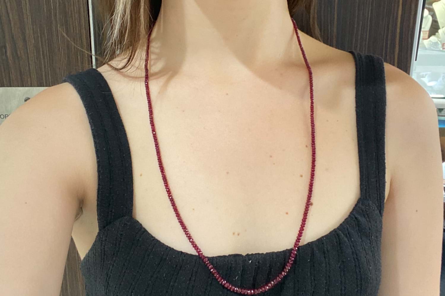 A beautiful, long strand of faceted, dark red glass filled ruby beads ranging from 2.4-4.6mm, 69cm long and finished with a 7mm round polished 9ct yellow gold ball clasp. A versatile length which can be worn long or wrapped around with total of 372 rubies