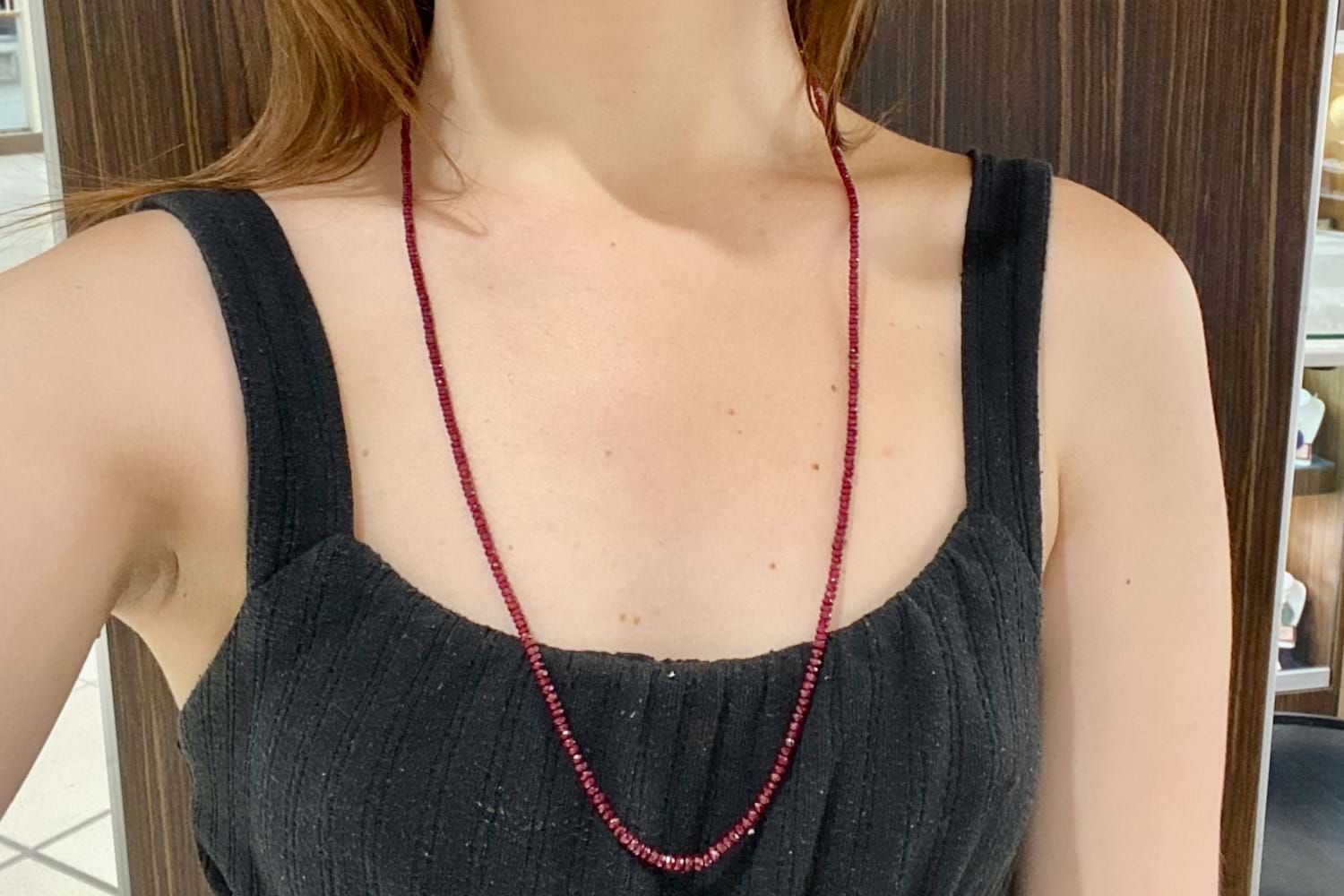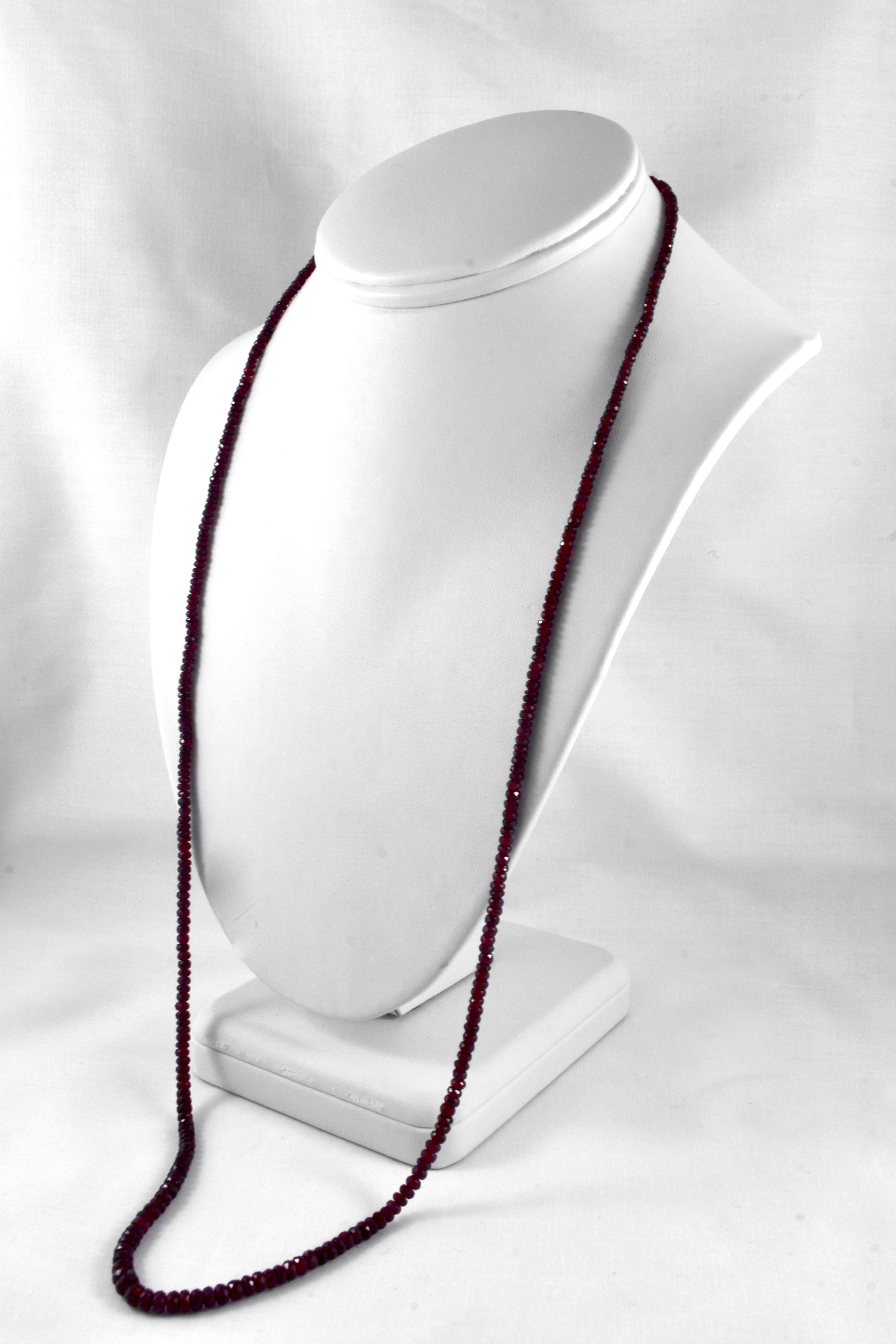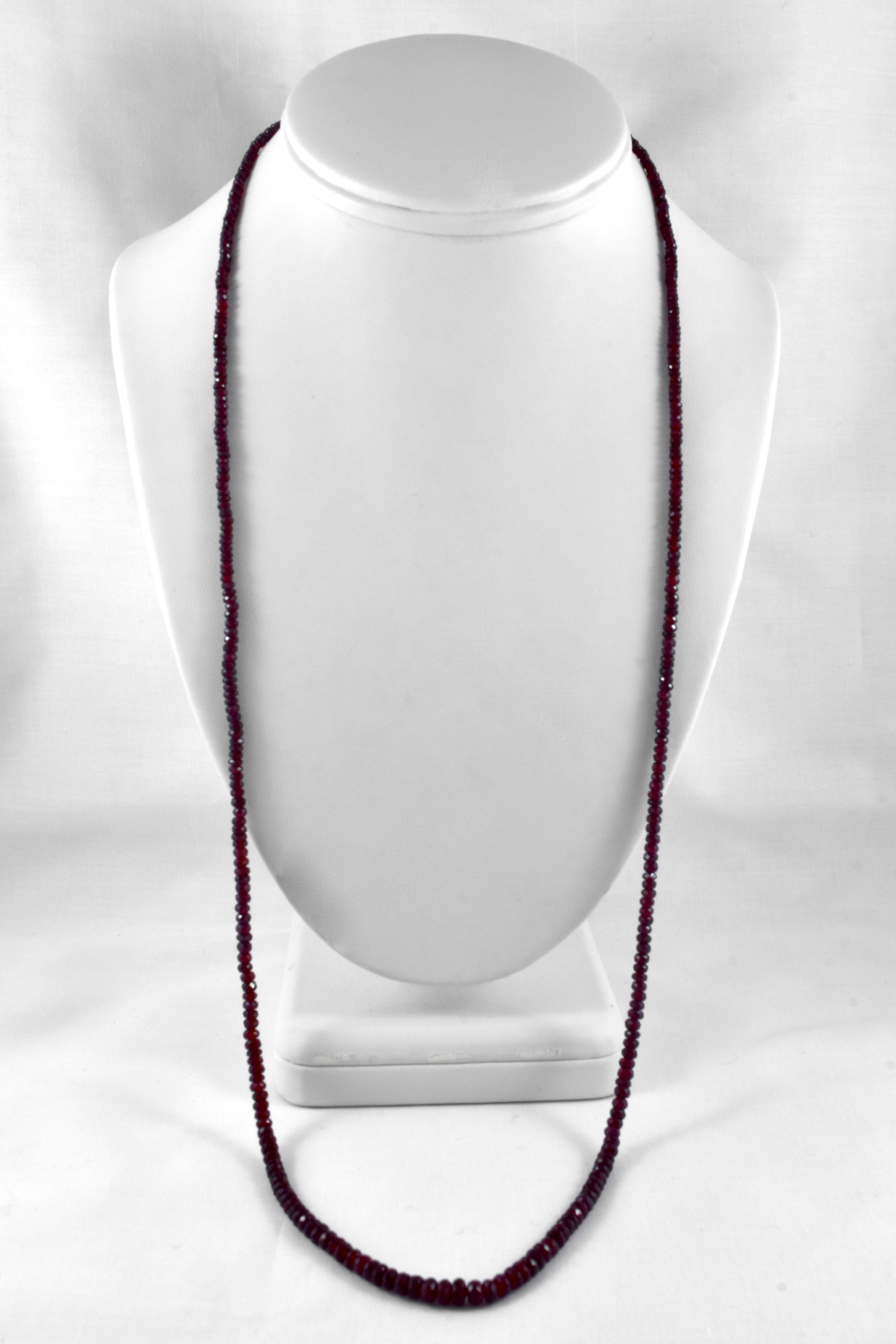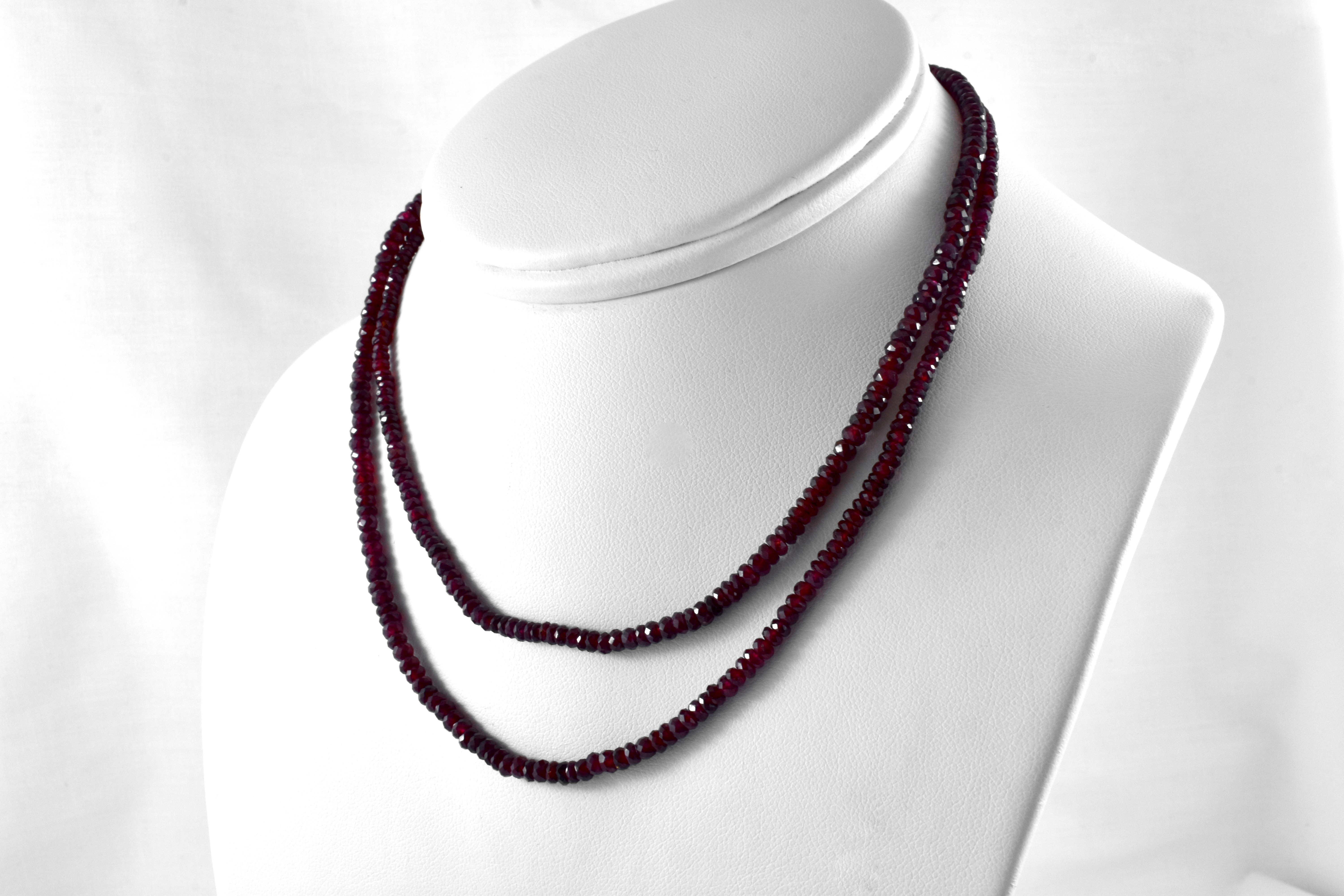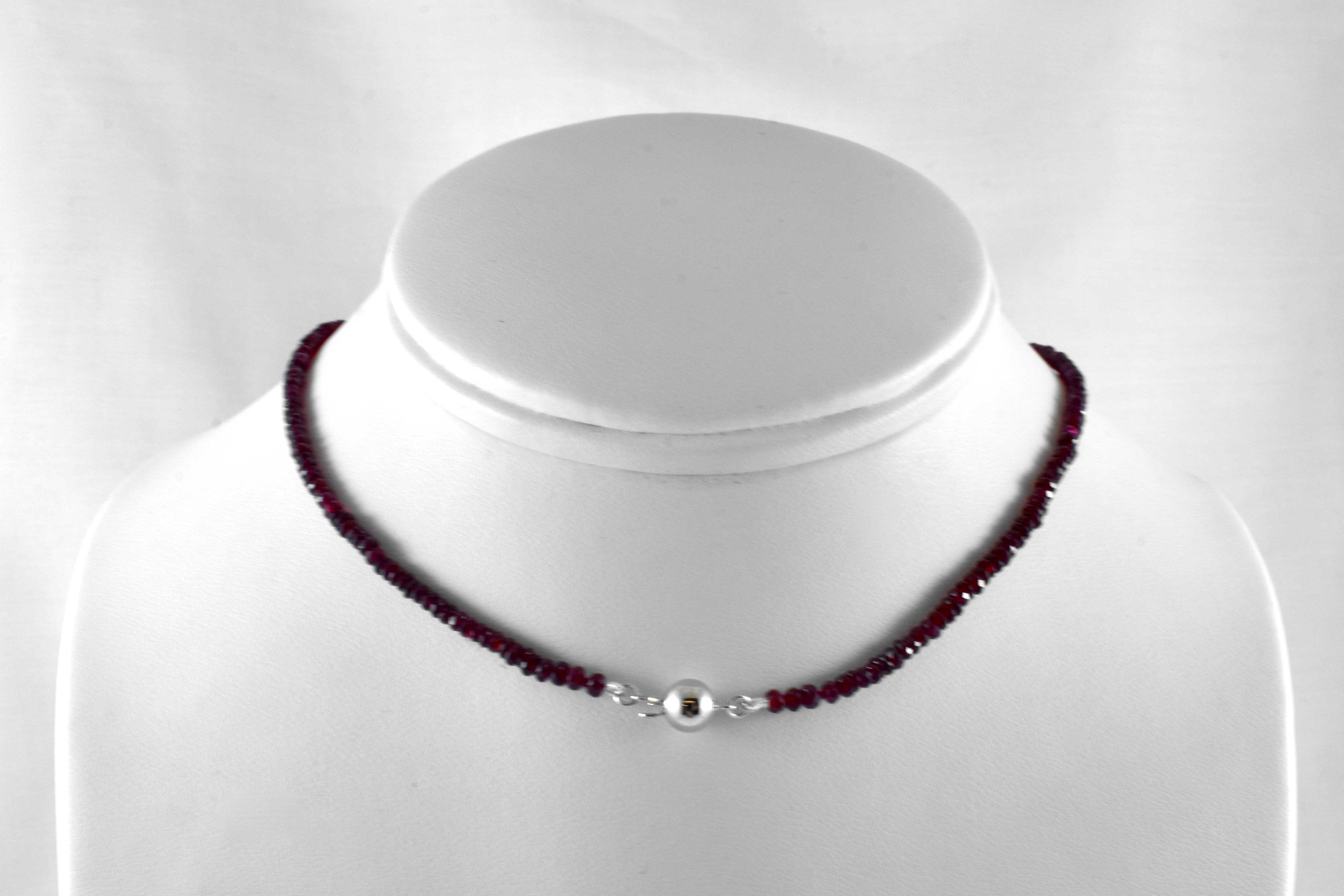 A long strand of 2.4-4.6mm round, faceted glass filled dark red ruby beads, 71cm long and finished with a 6mm round sterling silver polished ball clasp. Can be worn long or wrapped around