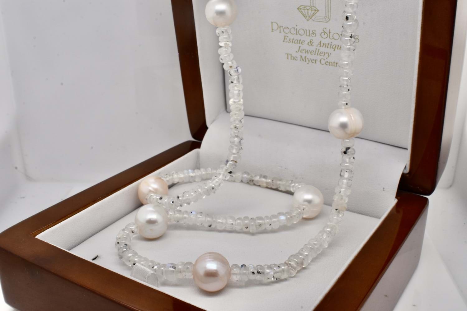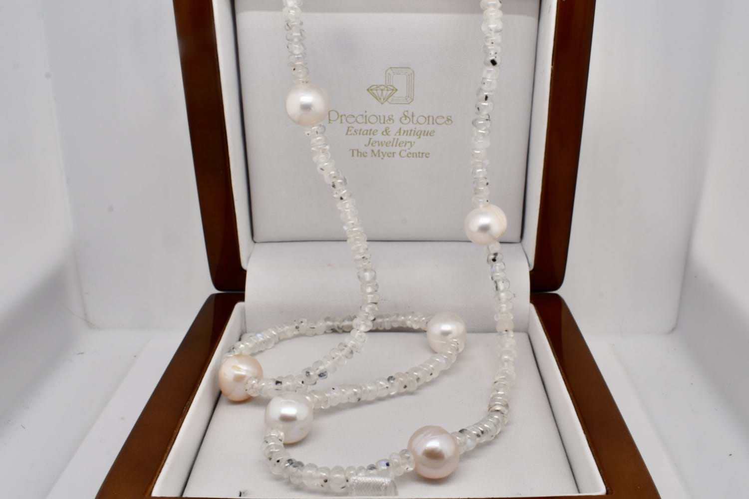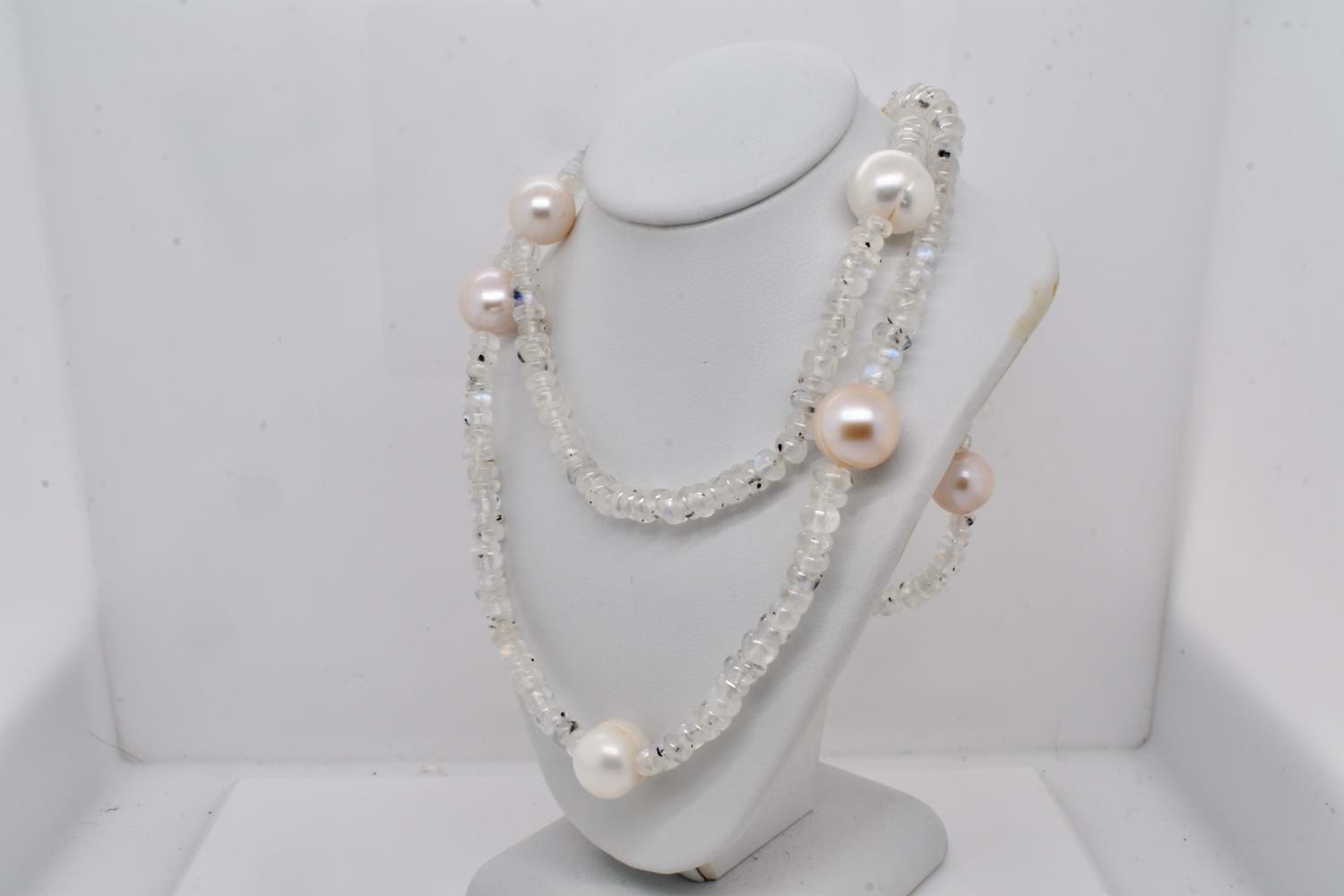 A pretty, pastel strand of faceted white moonstone, with a total of ten 10-11mm round pink freshwater pearls at regular intervals. Strand is 73cm and can be worn long or wrapped around