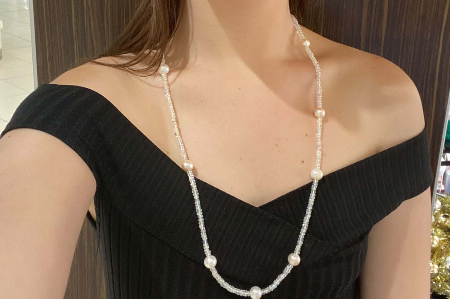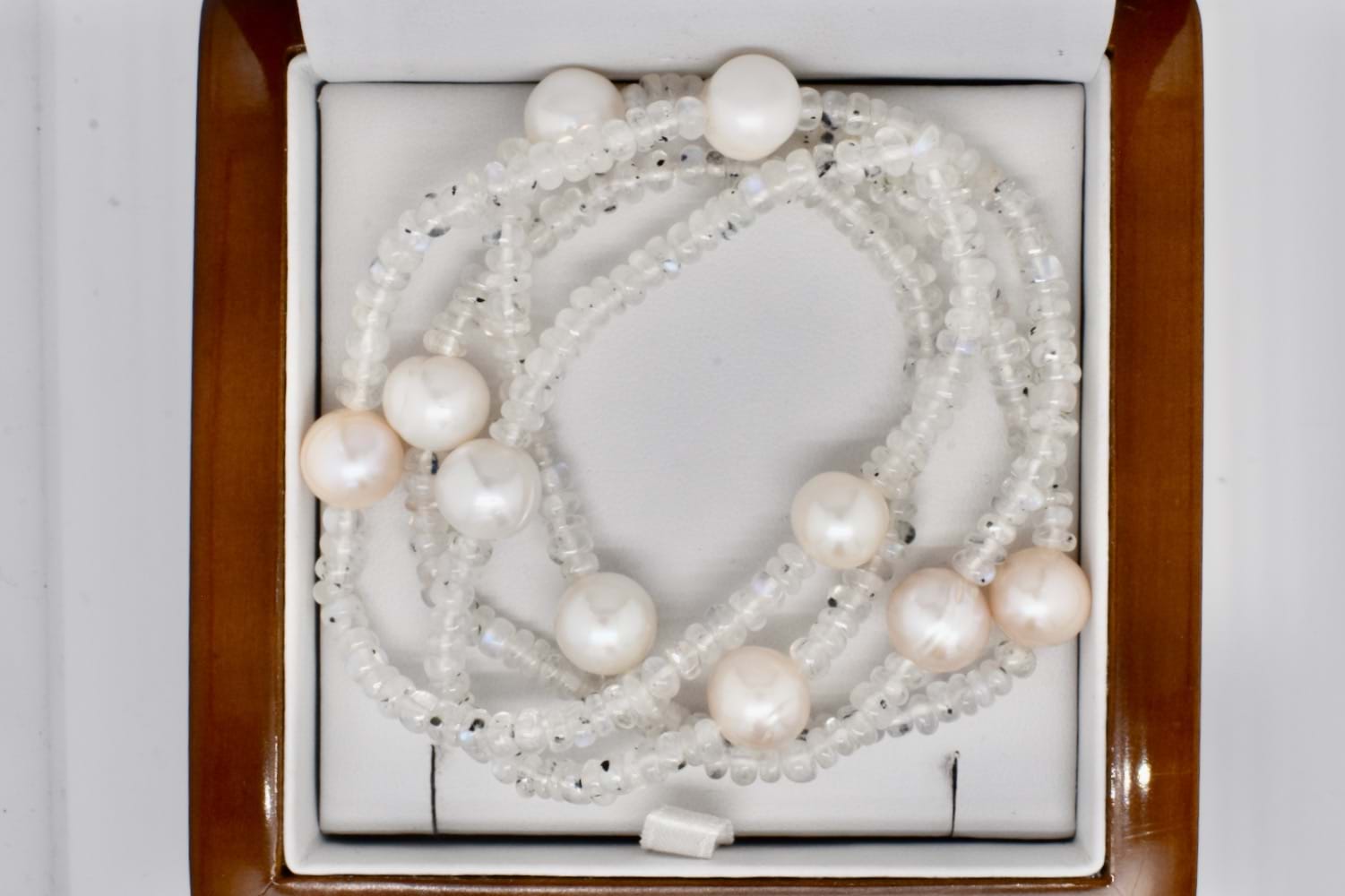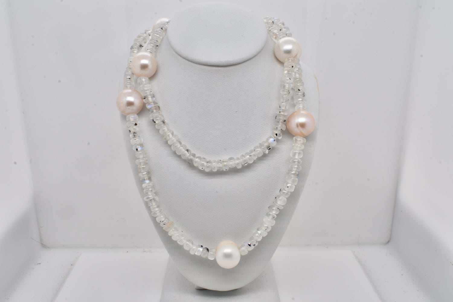 A pretty, pastel strand of faceted white moonstone, with a total of ten 10-11mm round pink freshwater pearls at regular intervals. Strand is 73cm and can be worn long or wrapped around