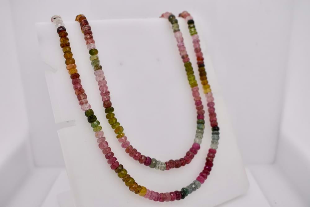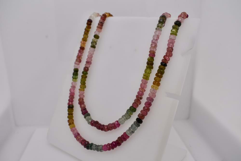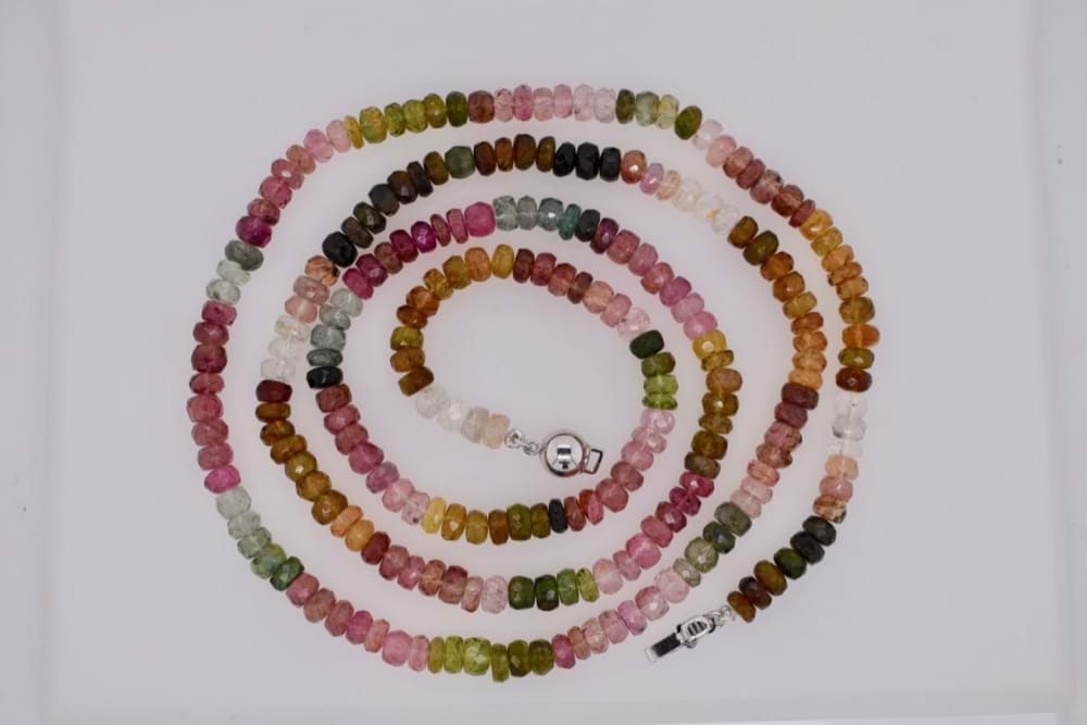 Multicoloured Tourmaline ranging in colour from near colourless pink to mid dark pink, near colourless green to mid dark green and near colourless yellow to mid dark yellow strung on a necklace with a sterling silver ball clasp. Finished length is 75cm