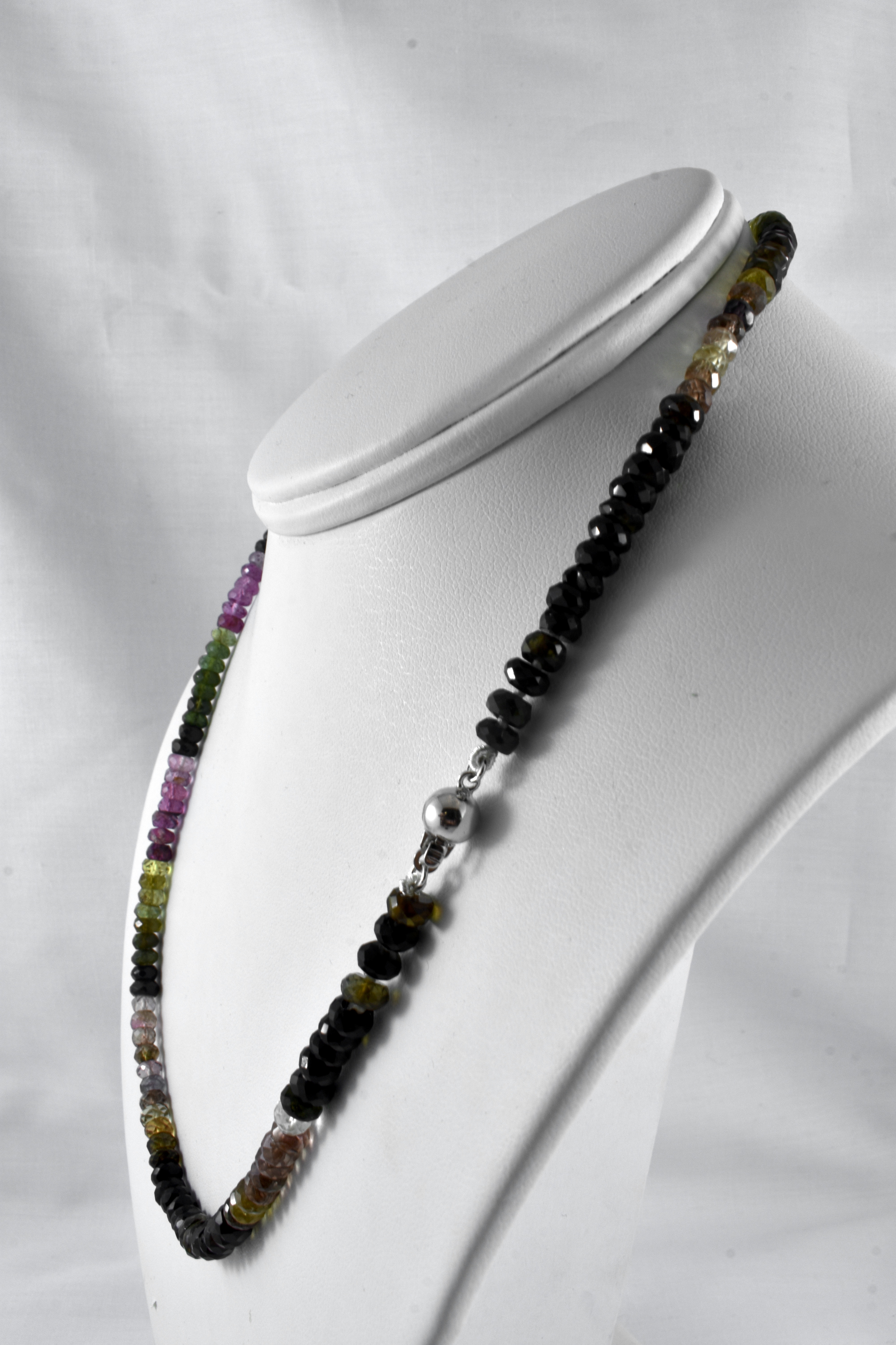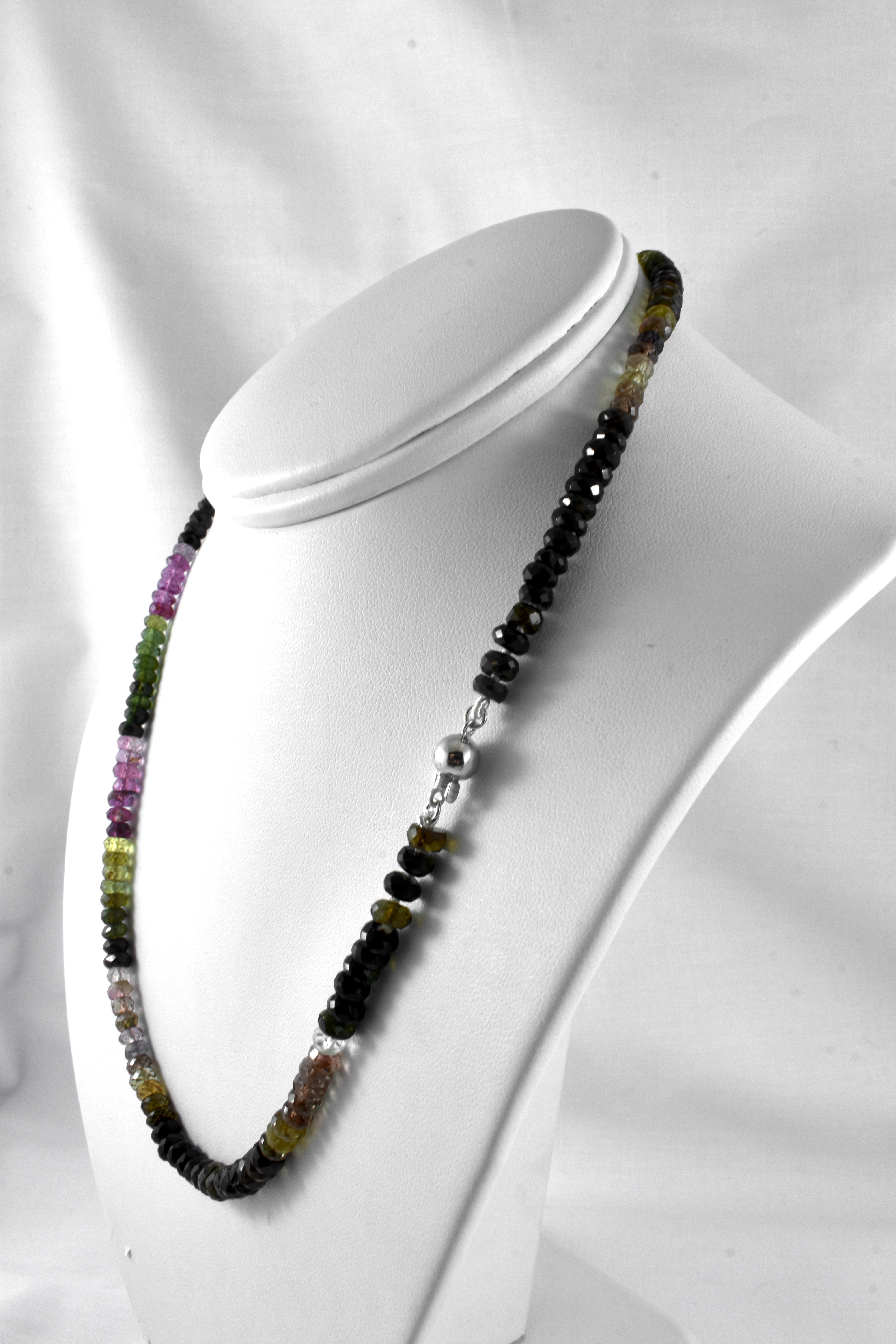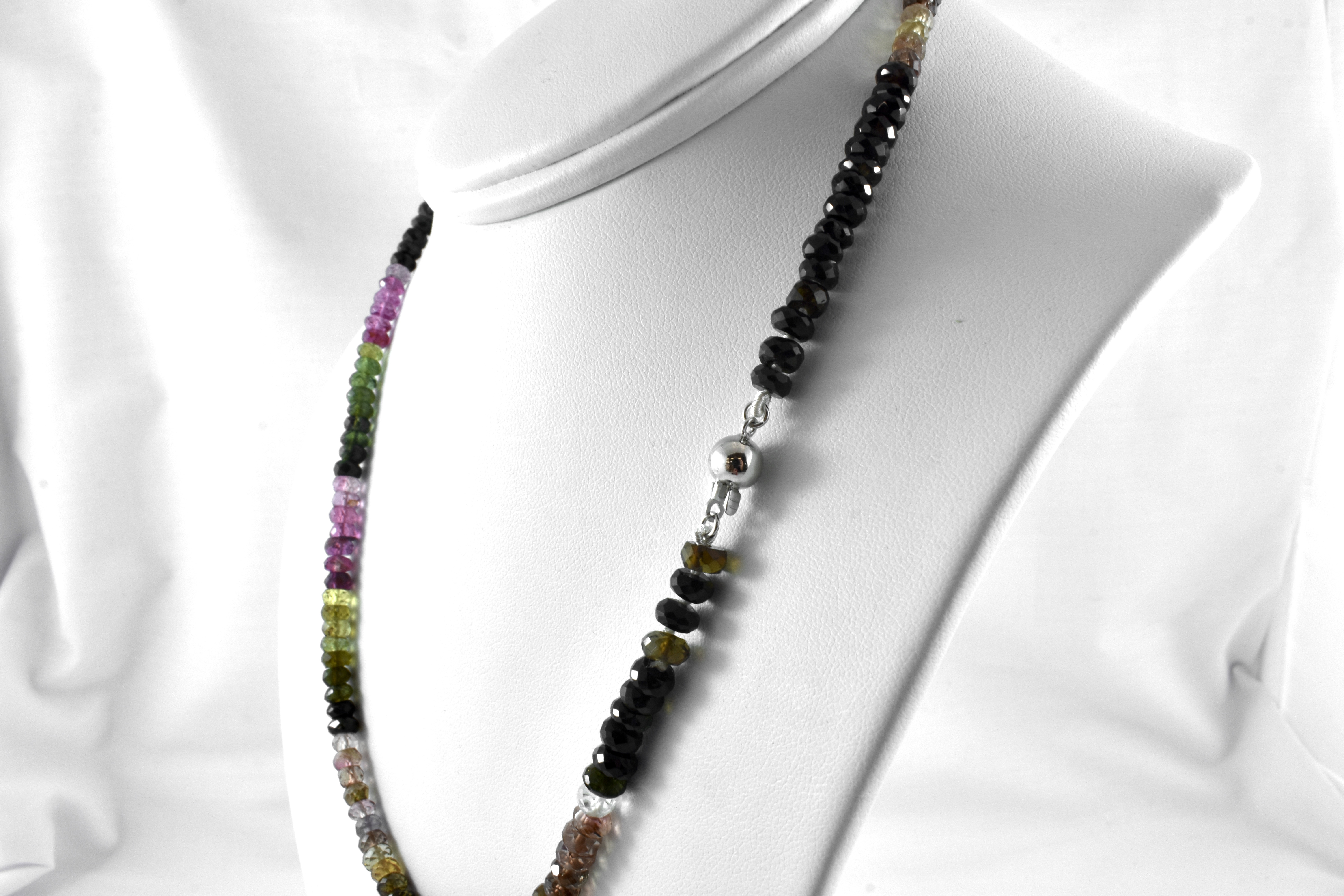 A gorgeous multicoloured strand of faceted Afghan tourmalines measuring 4.8-5.3mm in rainbow tones of yellow, green, blue, pink and dark brown, white, grey and black. Strand is 45cm long with a sterling silver ball clasp