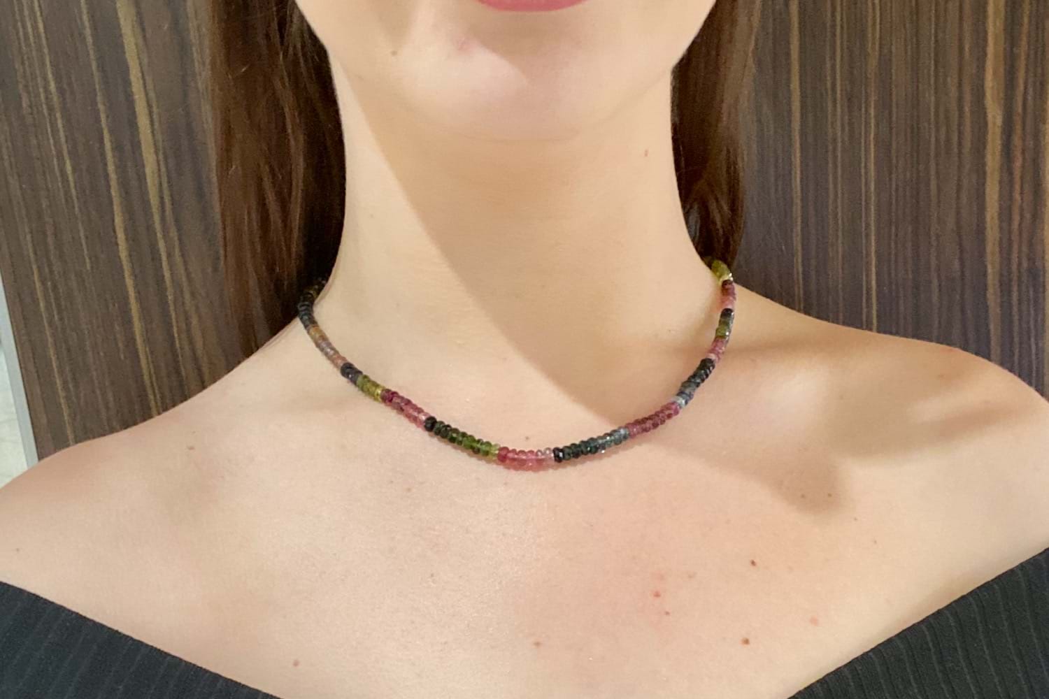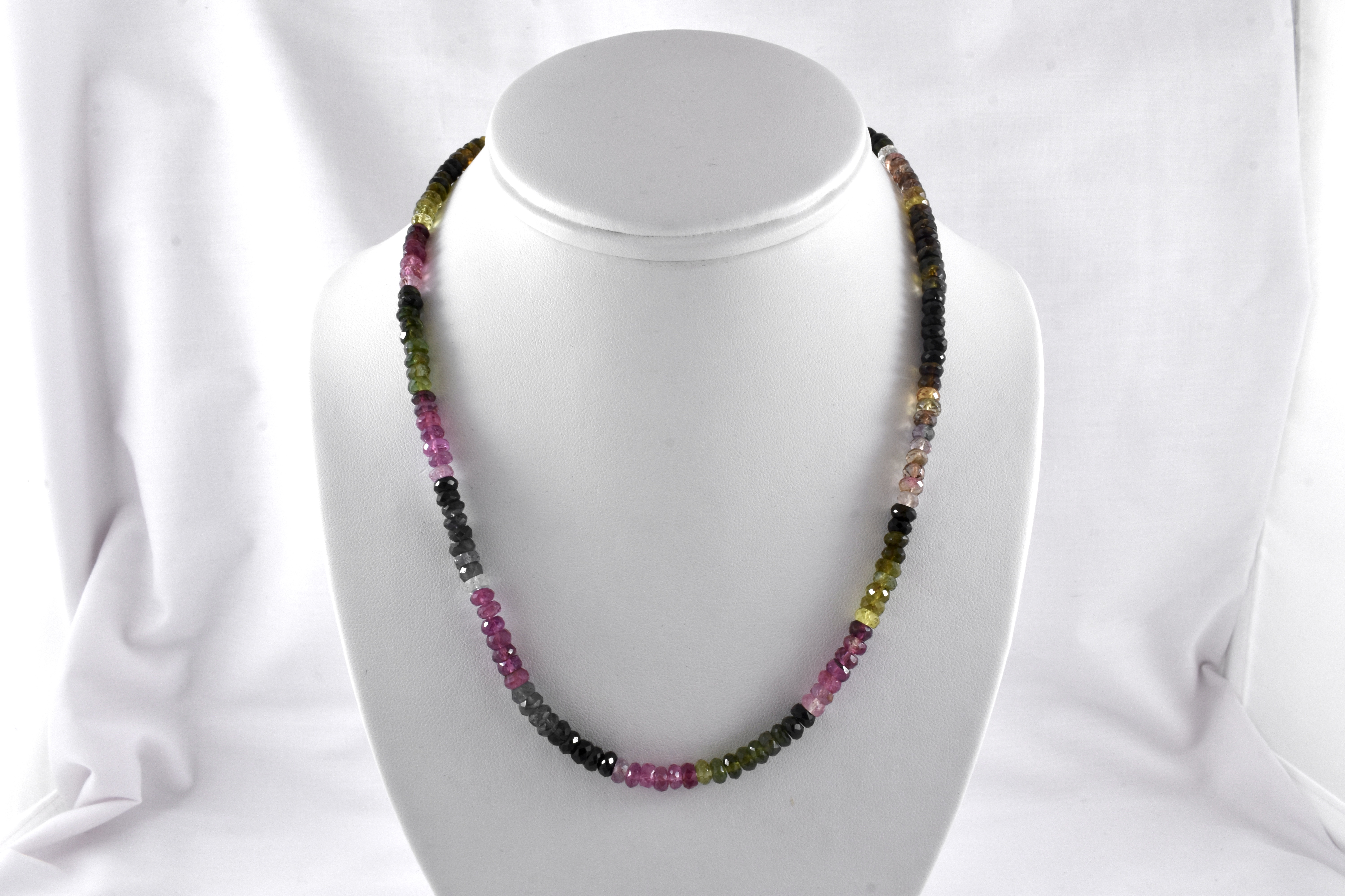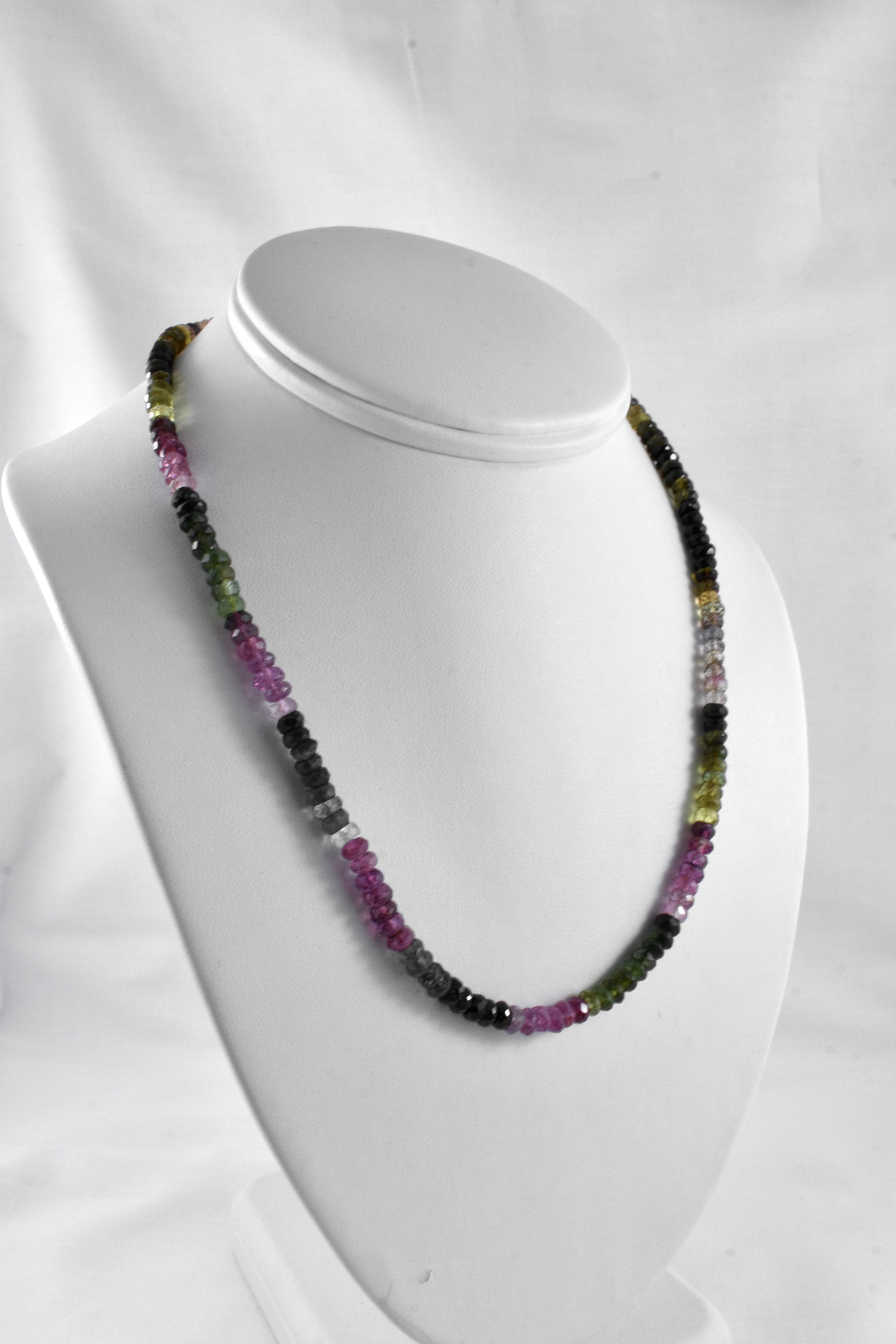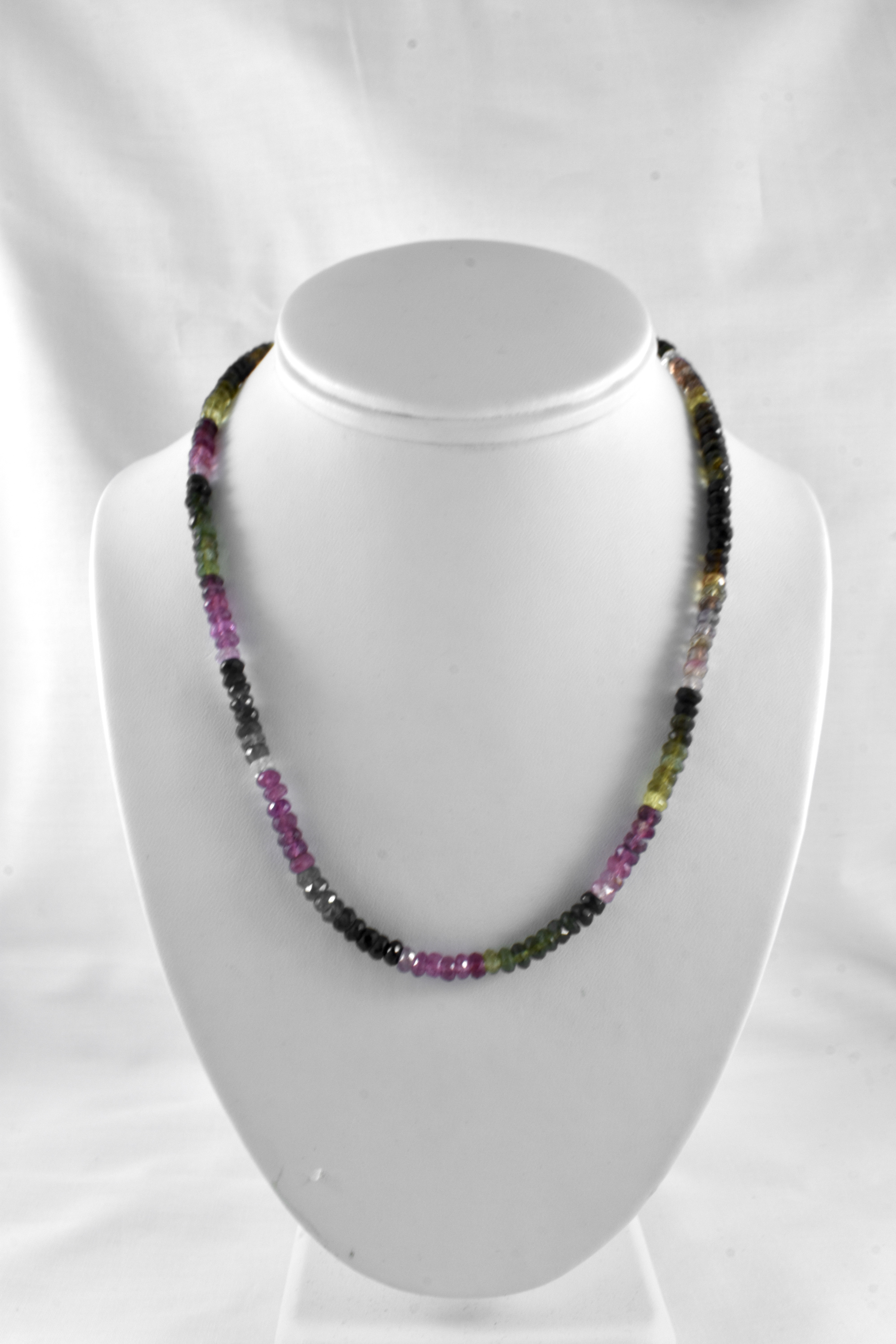 A gorgeous multicoloured strand of faceted Afghan tourmalines measuring 4.8-5.3mm in rainbow tones of yellow, green, blue, pink and dark brown, white, grey and black. Strand is 45cm long with a sterling silver ball clasp