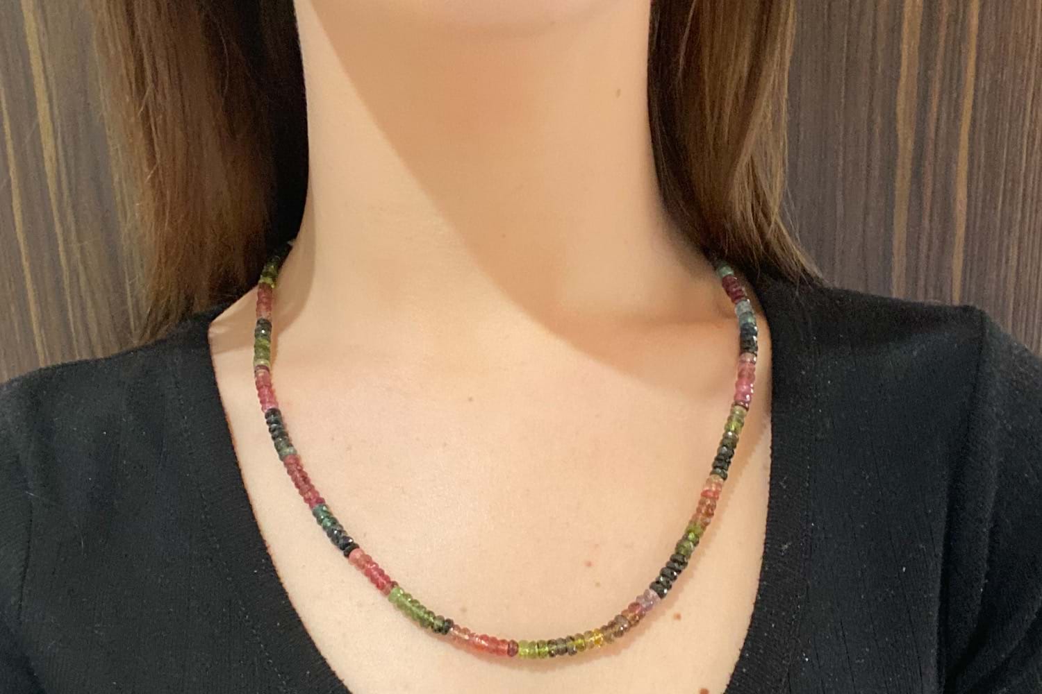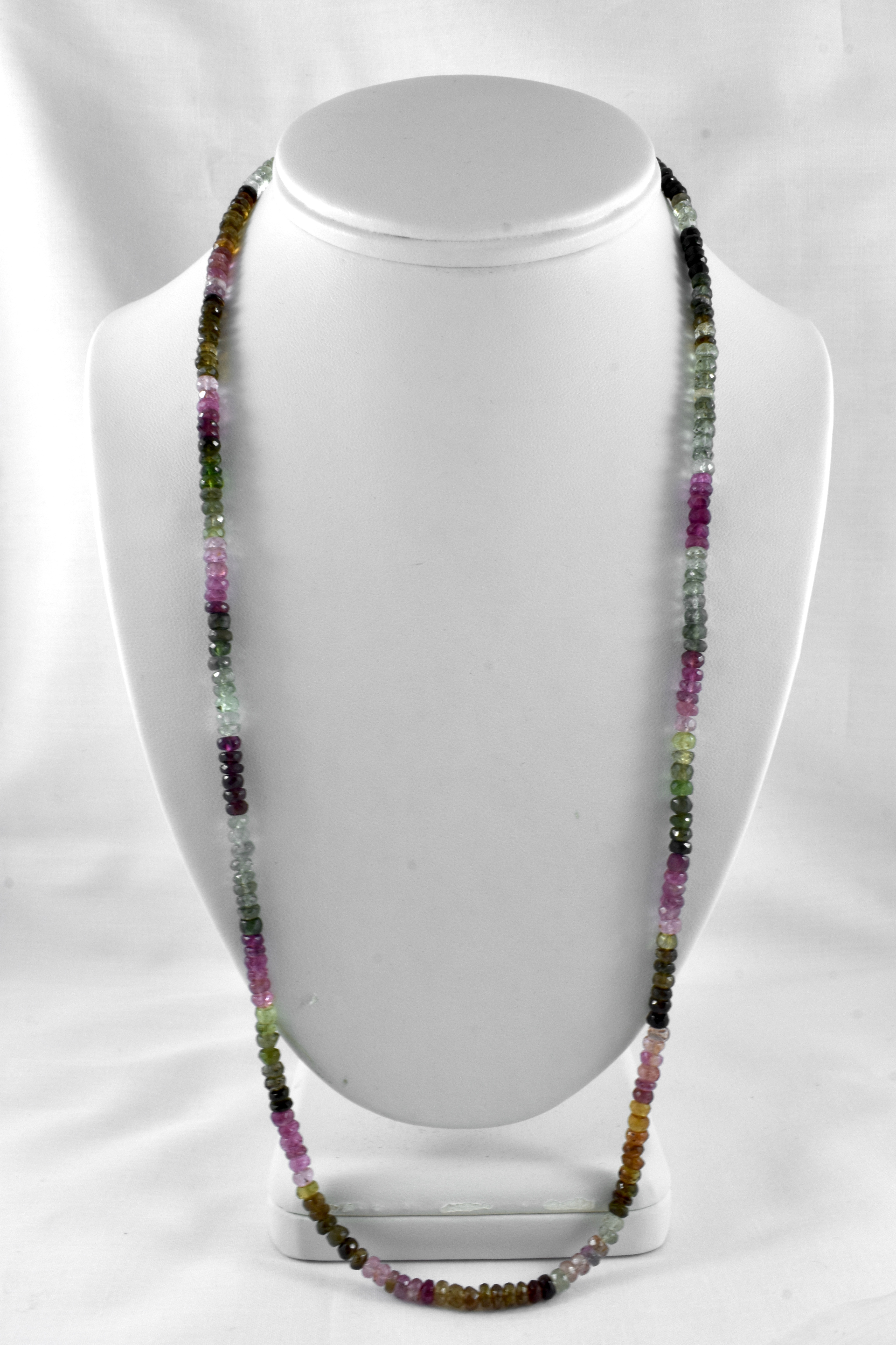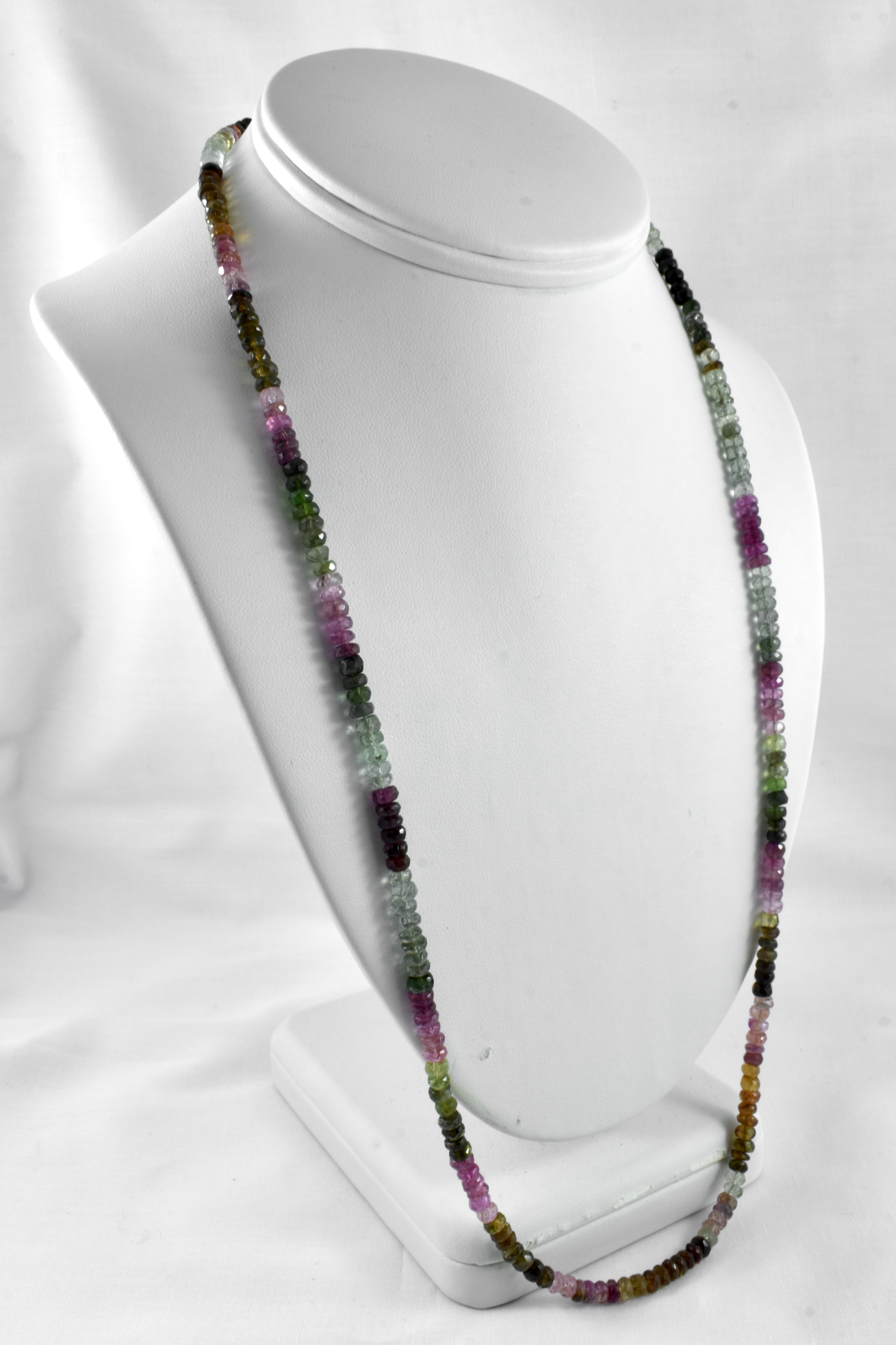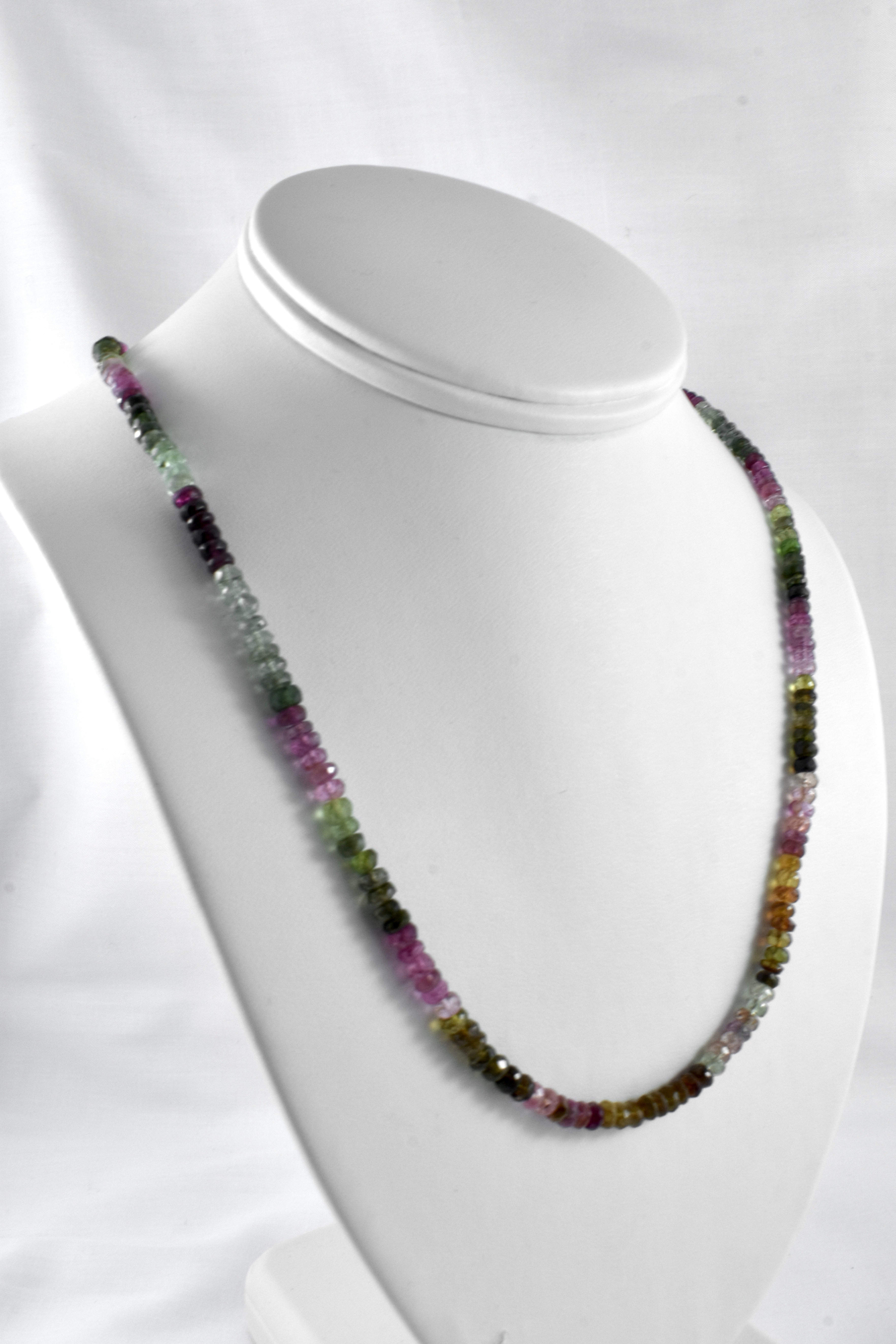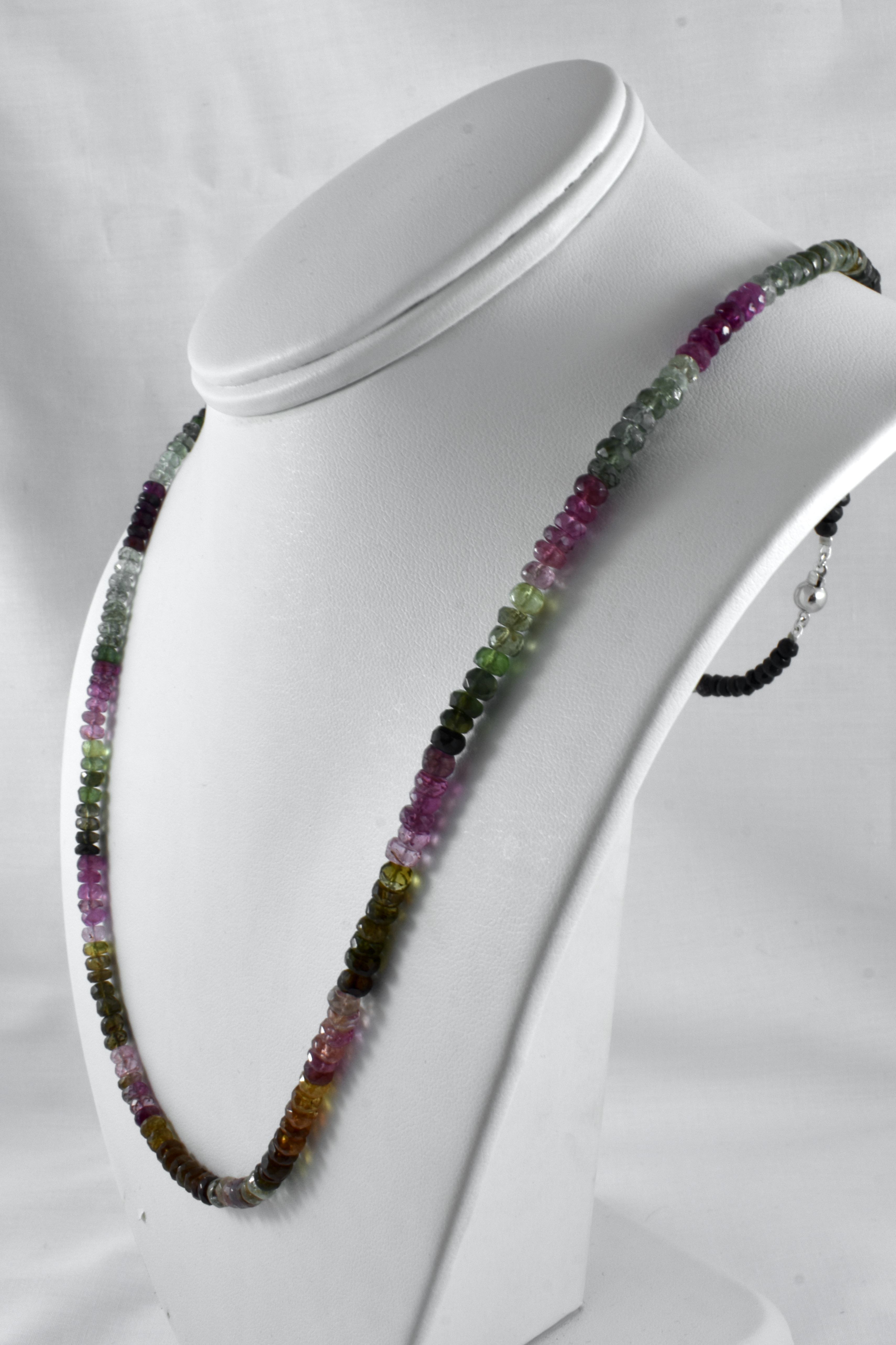Stunning strand of 4.3-4.5mm faceted multicoloured Afghan tourmalines in tones of yellow, green, blue, pink and dark brown, white, grey and black. Strand is 64cm long with a sterling silver ball clasp