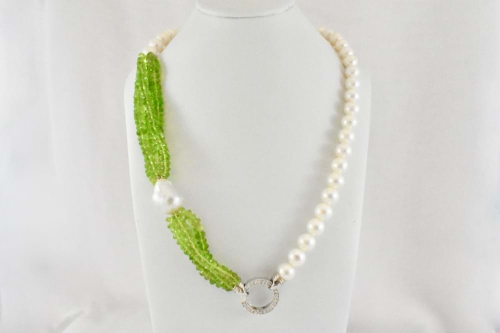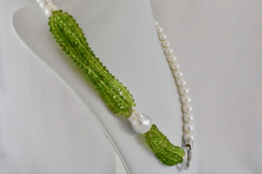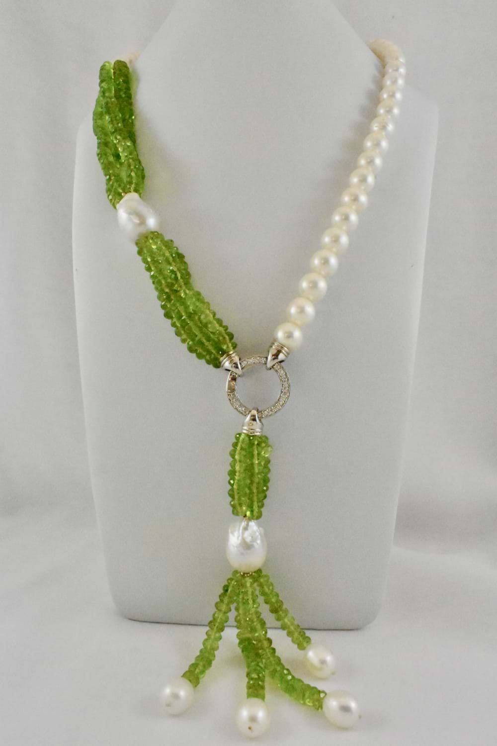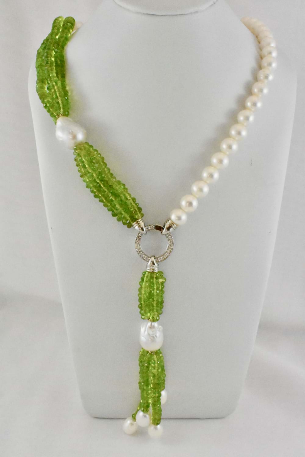 Absolute stunning! This versitile necklace is made up of a half strand of creamy white fresh water pearls and a half multi strand of faceted, lime green, peridot beads, each meeting at a circular sterling silver cubic zirconia set clasp. With a striking removable tassle suspended from the clasp of peridot beads with baroque pearl ends this necklace is sure to catch everyones attention.