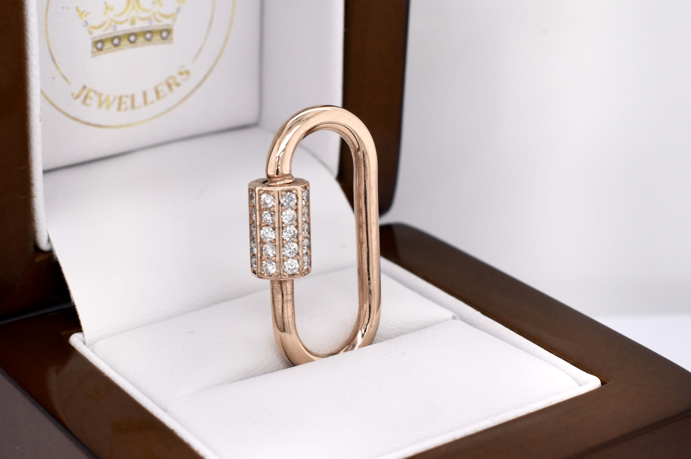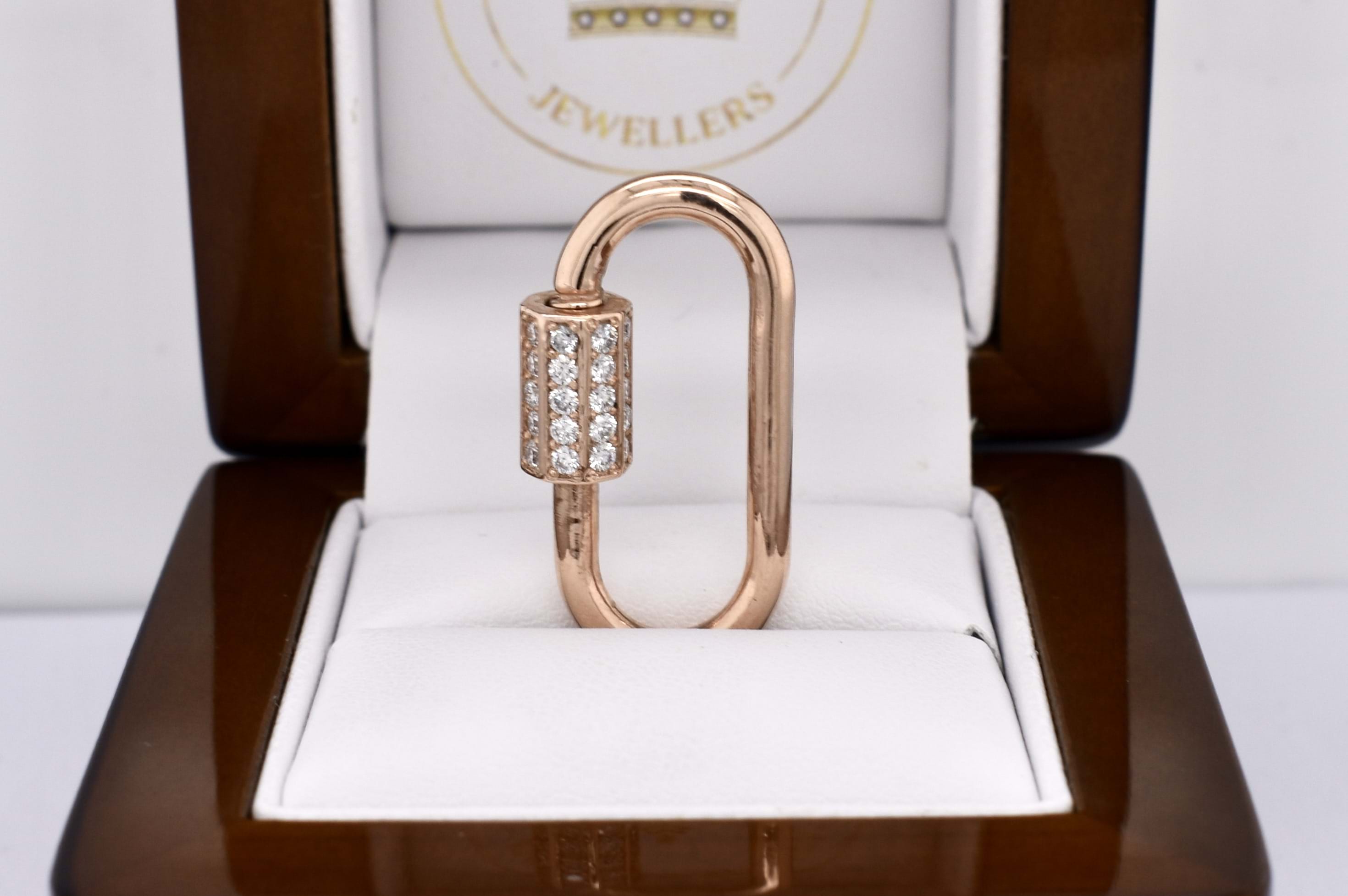 A contemporary and stylish statement accessory with a bit of sparkle, this oval shaped carabiner is crafted in 9ct rose gold with forty 1.70mm round GH SI diamonds set into the barrel. This has been designed as a multipurpose piece which can act primarily as a clasp but also as a linking or extending accessory; to hang a pendant or enhancer from or even be a pendant itself. Pair it with a rose gold chain for continuity or white gold for a bold contrast. Carabiner measures approx. 30x15mm. Independent Valuation Supplied.