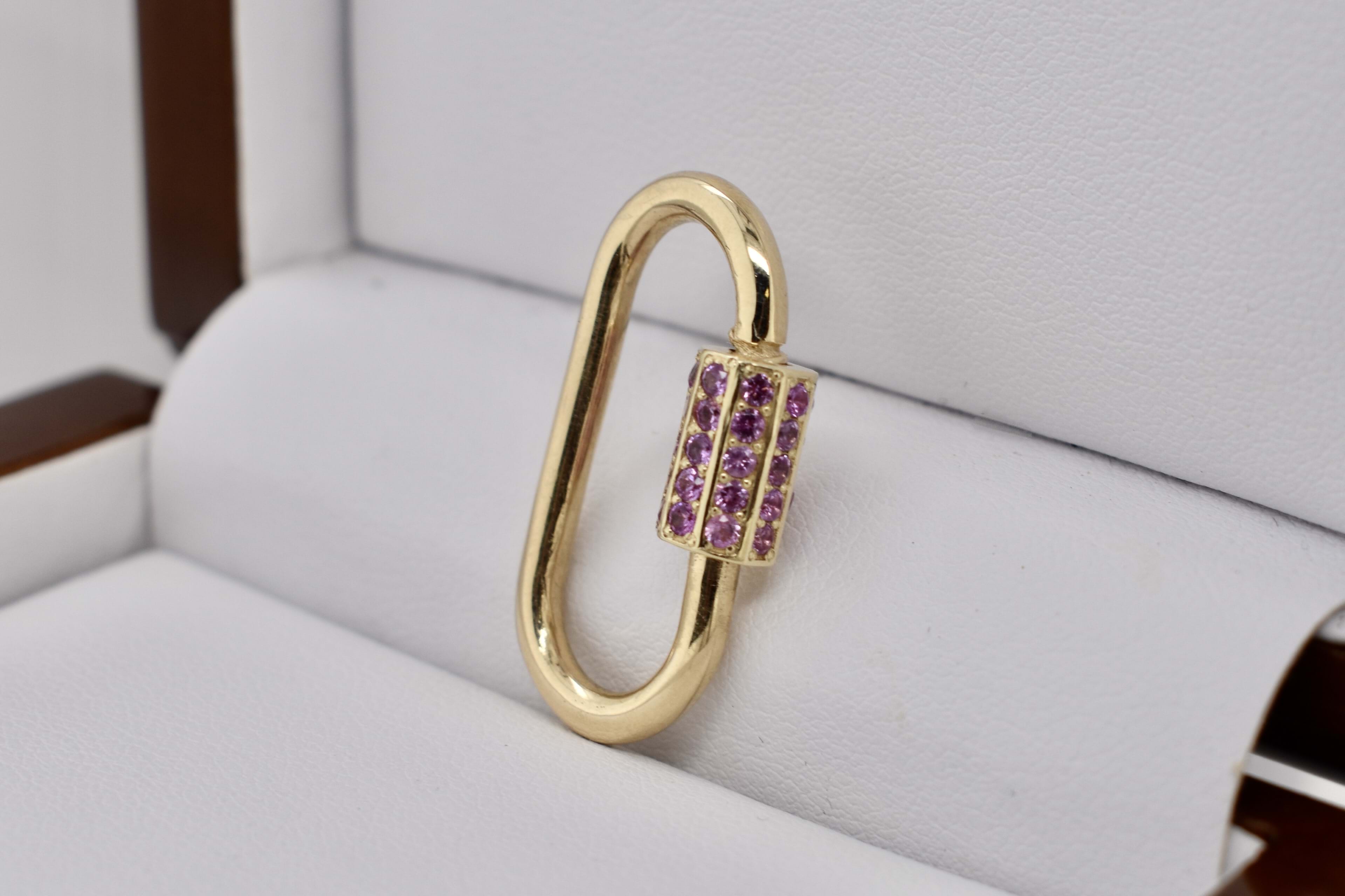 A contemporary and stylish statement accessory with a pop of colour, this oval shape carabiner is crafted in 9ct yellow gold with forty 1.5mm round pink sapphires set into the barrel. This has been designed as a multipurpose piece which can act primarily as a clasp but also as a linking or extending accessory; to hang a pendant or enhancer from or even be a pendant itself. Pair it with a yellow gold chain for continuity or white gold for a bold contrast. Carabiner measures approx. 30x15mm. Independent Valuation Supplied.