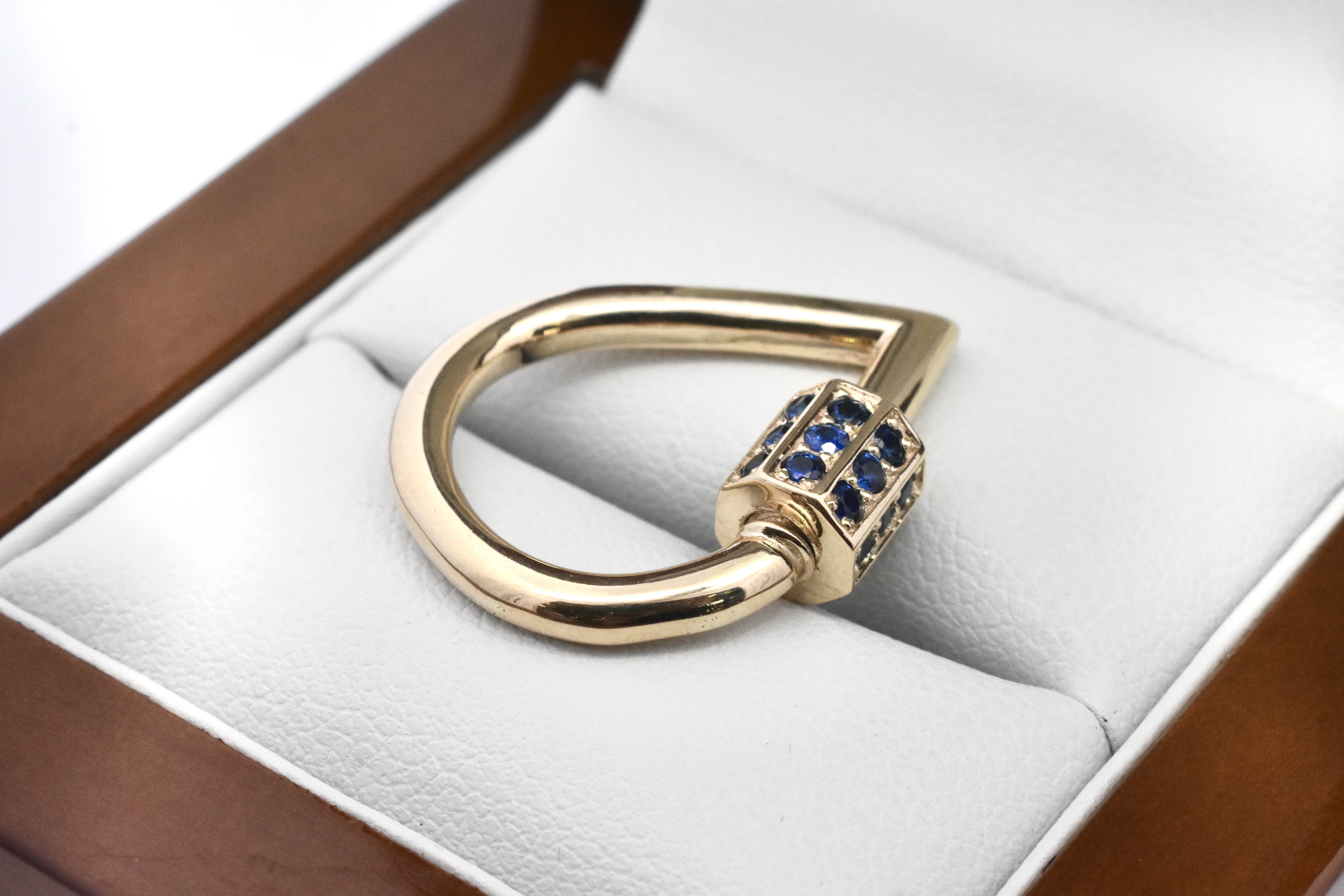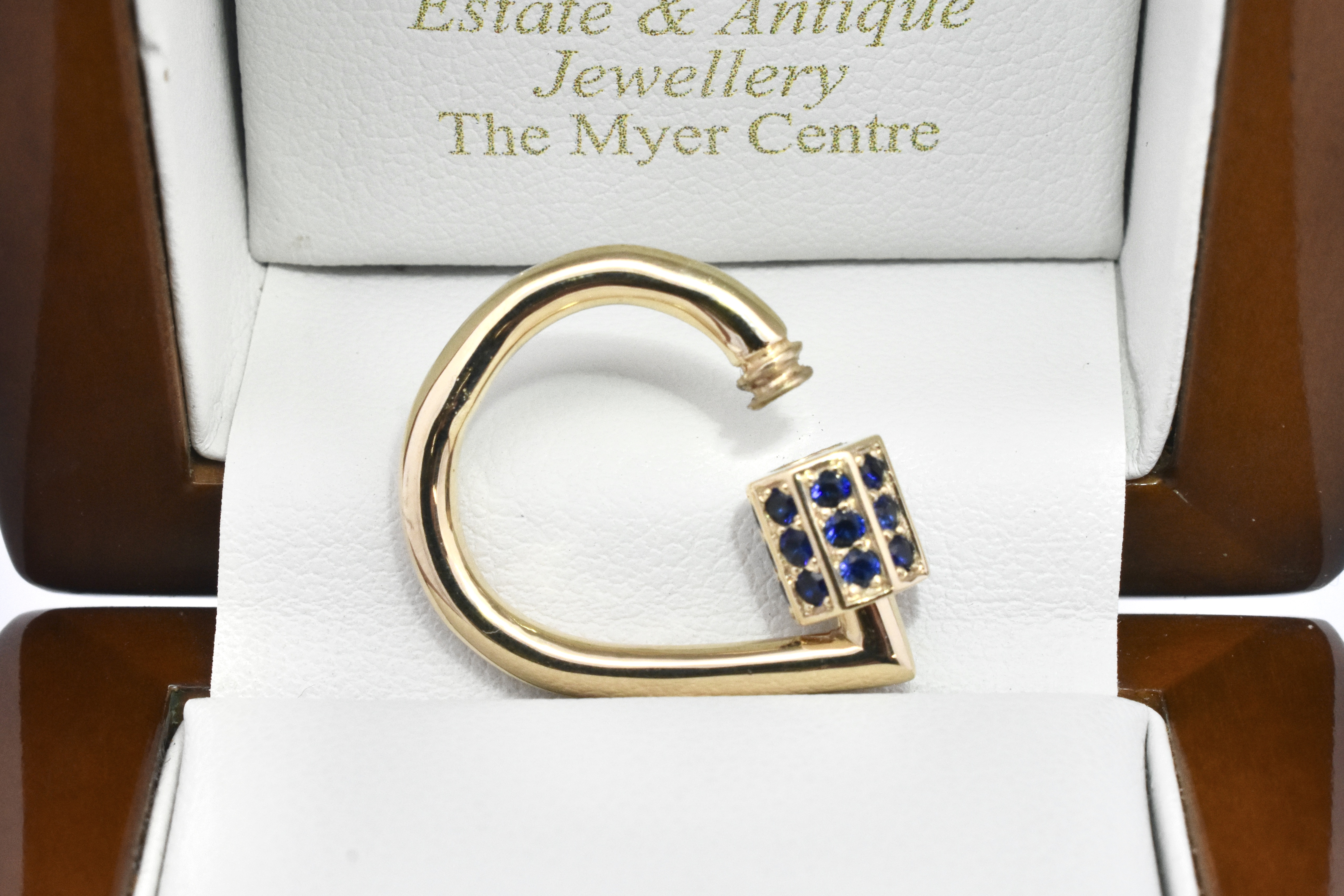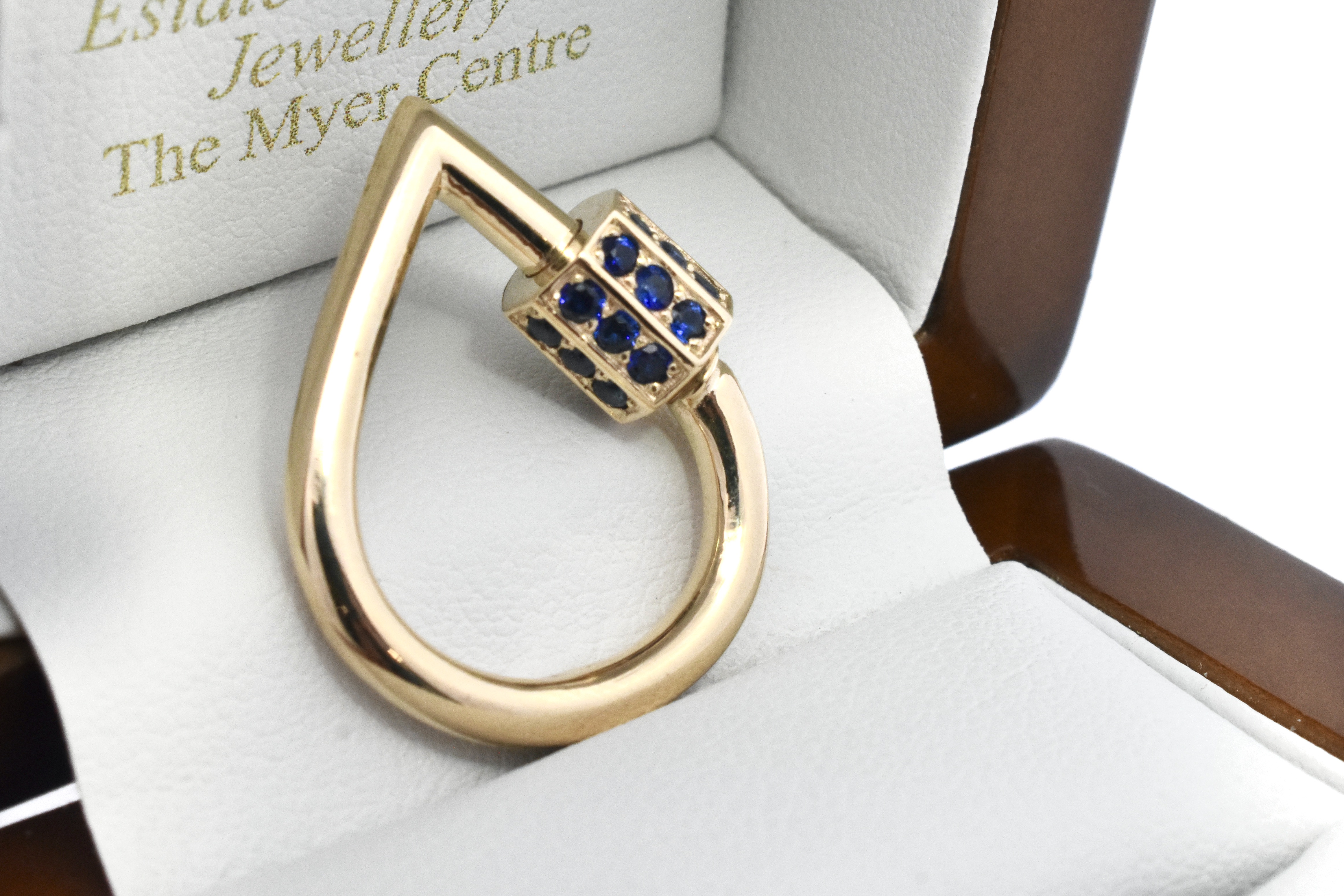 A contemporary and stylish statement accessory with a pop of colour, this teardrop shape carabiner is crafted in 9ct yellow gold with 24 1.75mm Royal Blue Sapphires set into the barrel. This has been designed as a multipurpose piece which can act primarily as a clasp but also as a linking or extending accessory; to hang a pendant or enhancer from or even be a pendant itself. Pair it with a yellow gold chain for continuity or white gold for a bold contrast. Carabiner measures approx. 25 x 20mm. Independent Valuation Supplied.