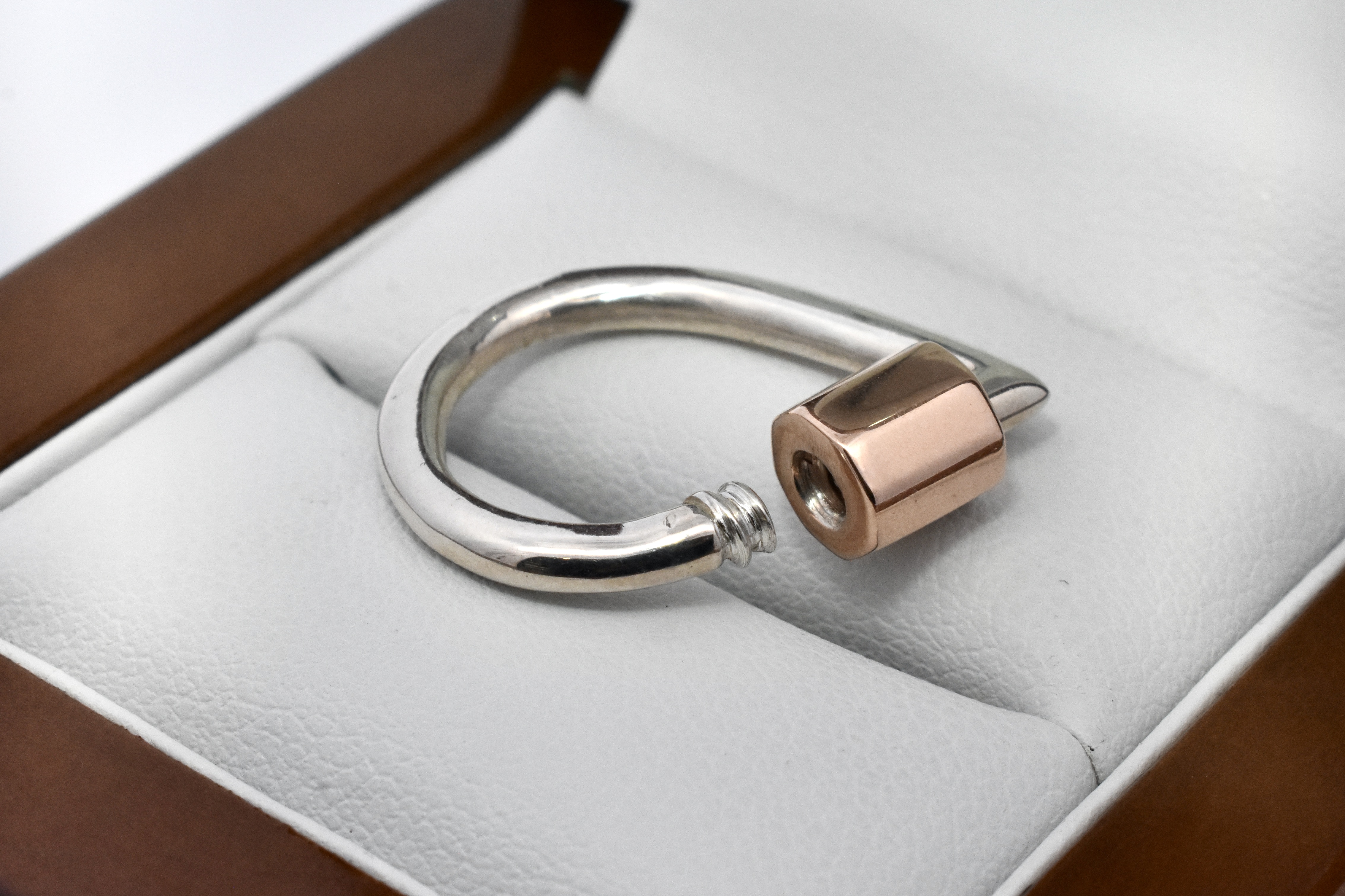 A contemporary and stylish statement accessory, this teardrop shape carabiner is crafted in sterling silver and 9ct rose gold and has been designed as a multipurpose piece which can act primarily as a clasp but also as a linking or extending accessory; to hang a pendant or enhancer from or even be a pendant itself. Pair it with a silver chain for continuity or rose gold for a bold contrast. Carabiner measures approx. 25 x 20mm