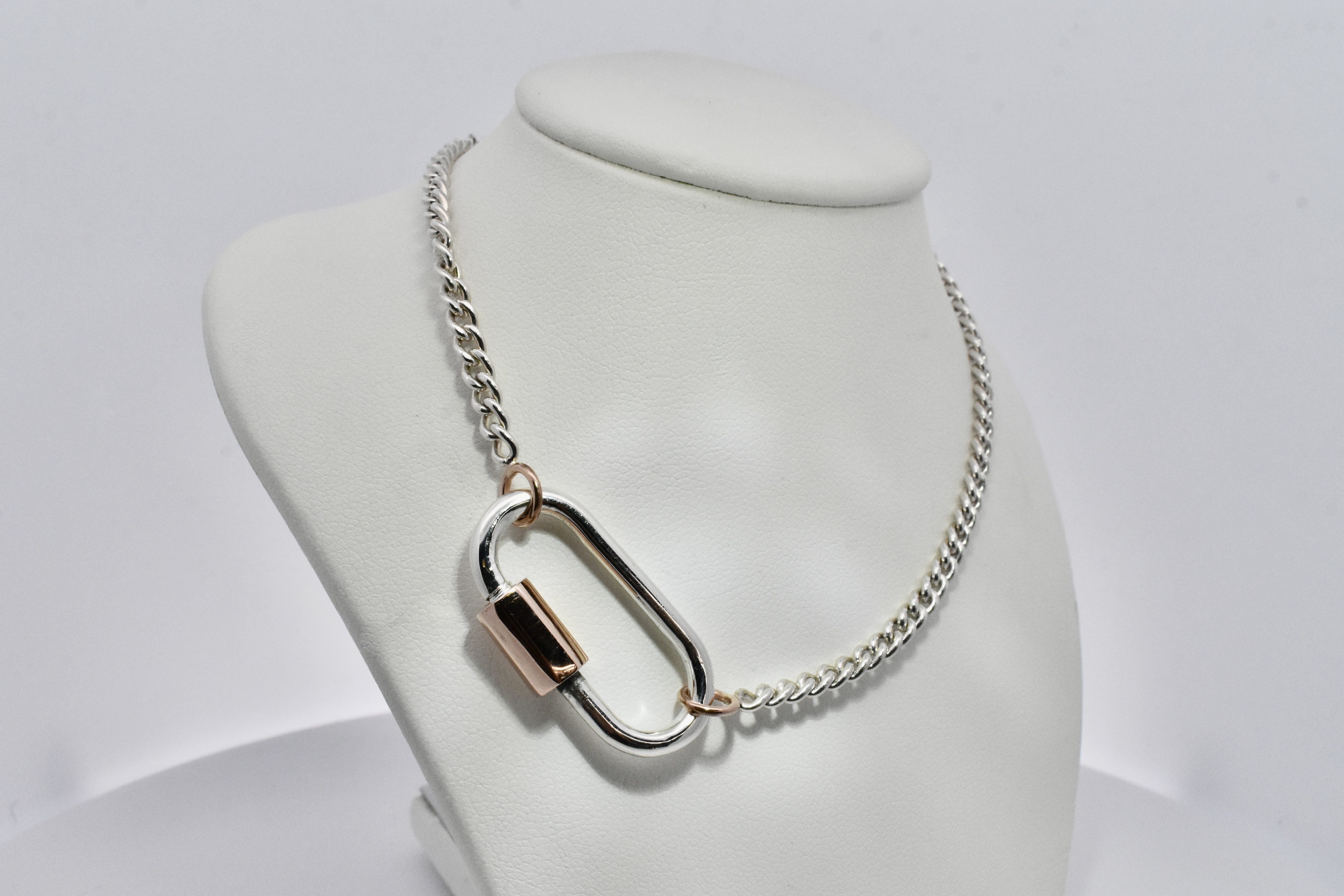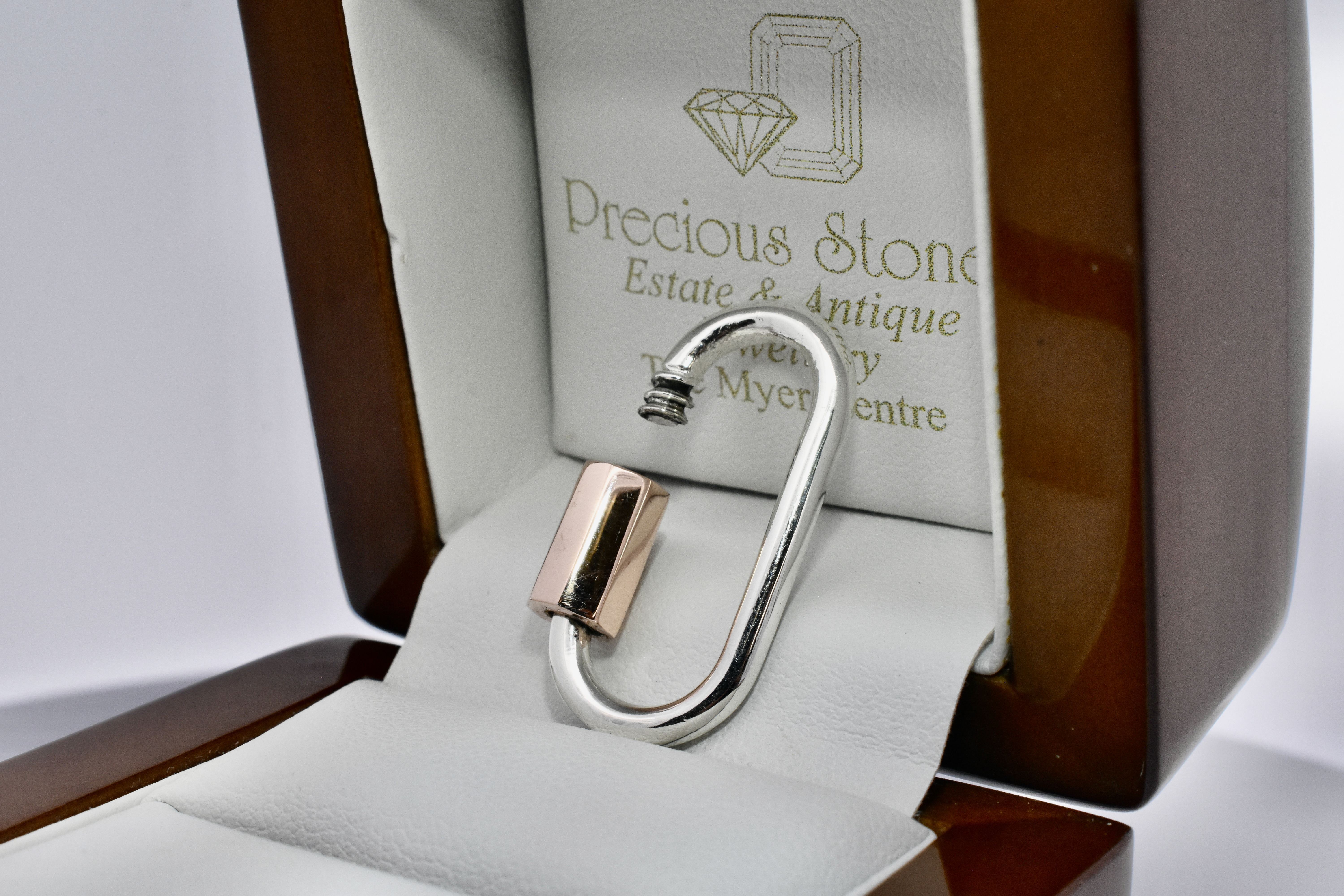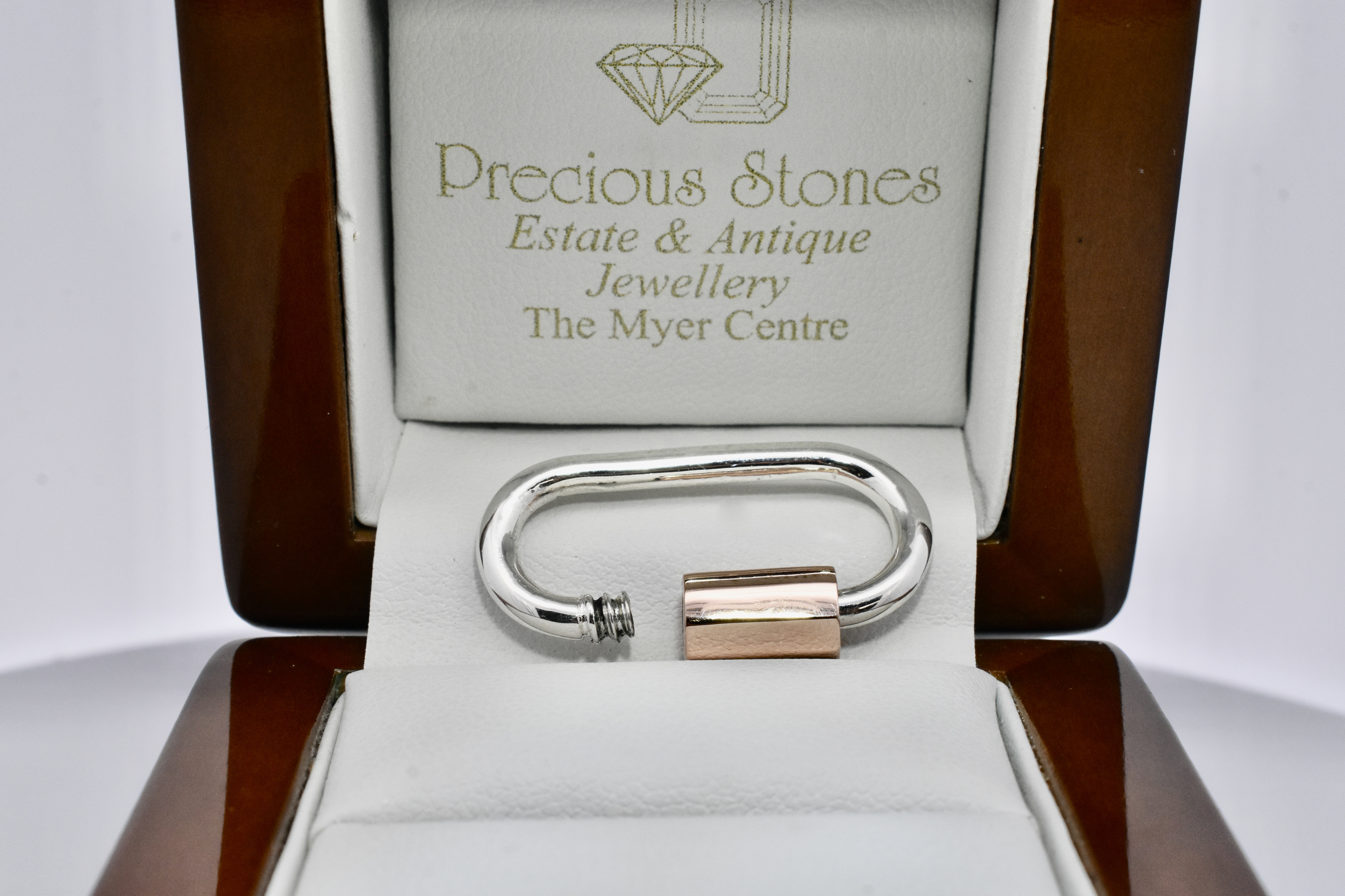 A contemporary and stylish statement accessory, this elongated oval shape carabiner is crafted in sterling silver and 9ct rose gold and has been designed as a multipurpose piece which can act primarily as a clasp but also as a linking or extending accessory; to hang a pendant or enhancer from or even be a pendant itself. Pair it with a silver chain for continuity or rose gold for a bold contrast. Carabiner measures approx. 25 x 20mm