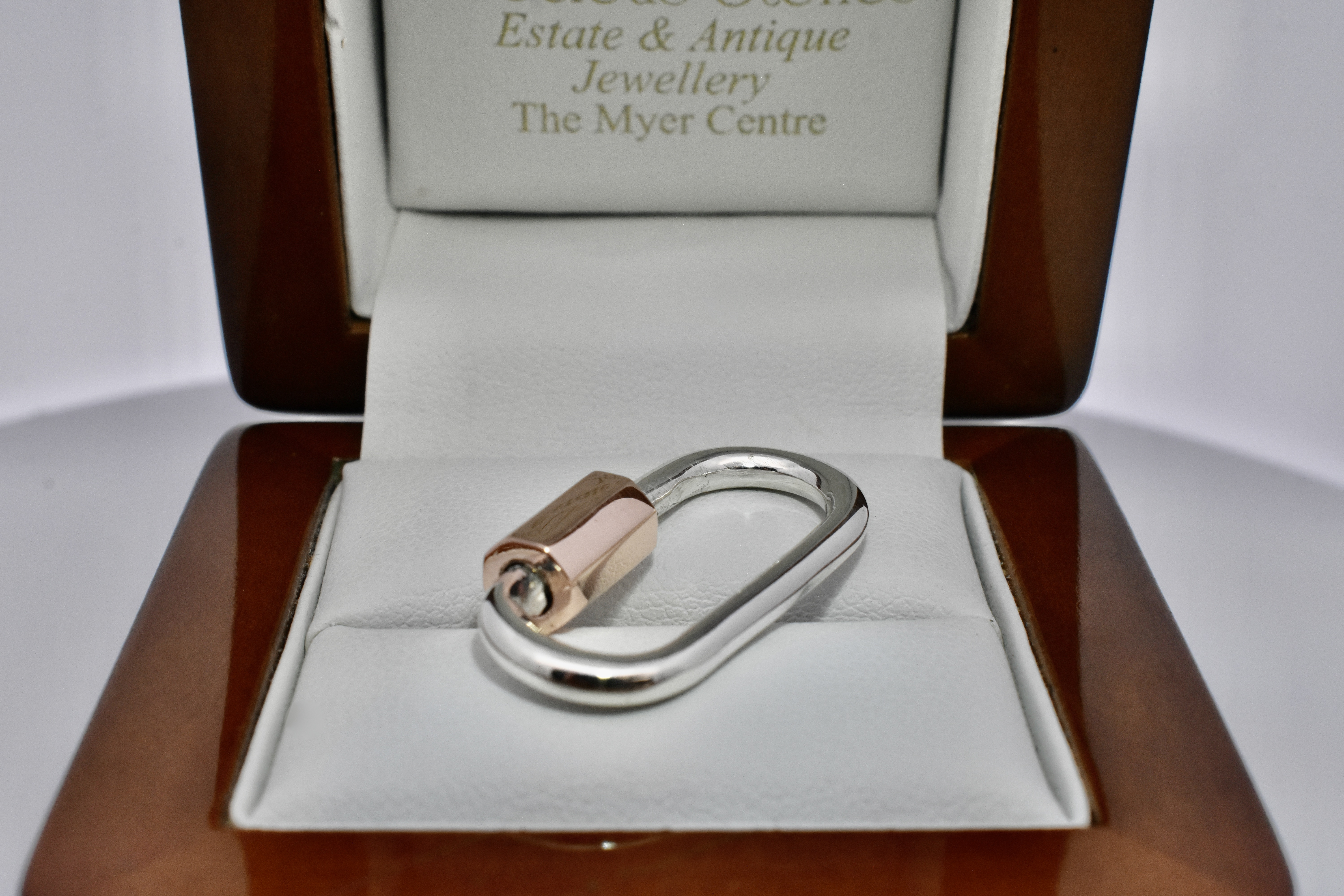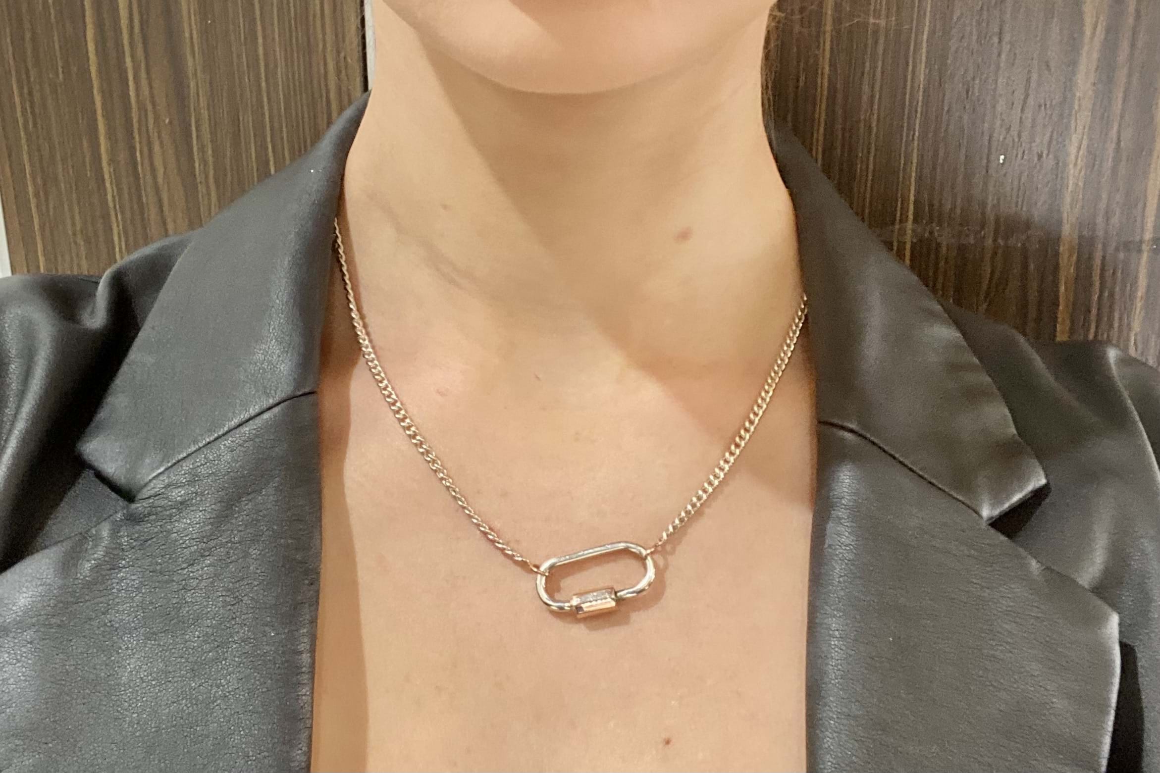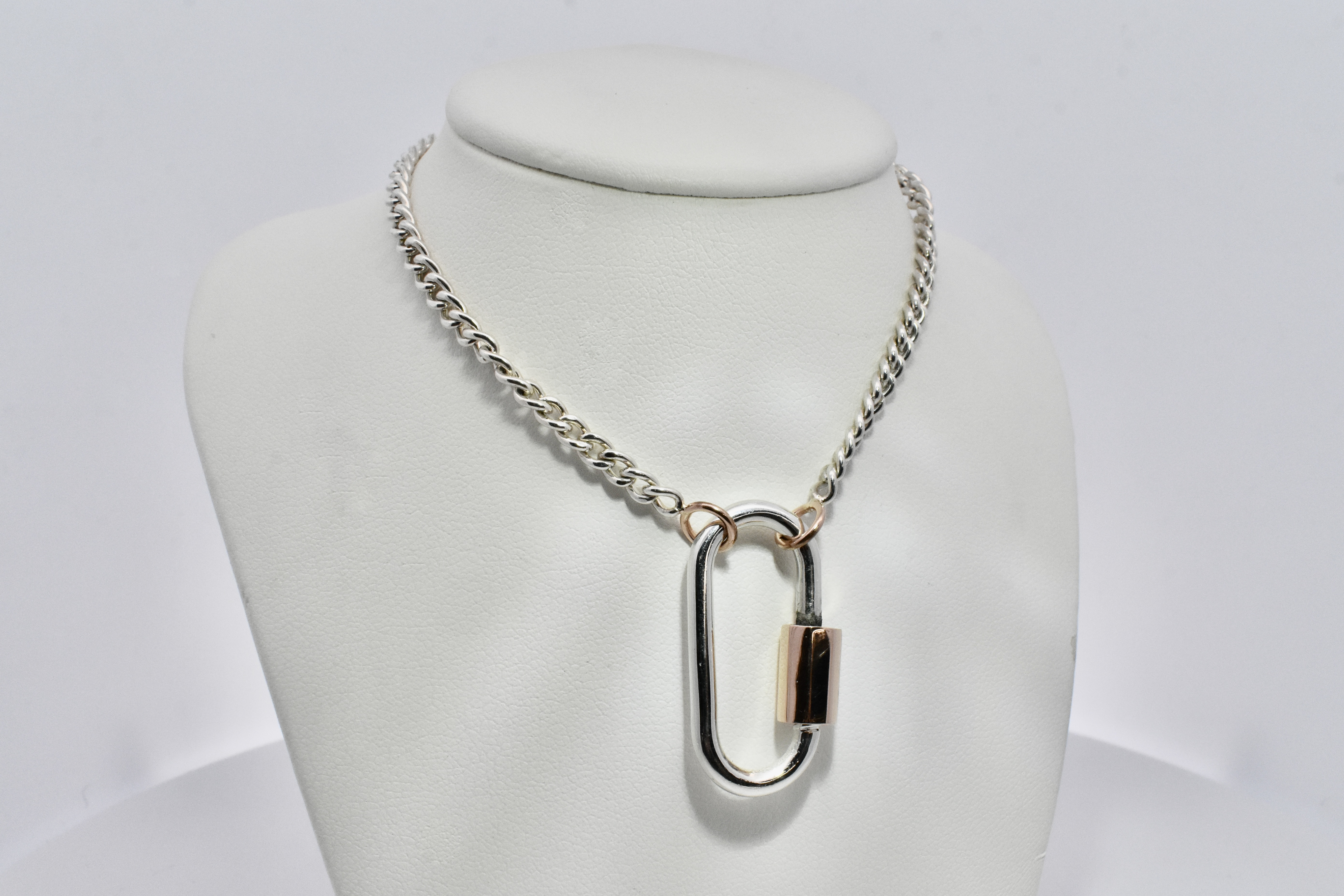 A contemporary and stylish statement accessory, this elongated oval shape carabiner is crafted in sterling silver and 9ct rose gold and has been designed as a multipurpose piece which can act primarily as a clasp but also as a linking or extending accessory; to hang a pendant or enhancer from or even be a pendant itself. Pair it with a silver chain for continuity or rose gold for a bold contrast. Carabiner measures approx. 25 x 20mm